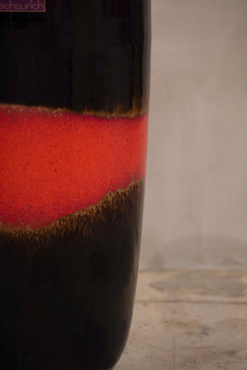 鮮やかな赤の釉薬と深い黒のベースカラーのコントラストが非常に美しく、インテリアに強い存在感を放ちます。滴るようなグラデーションと艶のある仕上げが印象的で一点一点異なる釉薬の流れが見られ、ハンドメイドの温もりを感じる一品です。