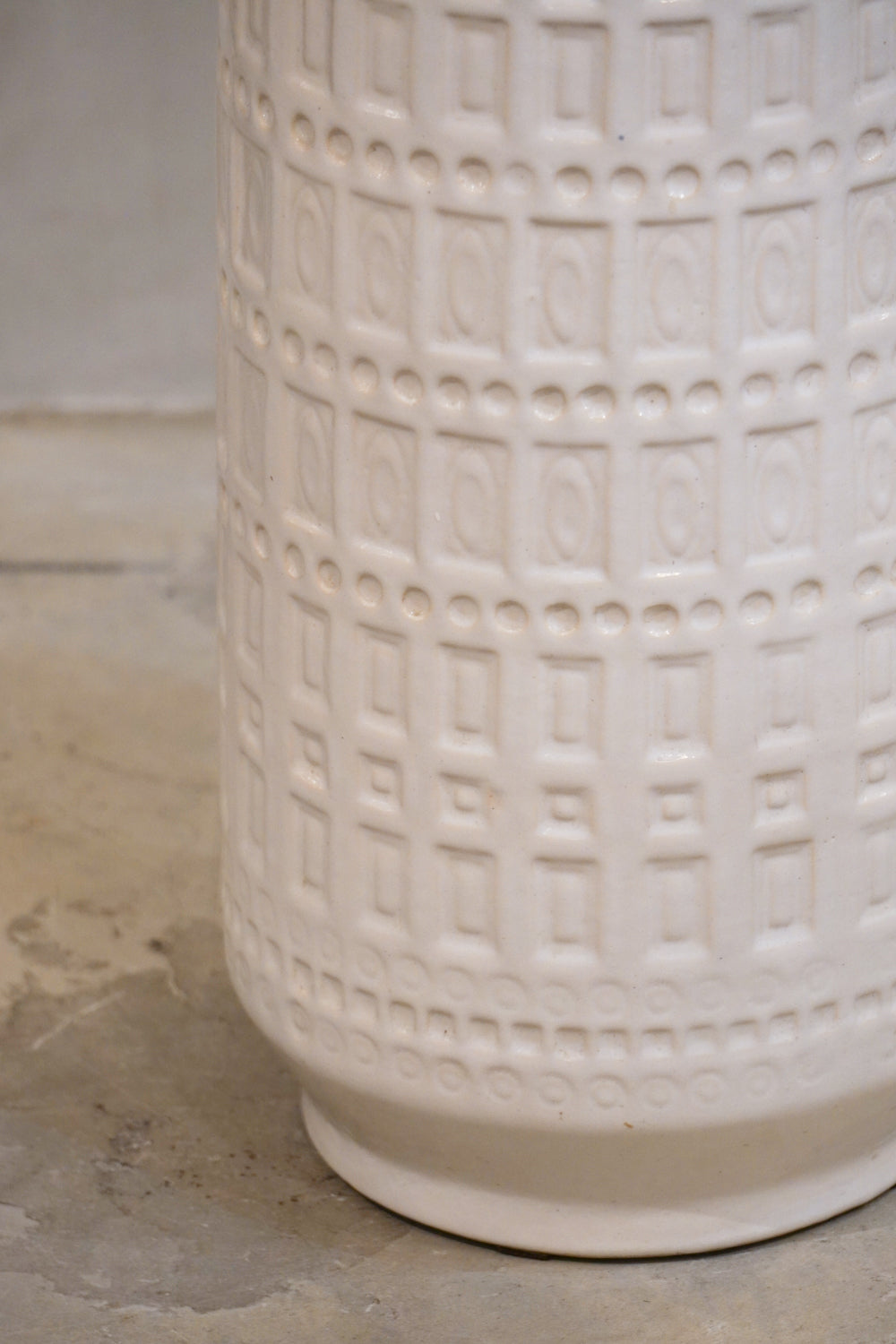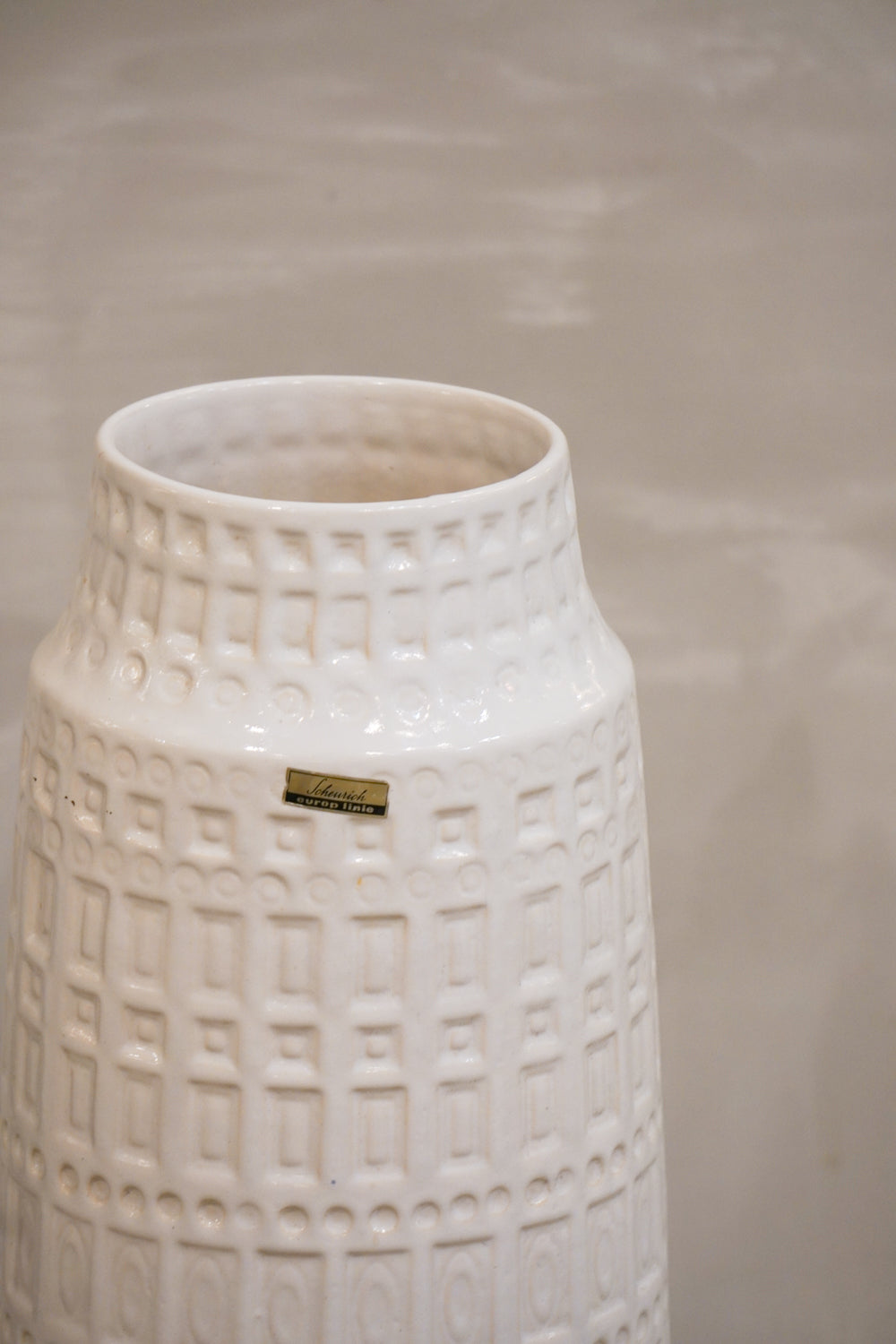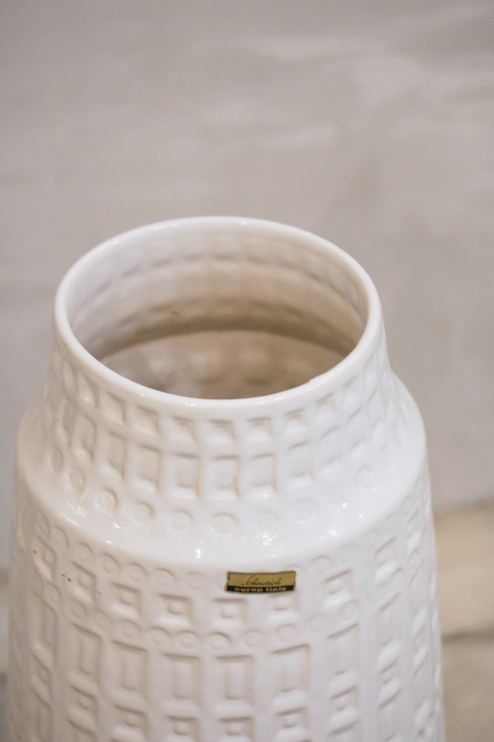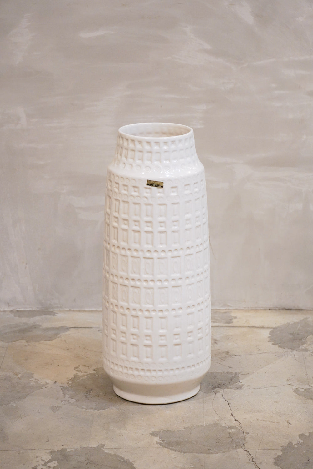 光沢のあるホワイトグレーズ(釉薬)でコーティングされ、幾何学模様のようなテクスチャがボディ全体を覆っています。この立体感のあるパターンは、光の当たり方によって表情を変え、インテリアに奥行きを与えます。Scheurichらしいモダンでリズミカルなデザインが特徴。