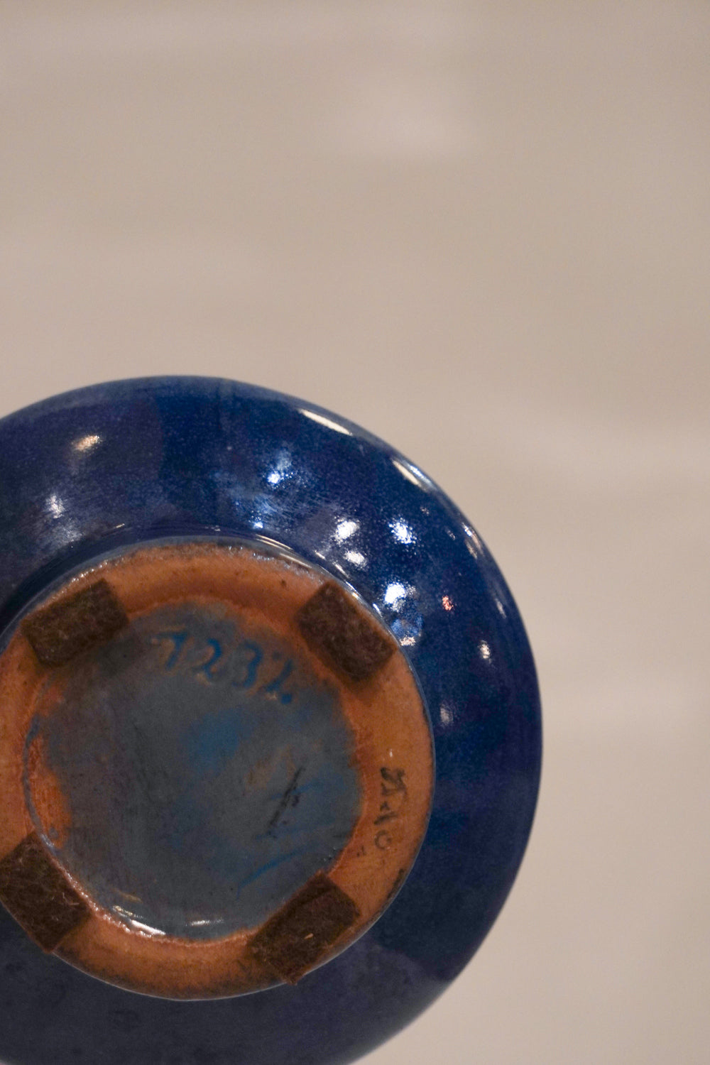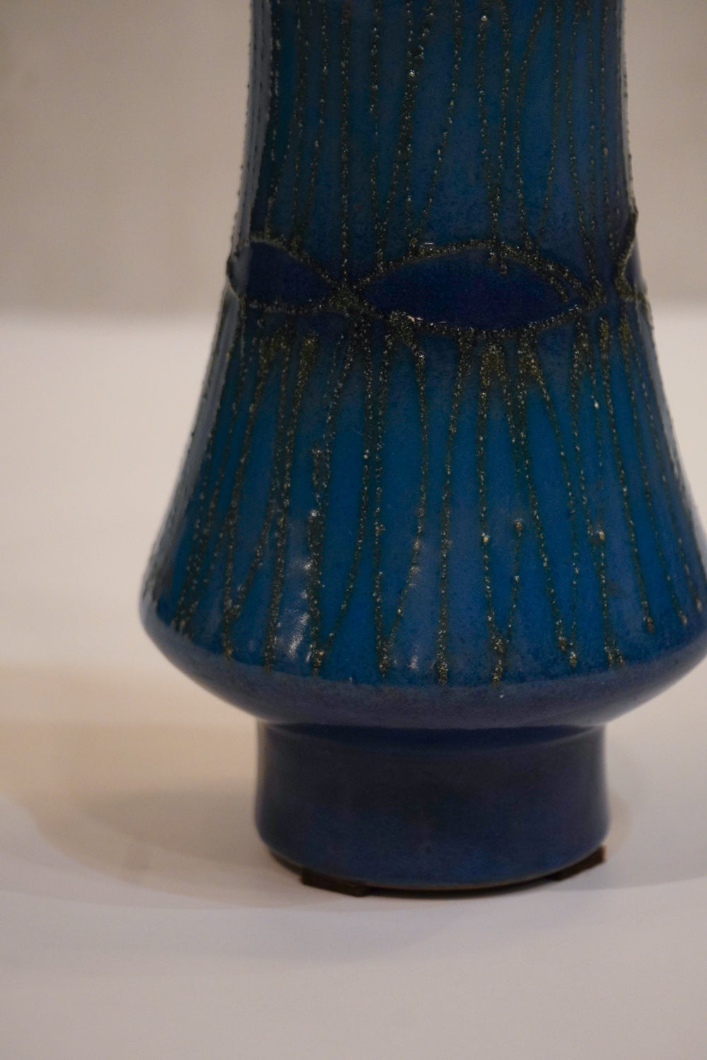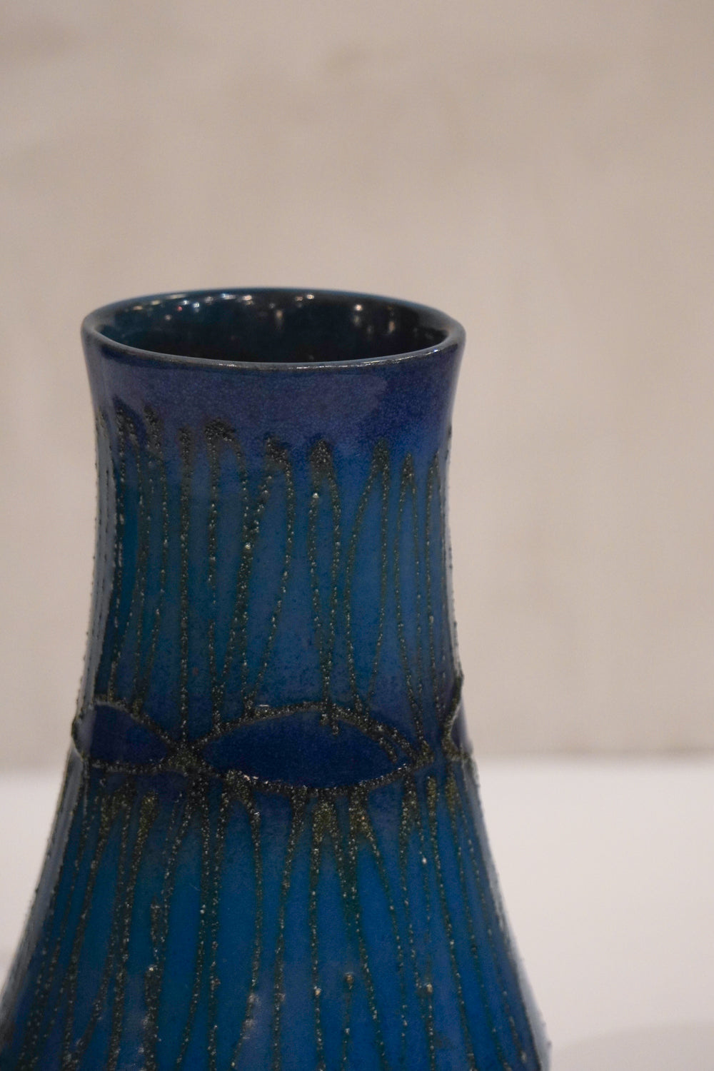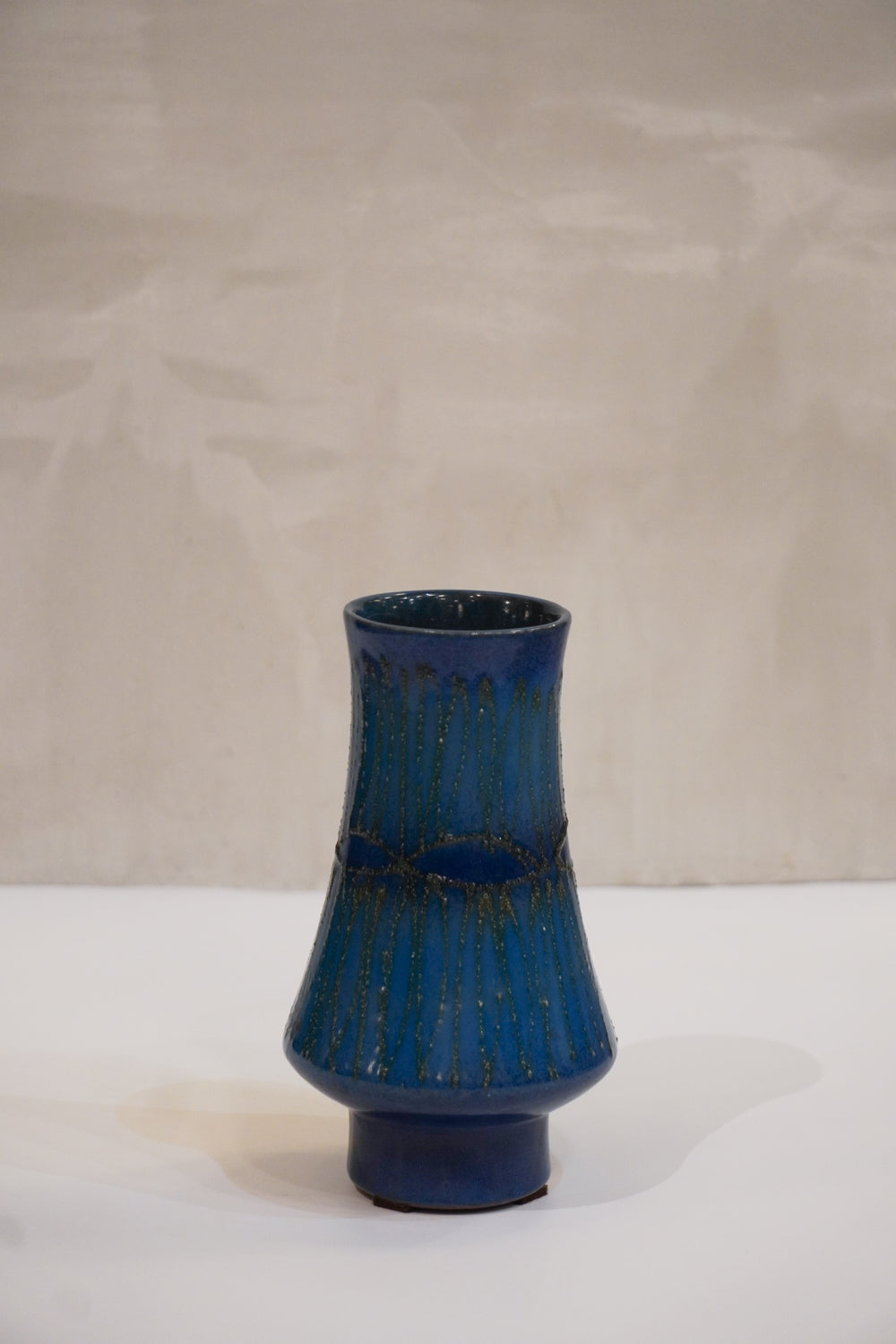 モダンな造形美が特徴のヴィンテージ花瓶です。艶のあるブルーグレーベースに、立体的で有機的なテクスチャーが施され、光の角度で表情を変えるユニークな仕上がり。流れるような垂れ釉の模様が特徴的で、1点もののアートピースとしてもおすすめです。