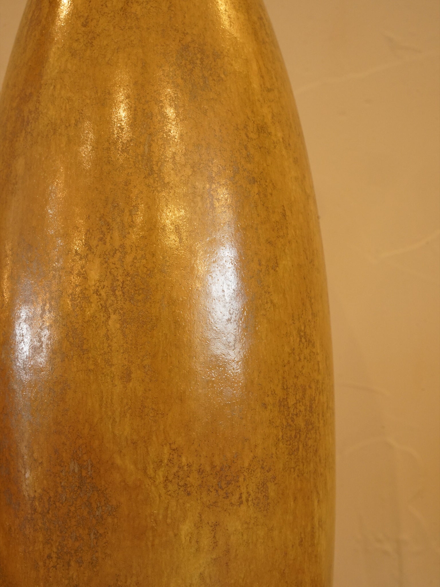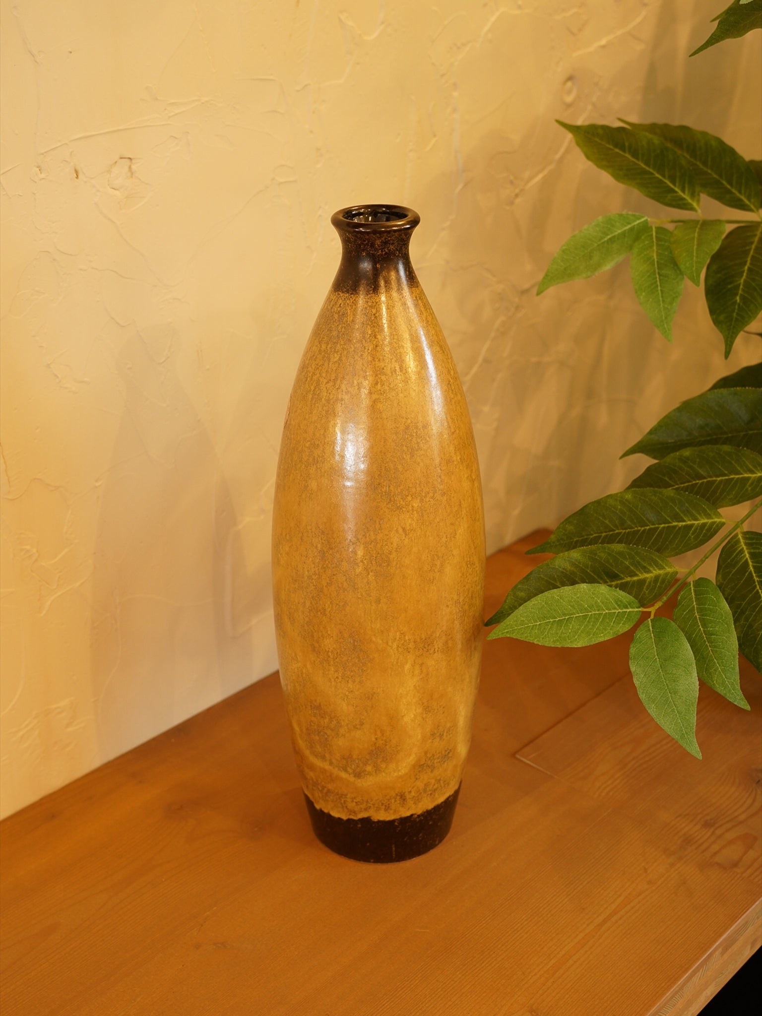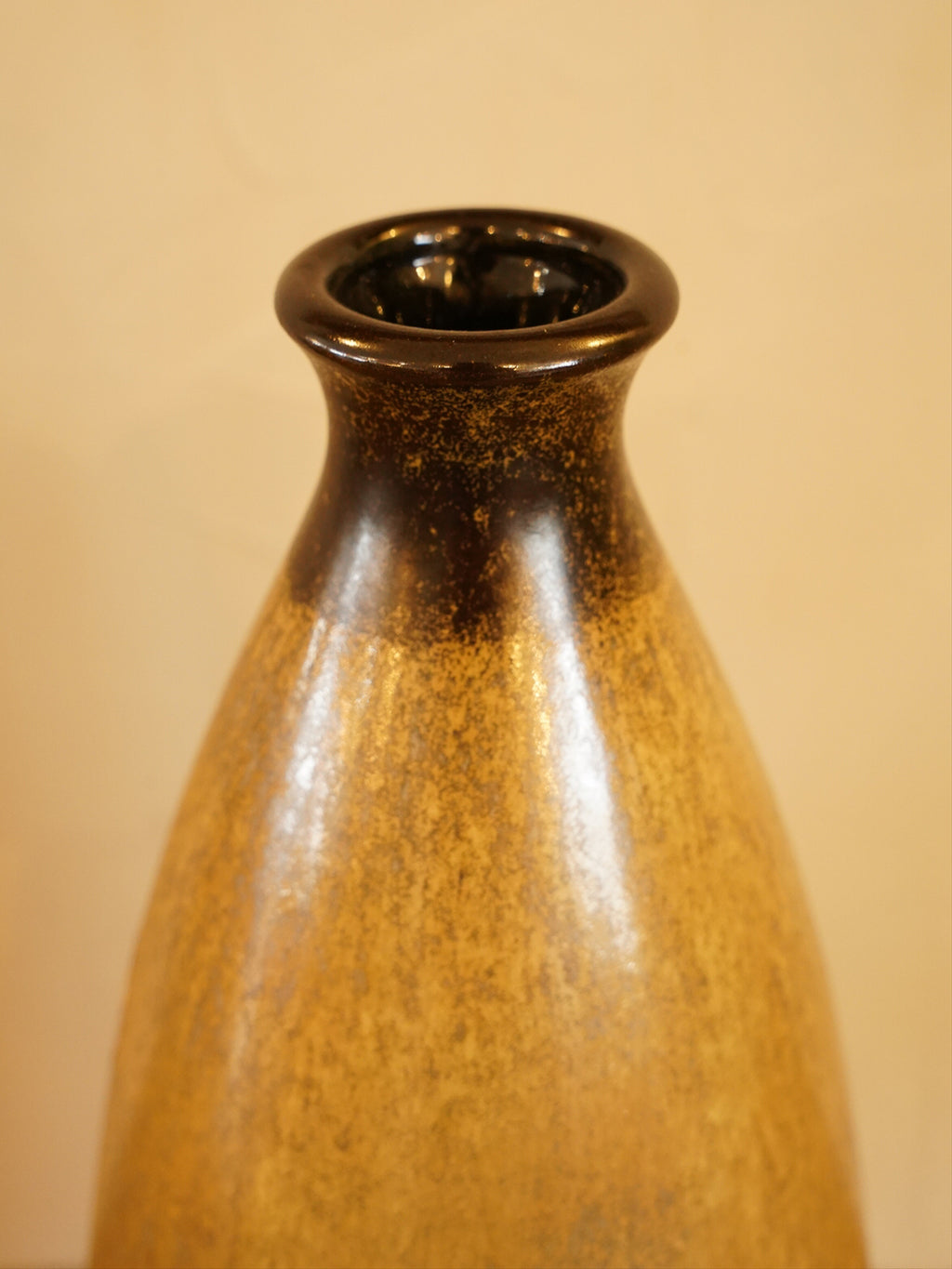 細身でエッグ型のエレガントなボトルフォルムは、インテリアとして圧倒的な存在感を放ちます。釉薬は光沢のあるグロス仕上げで、ミッドセンチュリーらしい温かみのあるカラーリングです。