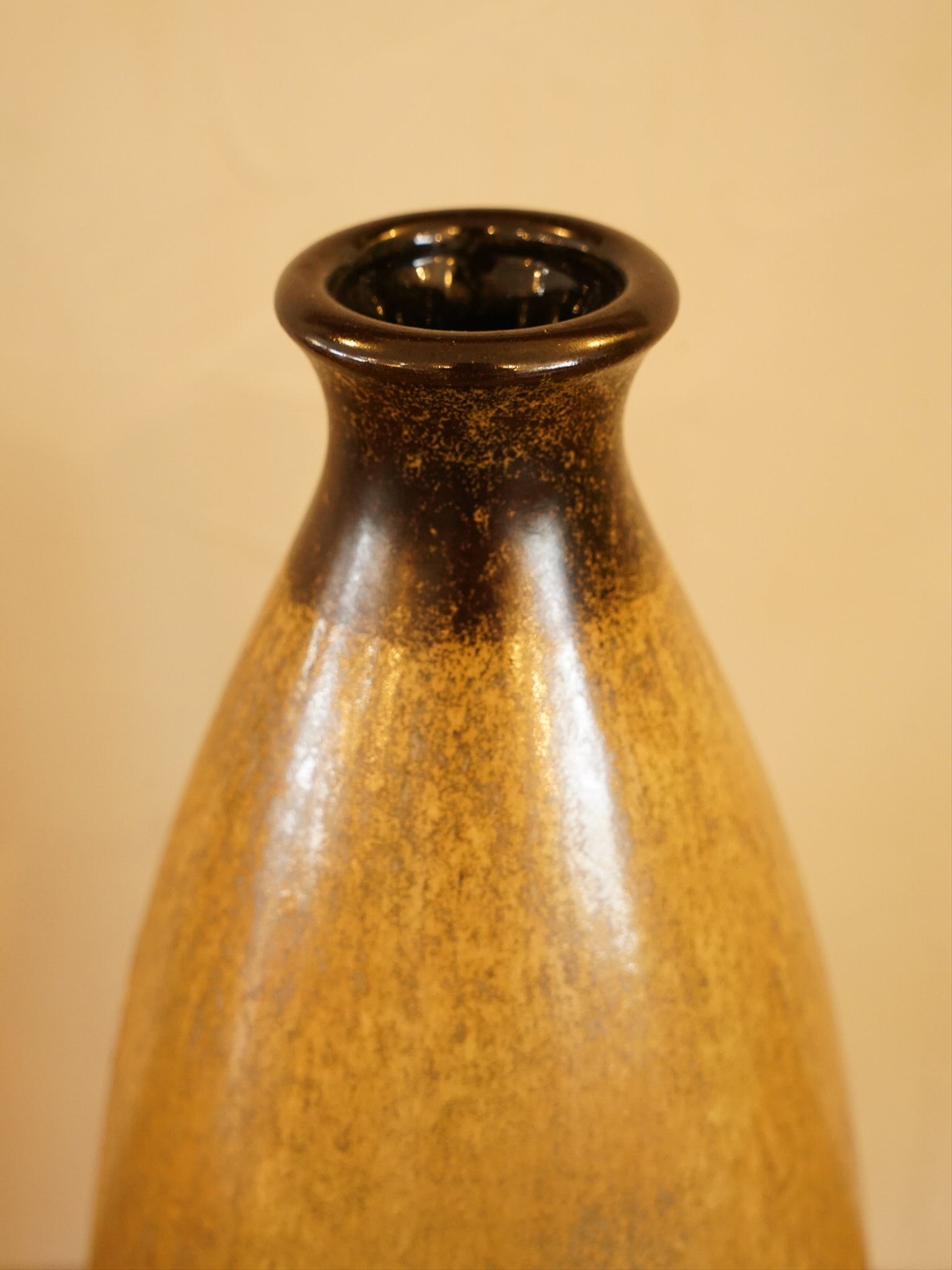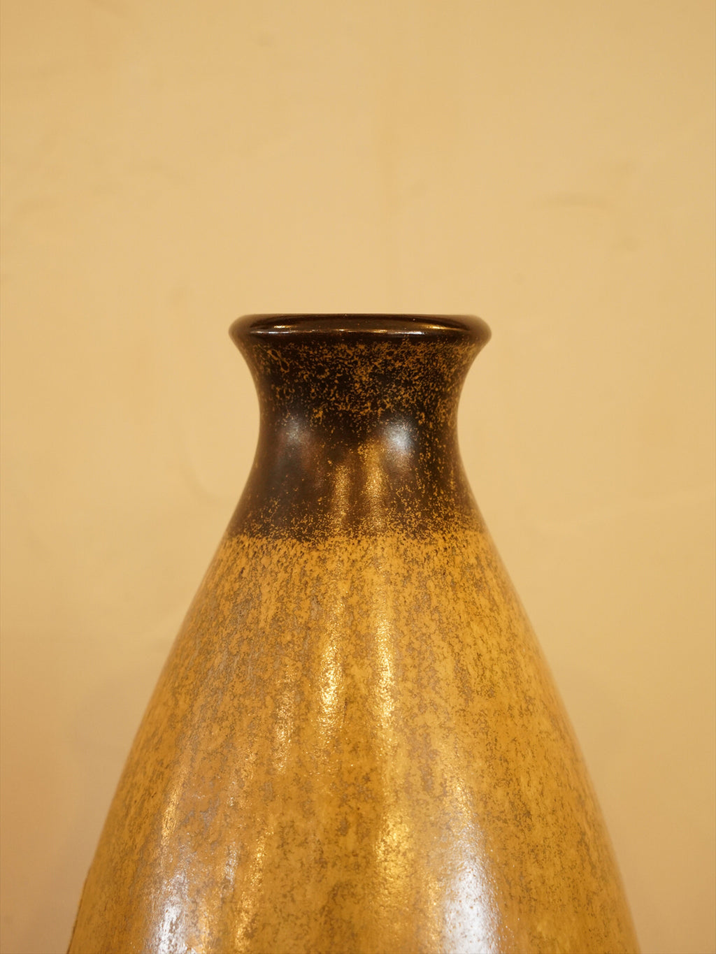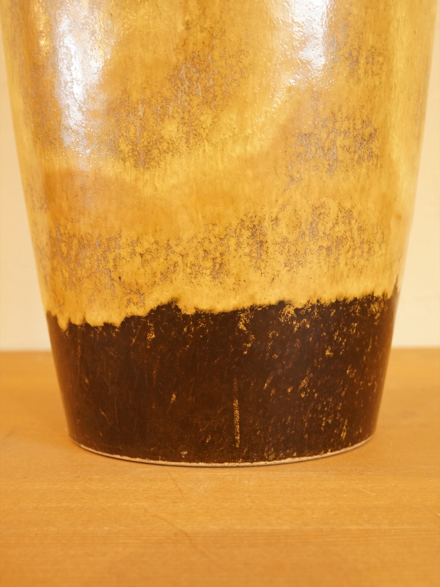 上部と底部は深いダークブラウンで引き締められ、中央部分には暖かなマスタードイエローやアンバーの色調が、まるで炎や溶岩が流れるように力強く混ざり合っています。落ち着いたアースカラーでありながら、釉薬のダイナミックな流れがアートピースとしての魅力を際立たせています。