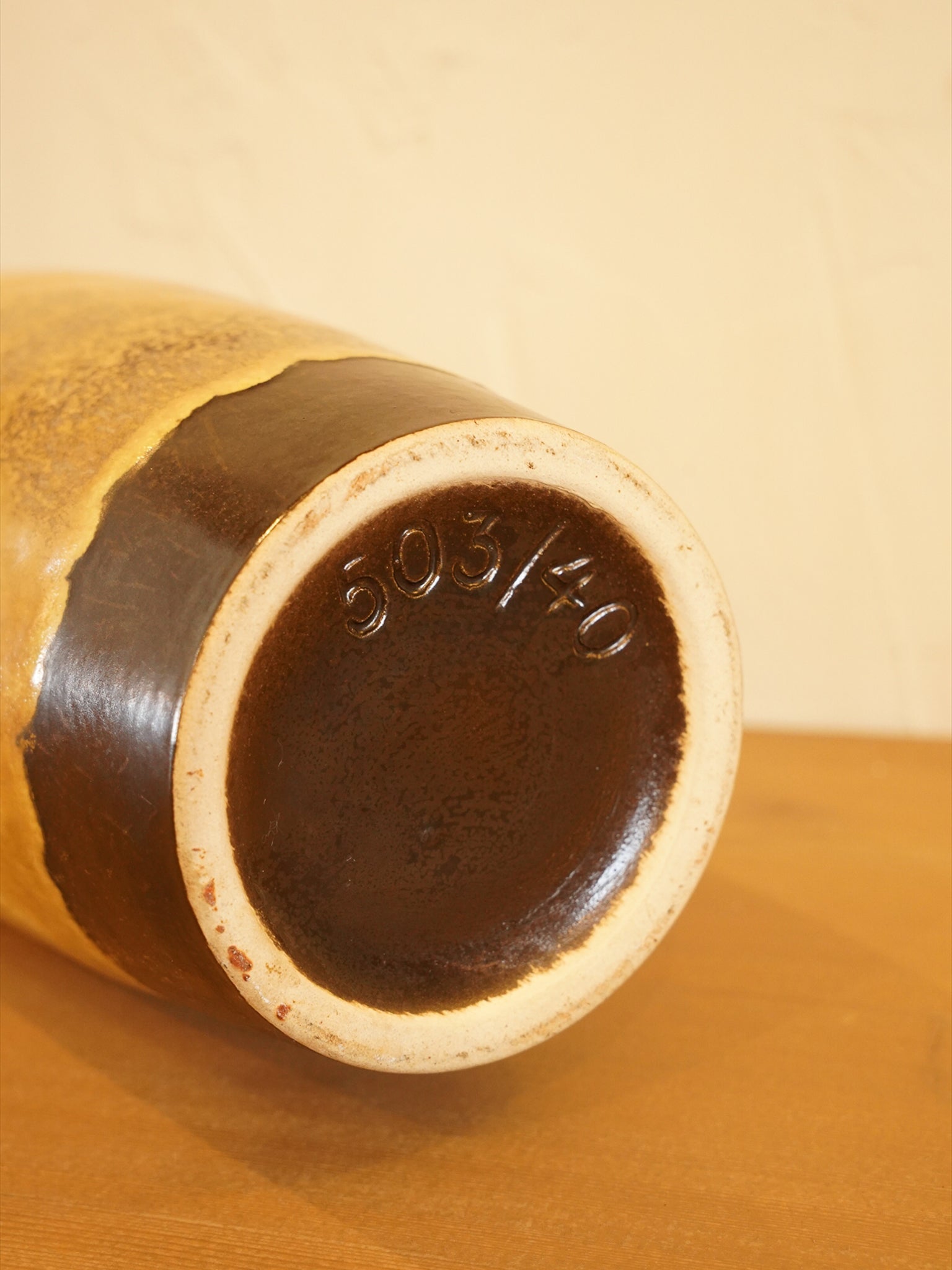 西ドイツ陶器の最盛期を築いた最大手メーカー、Scheurich製のフラワーベースです。底面の刻印「503/40」は、フォルム番号503、高さ約40cmというサイズを示しています。