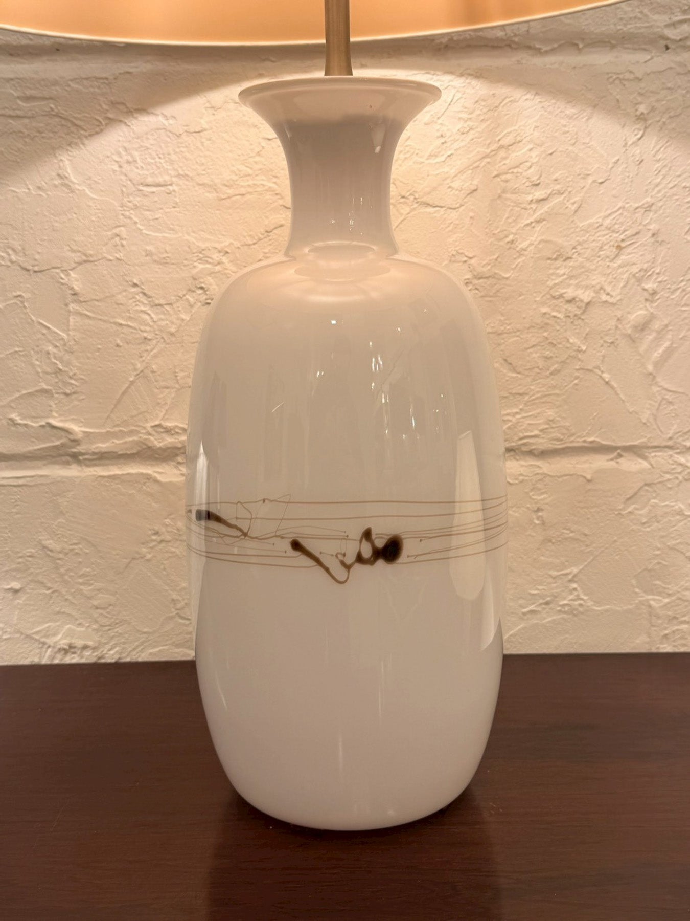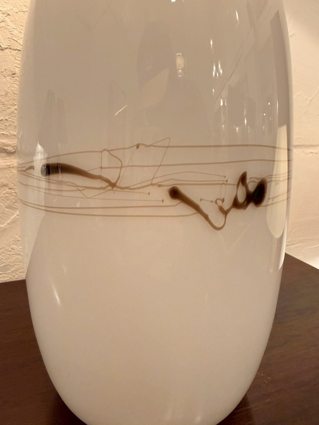 ベースはやわらかな曲線を描くボトルフォルム。艶のある乳白色ガラスの中央には、繊細なラインと抽象的なモチーフが控えめにあしらわれており、シンプルな中にさりげない個性を感じさせます。クリーンで軽やかな印象は、北欧デザインらしい洗練と温かみを兼ね備えたものです。