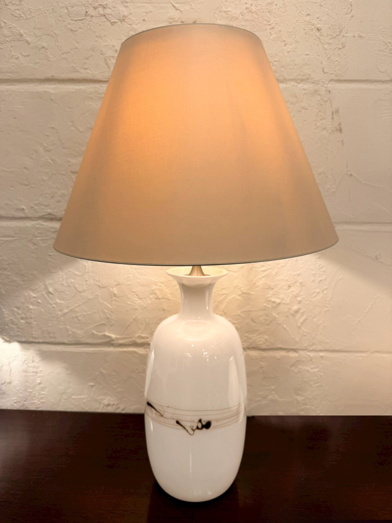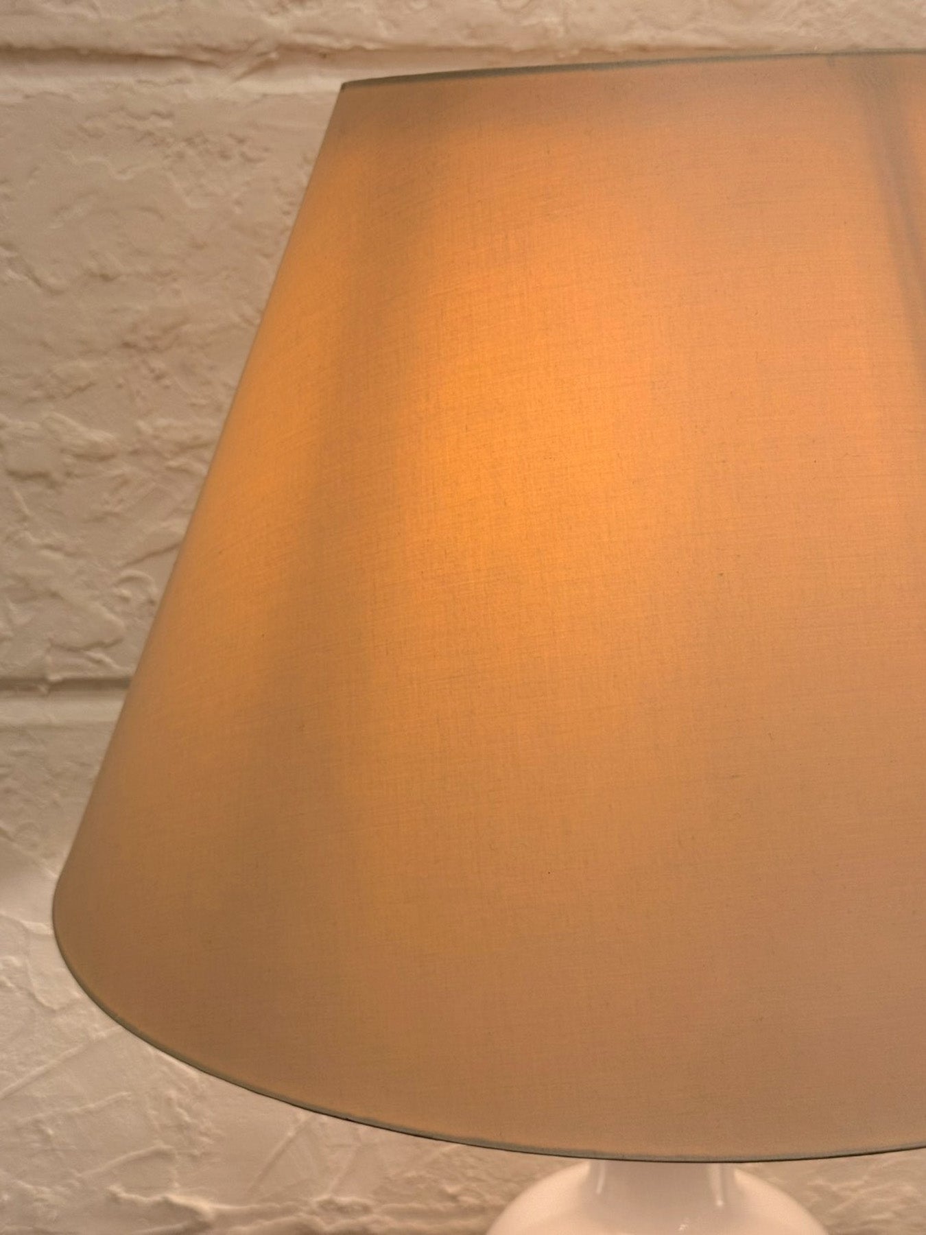 ナチュラルカラーのファブリックシェードから広がる光はやわらかく、空間全体を穏やかな雰囲気で包み込みます。ガラスベース特有のなめらかな質感と光の相性も良く、点灯時にはより一層やさしい表情に。消灯時にもオブジェのような美しい存在感を楽しめます。