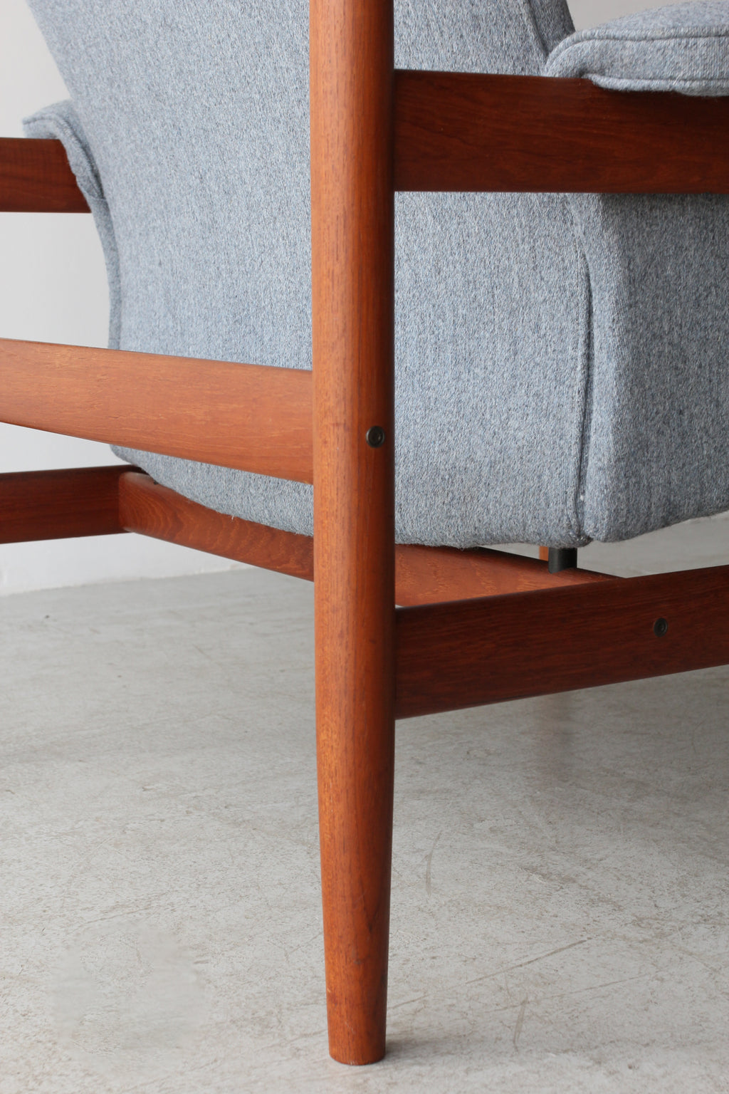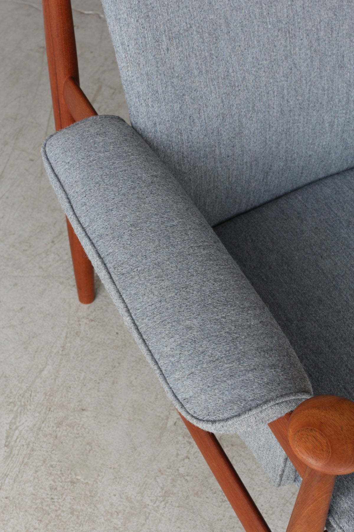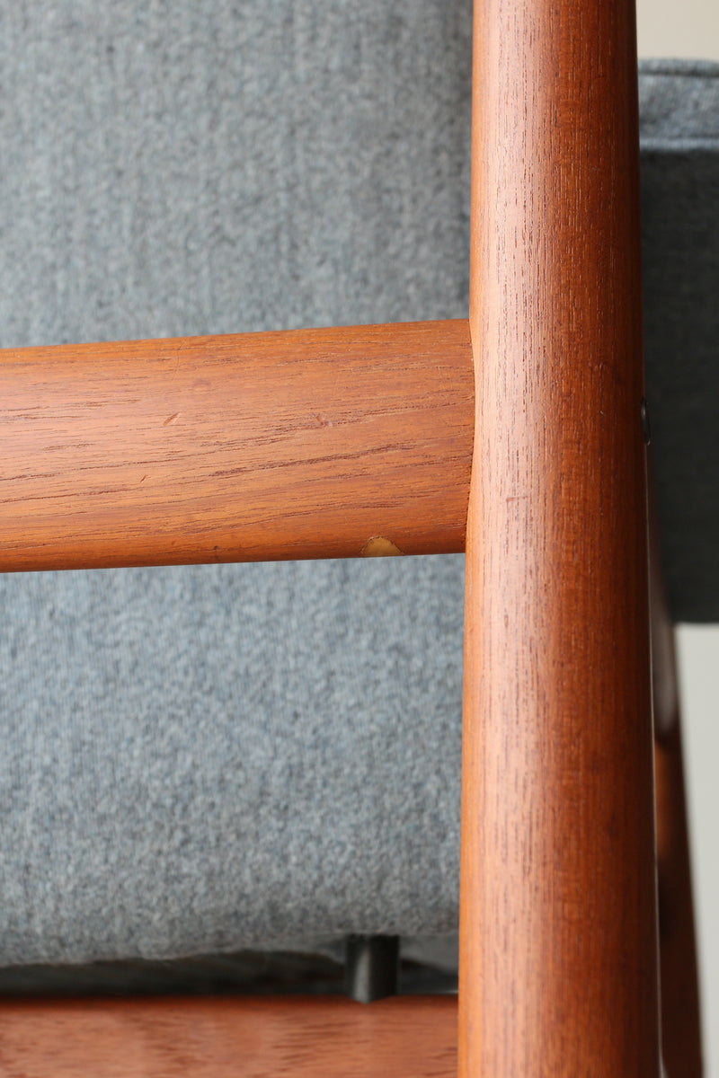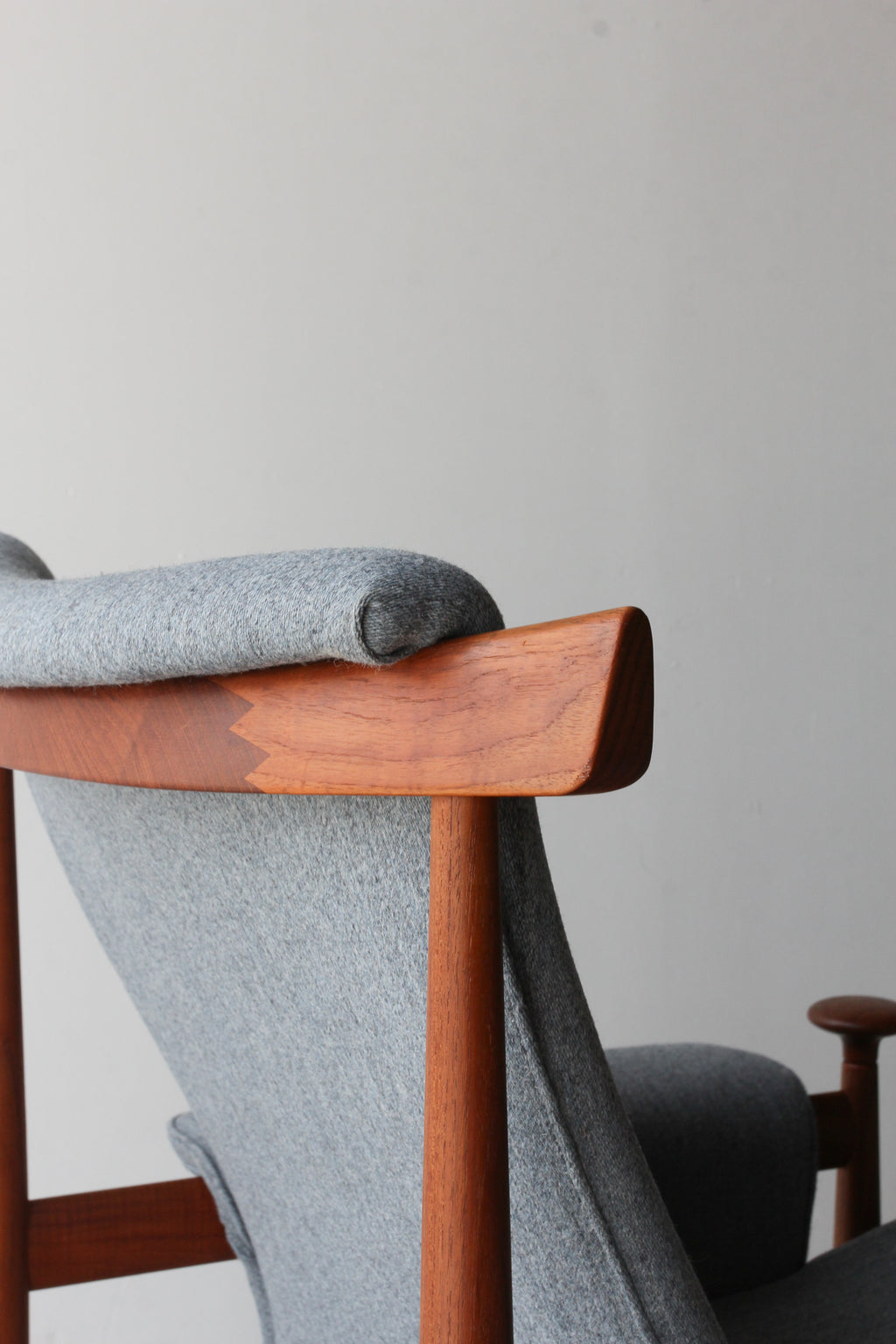 ヘッドレスト裏に横にわたっている笠木部分にはフィンガージョイントが採用されており、接合部の美しさに抜かりのない点はフィン・ユールの細部にこだわるクオリティを証明しています。