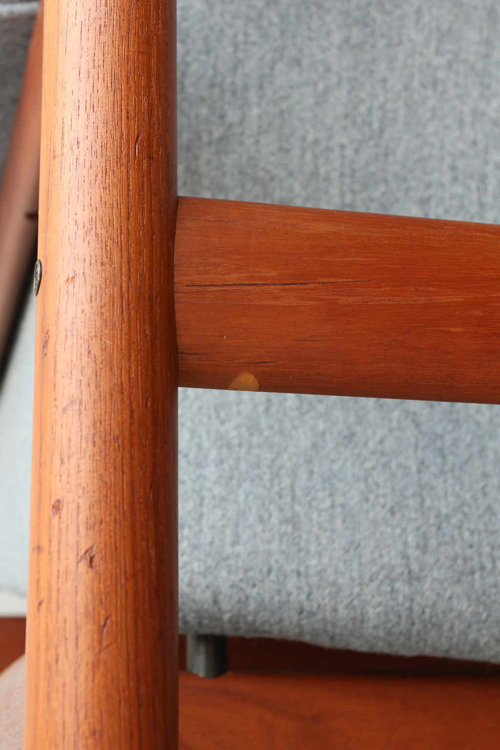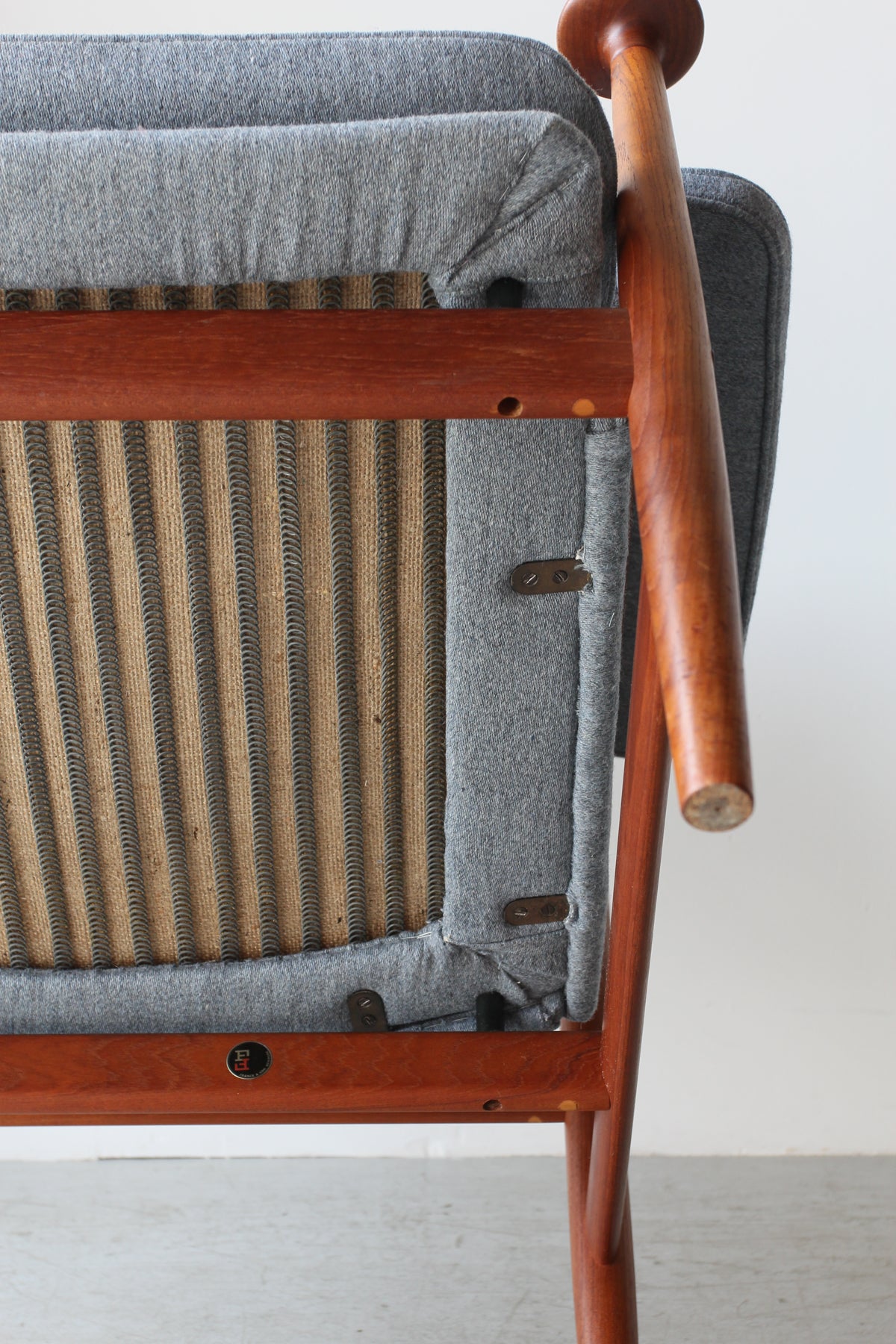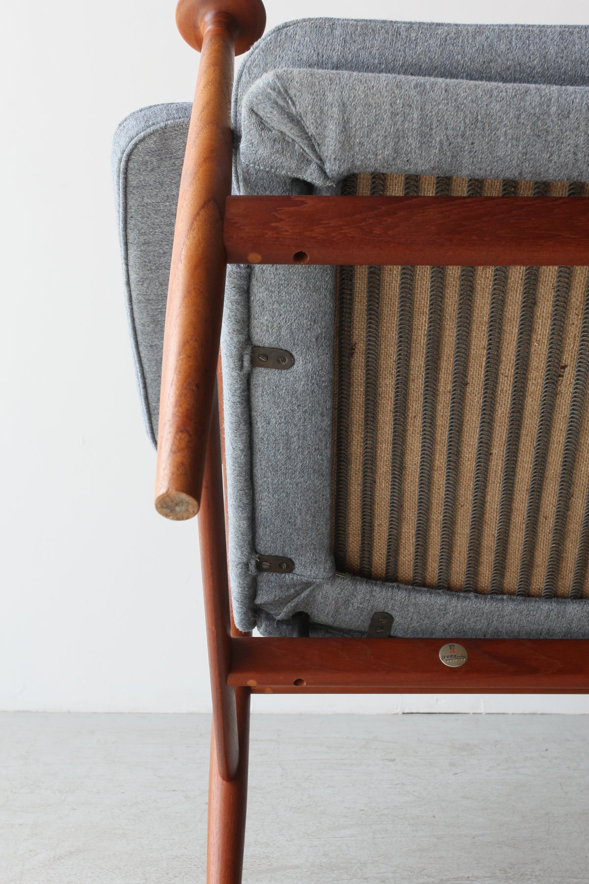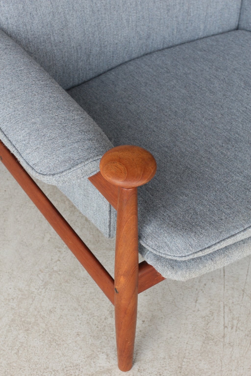 ヘッドレスト裏に横にわたっている笠木部分にはフィンガージョイントが採用されており、接合部の美しさに抜かりのない点はフィン・ユールの細部にこだわるクオリティを証明しています。