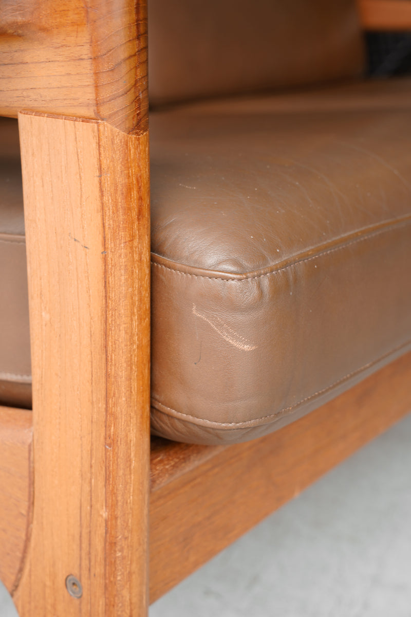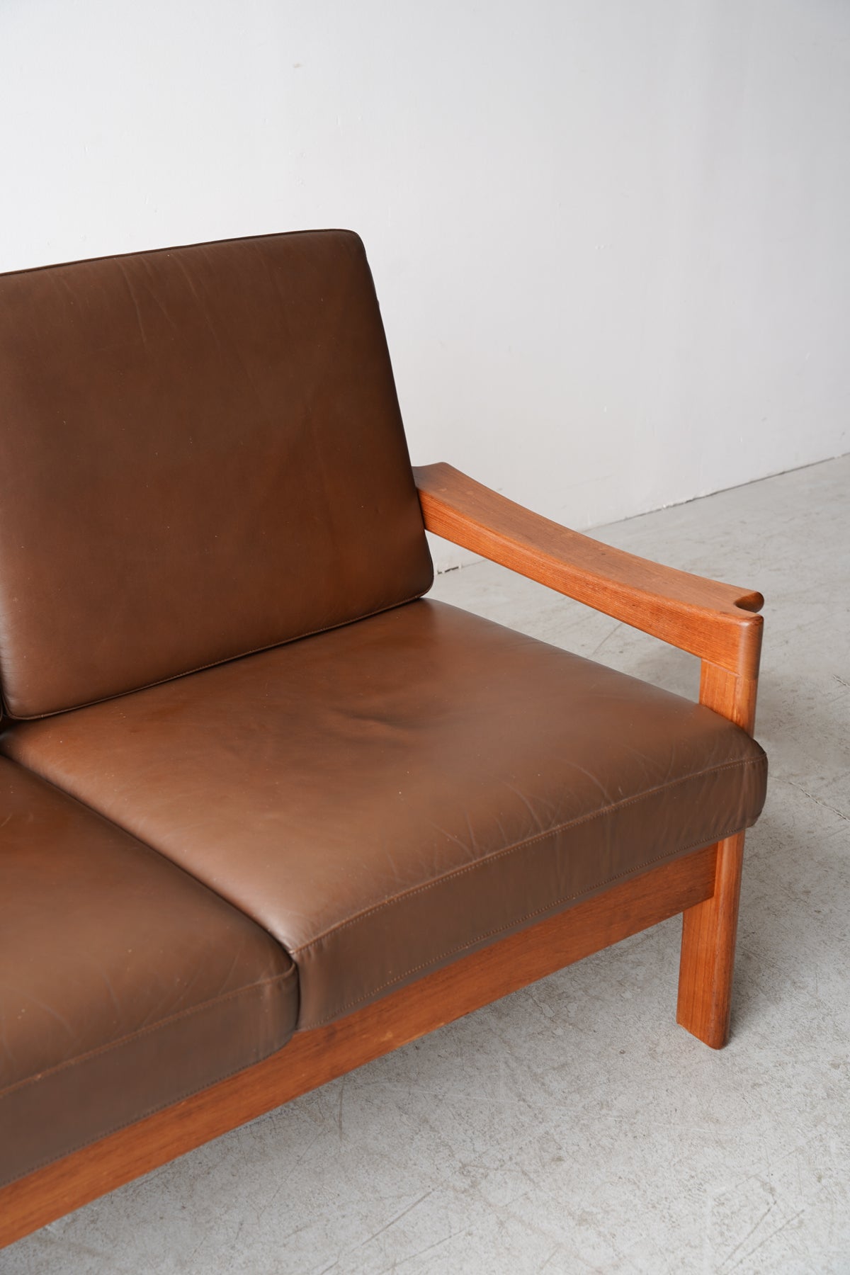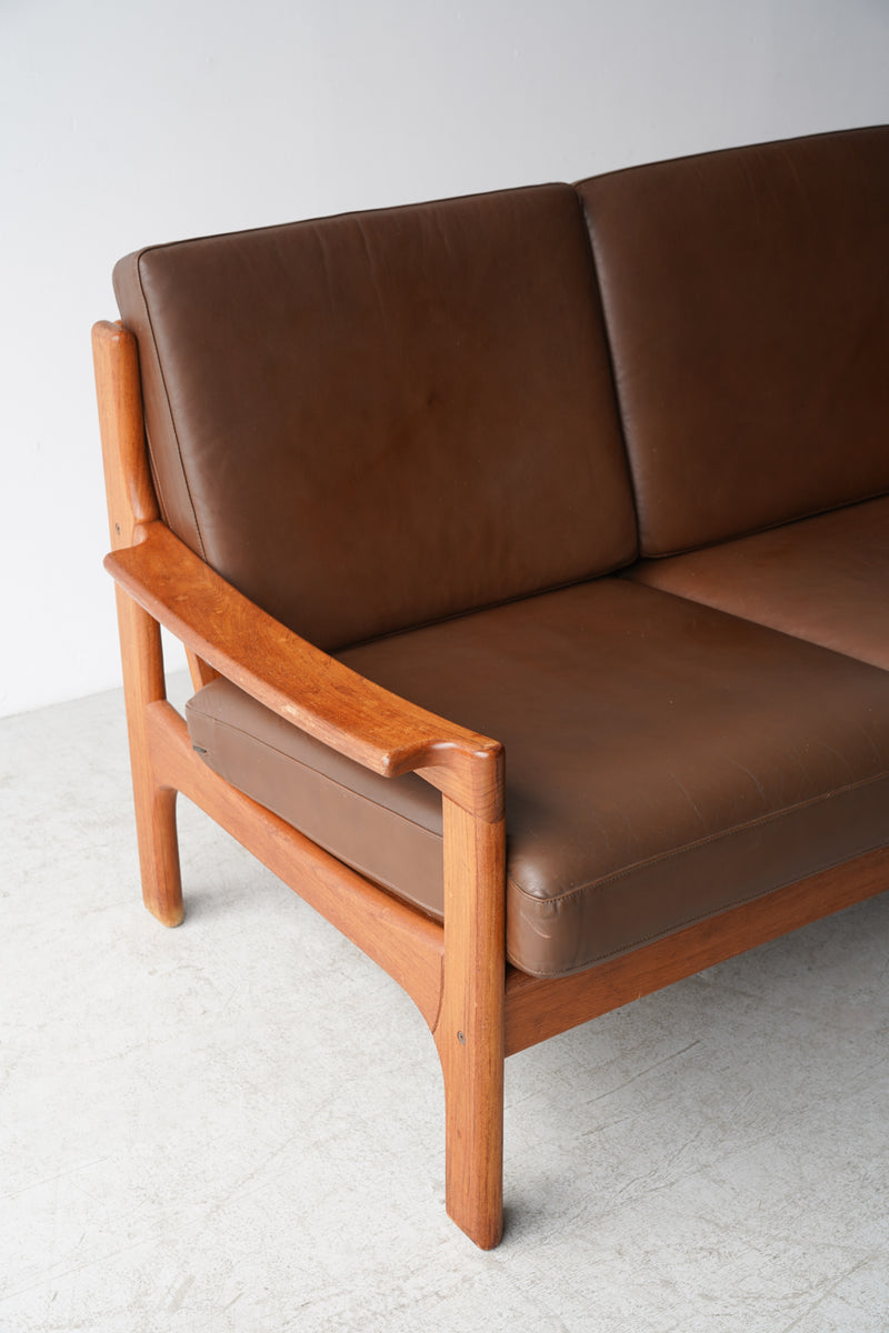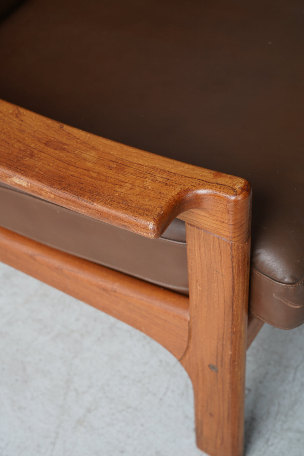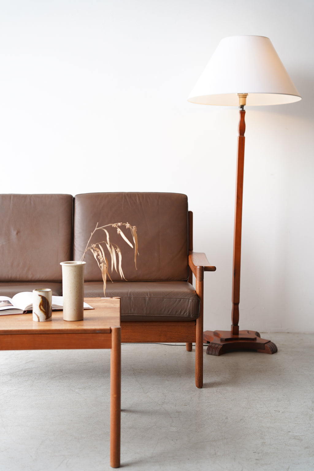 きめ細かいレザーの質感とウッドフレームを組み合わせたヴィンテージソファ。