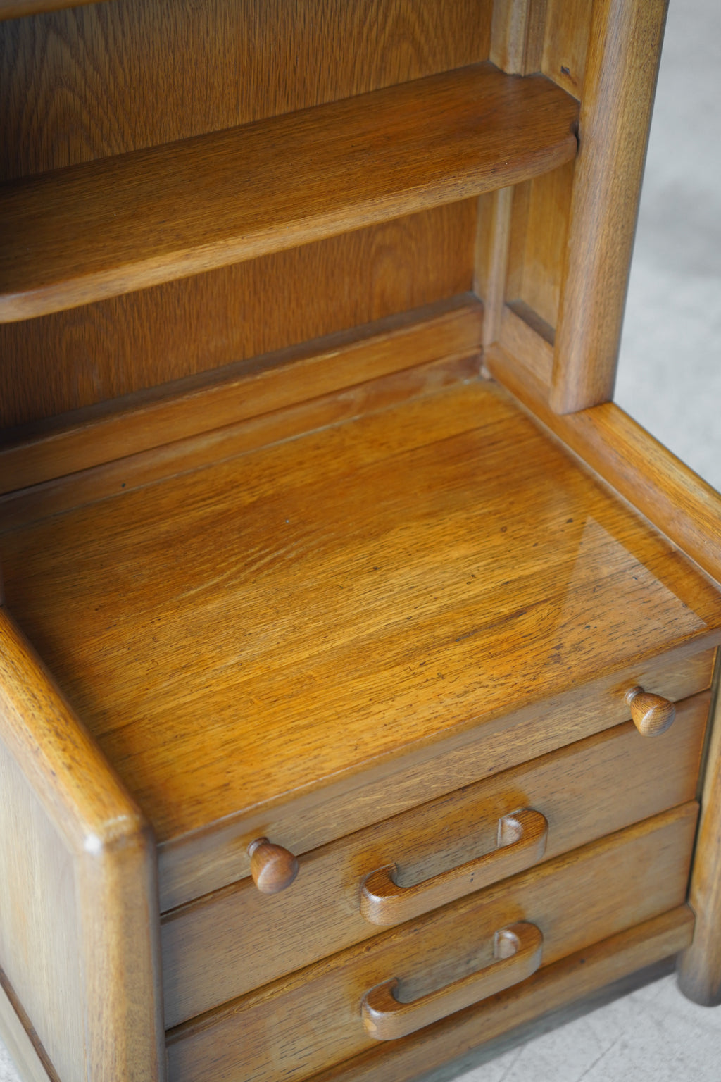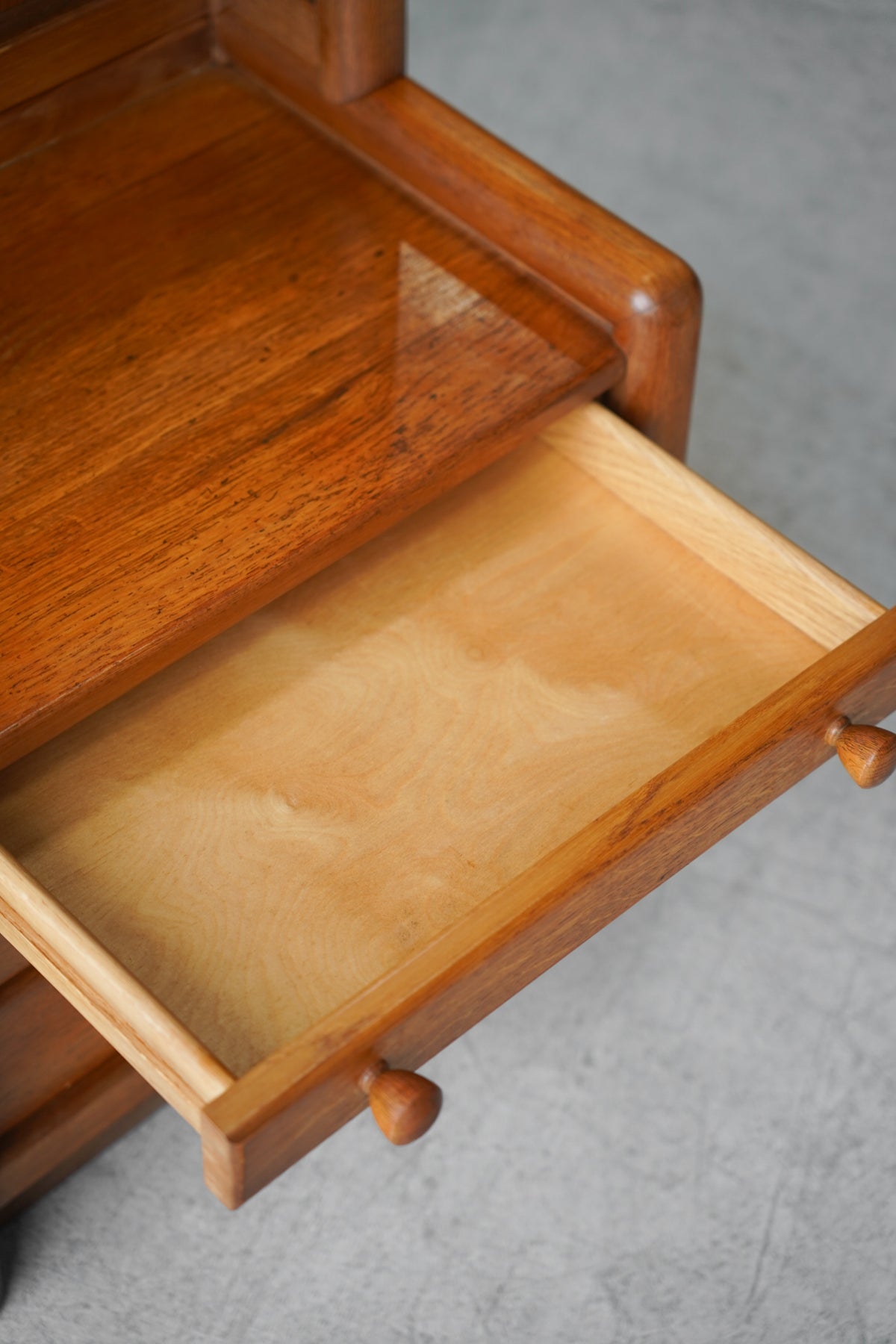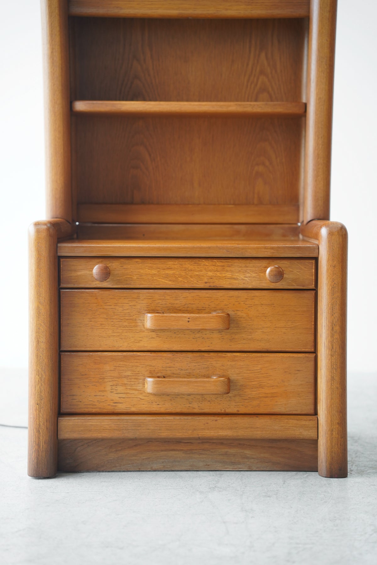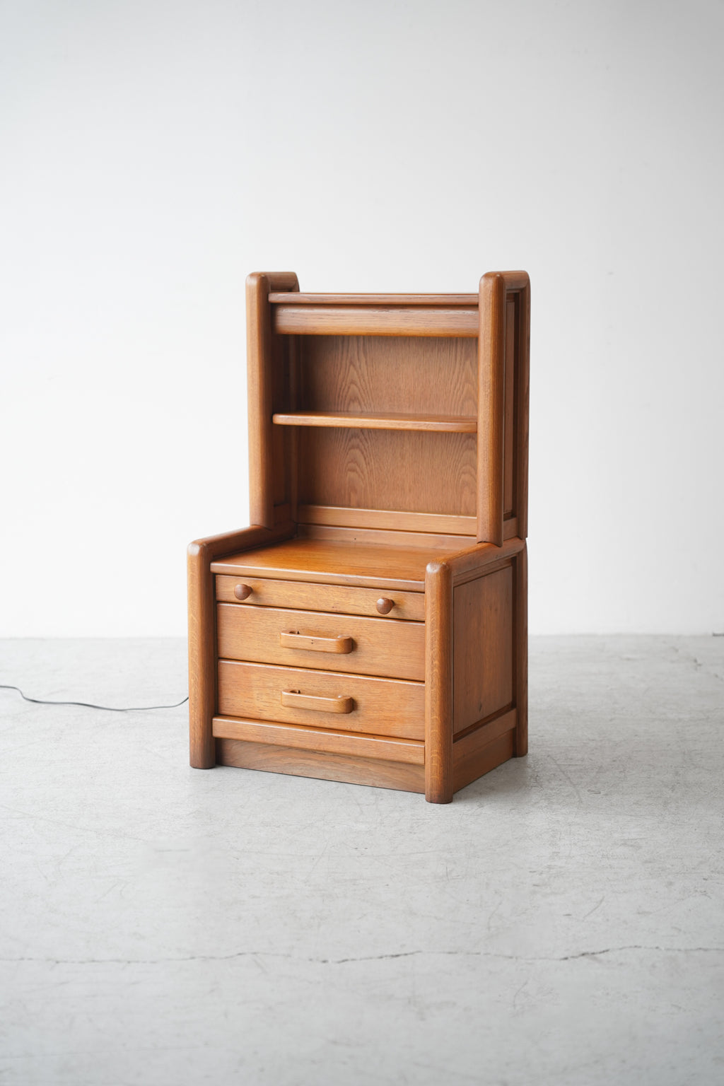 下部には3つの引き出しが備わっており、上段は丸いノブ、下2段は本体に一体化した横長のバータイプという、異なる形状の引き手が配されています。