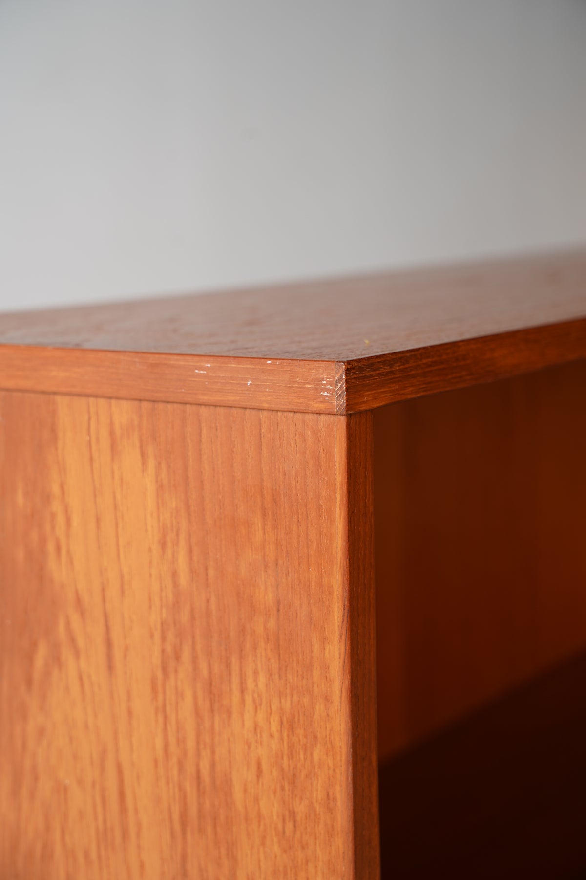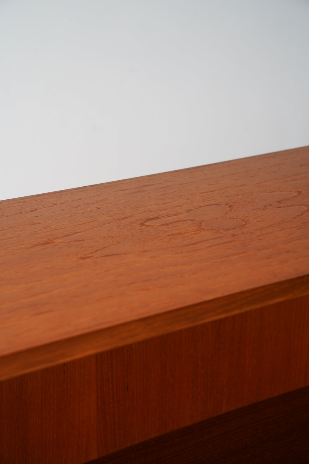 このシェルフの最大の魅力は、上質なチーク材が持つ温かみのある存在感と、洗練されたシンプルな構造です。