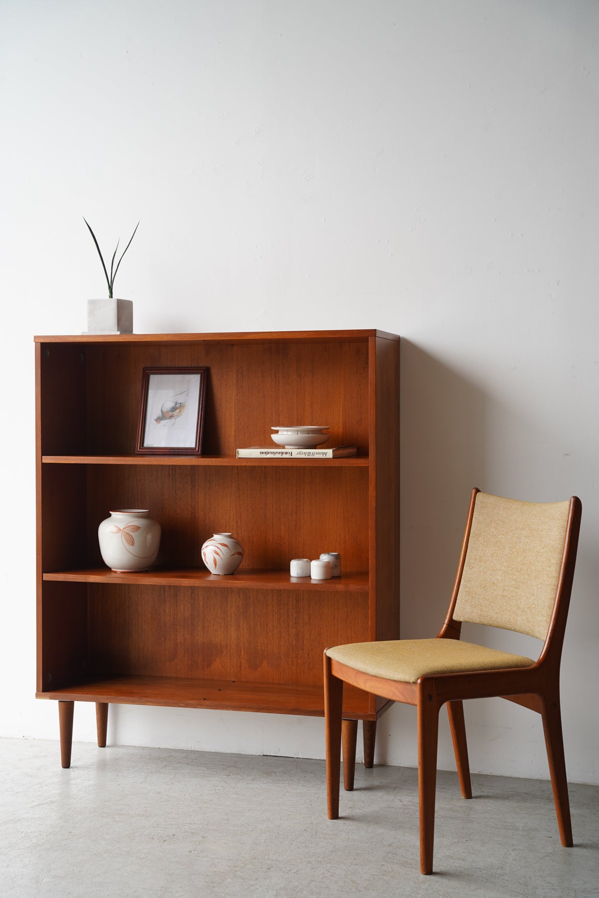 ブックケースとしてはもちろん、飾り棚や収納棚、あるいは間仕切りとしても多用途にお使いいただけます。実用性とタイムレスなデザインを兼ね備えたこのチーク材シェルフは、すっきりとしたモダンなインテリアにも調和し、日々の暮らしに上質な空間を演出してくれるでしょう。