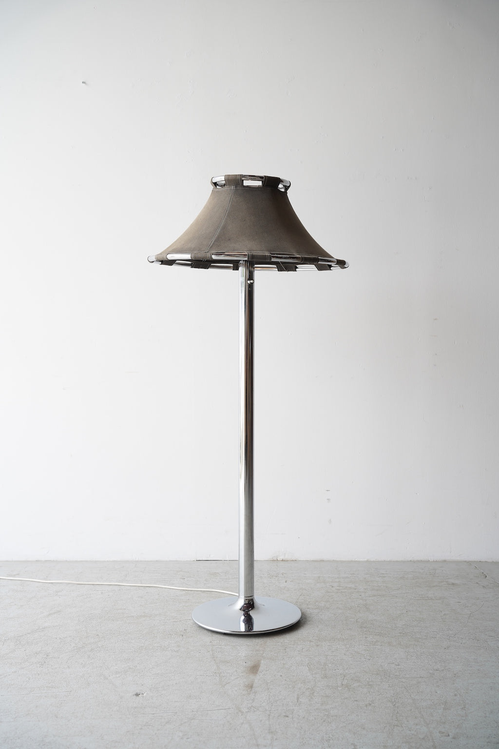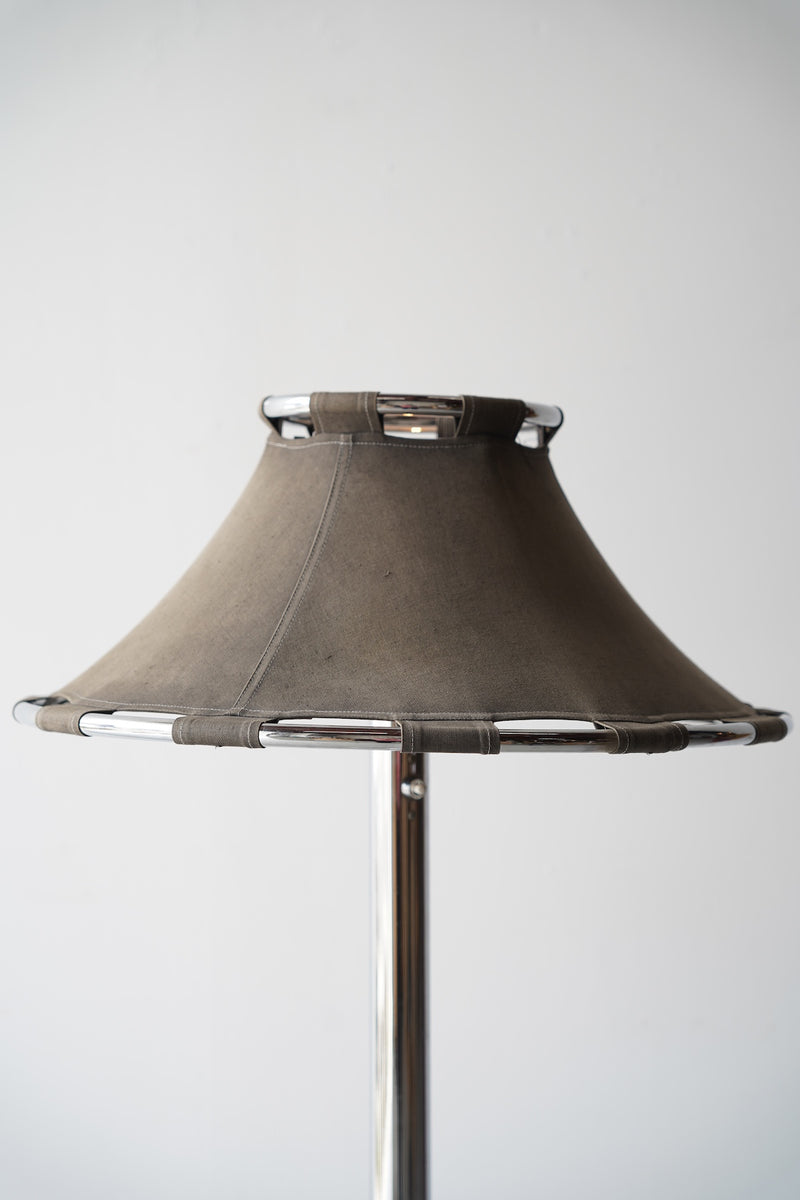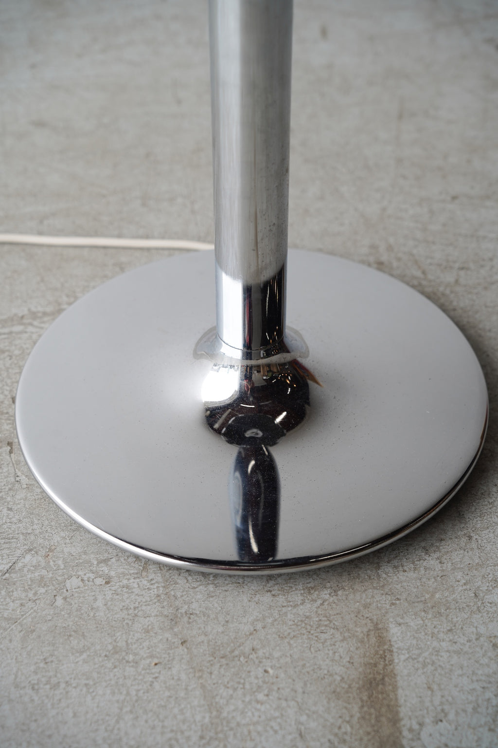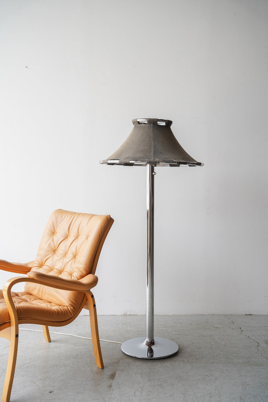 クロームの直線的なポールと丸いベースが織りなすミニマルな美しさに、特徴的なシェードが調和した一点。