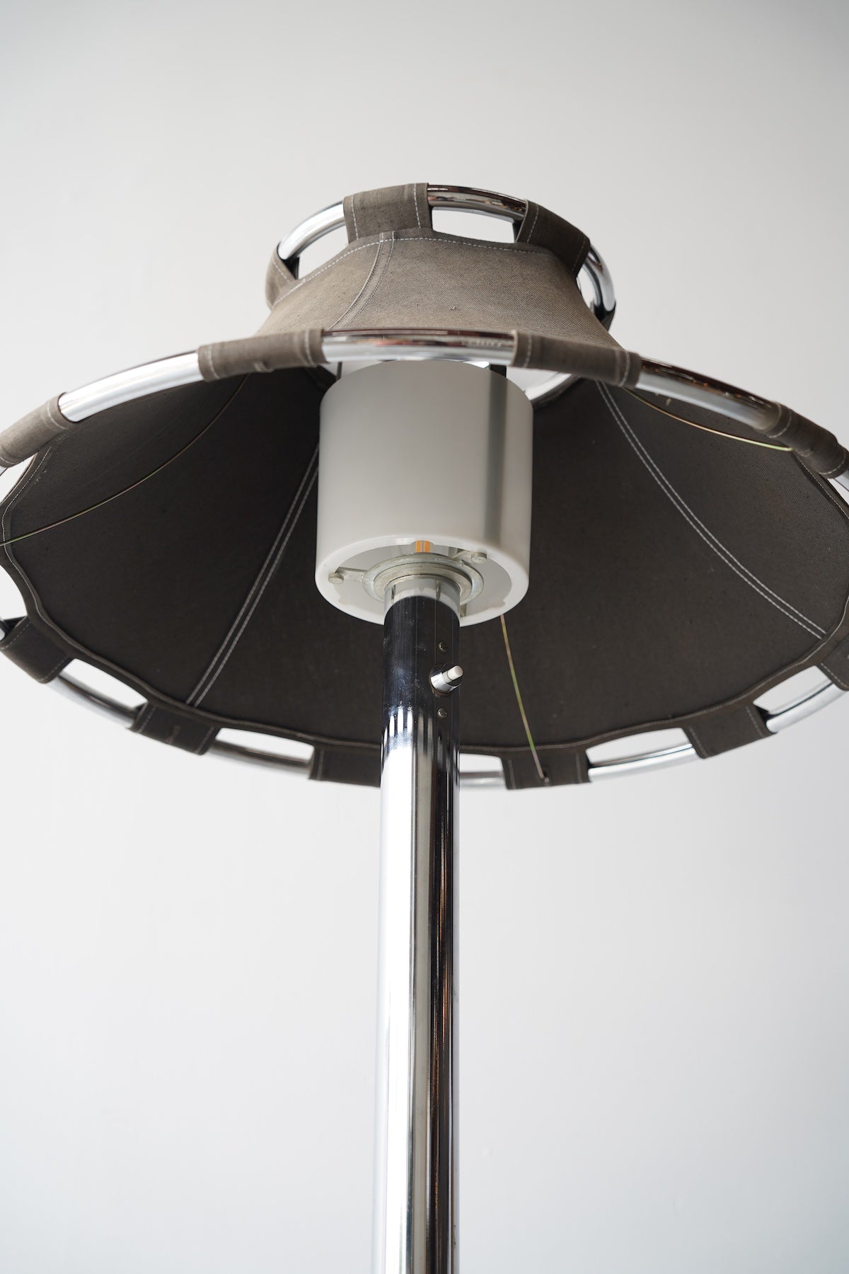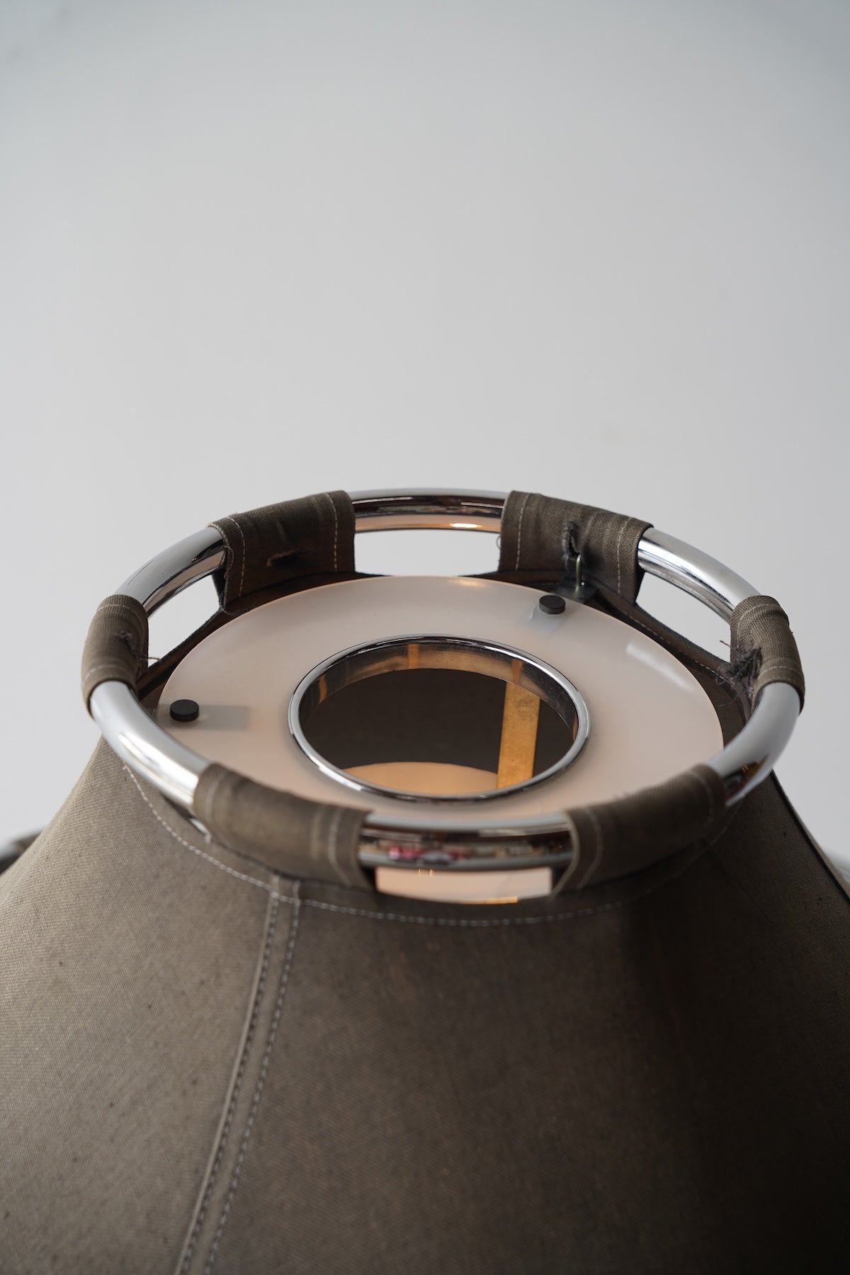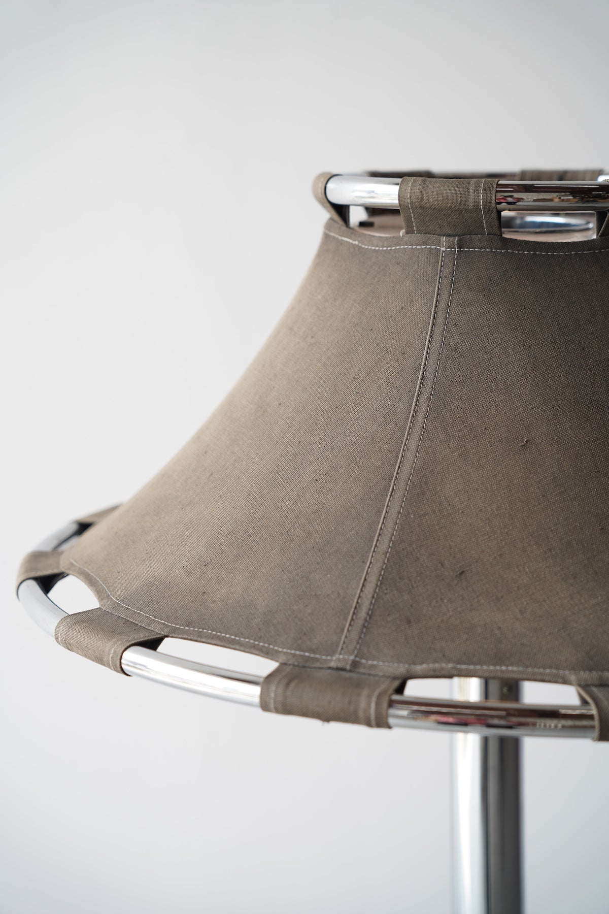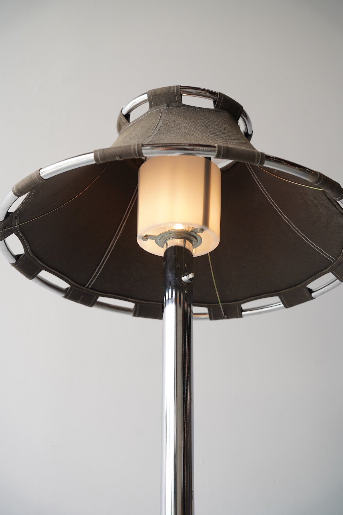 クロームの直線的なポールと丸いベースが織りなすミニマルな美しさに、特徴的なシェードが調和した一点。