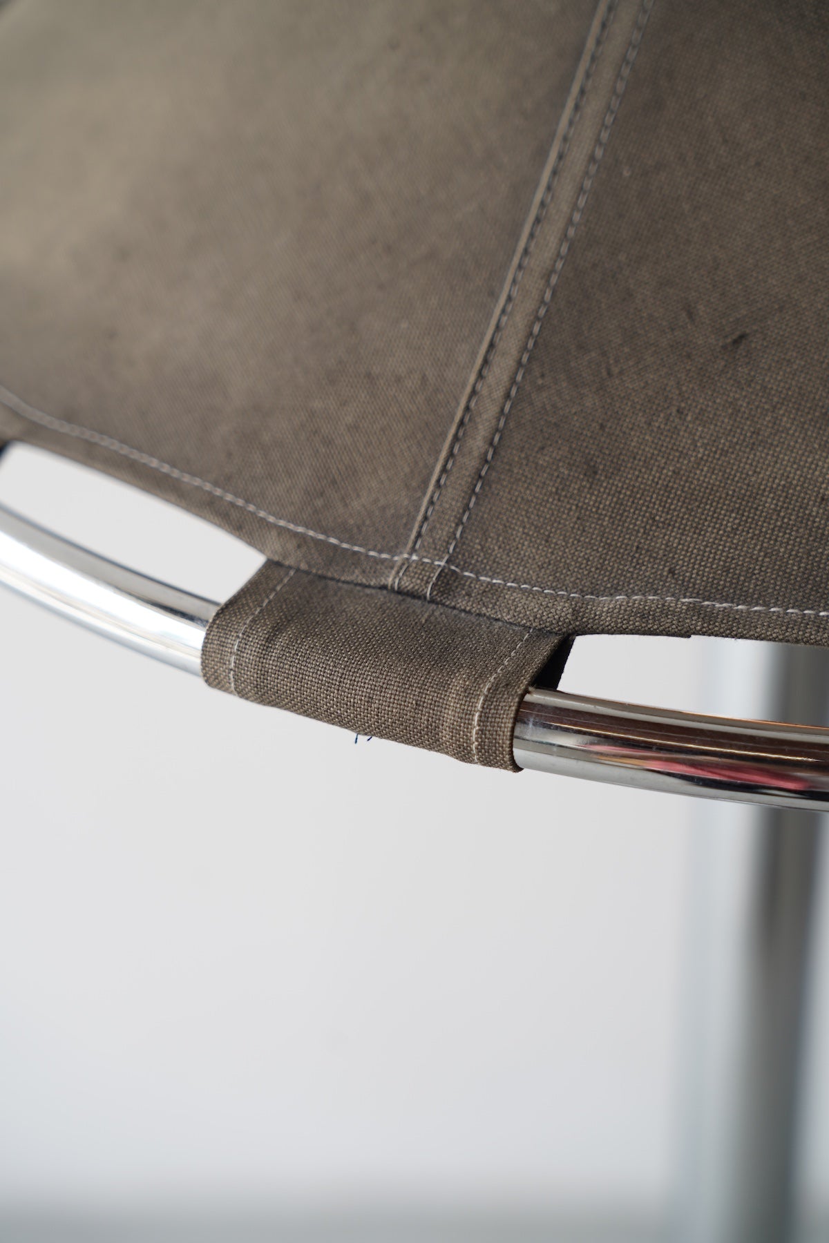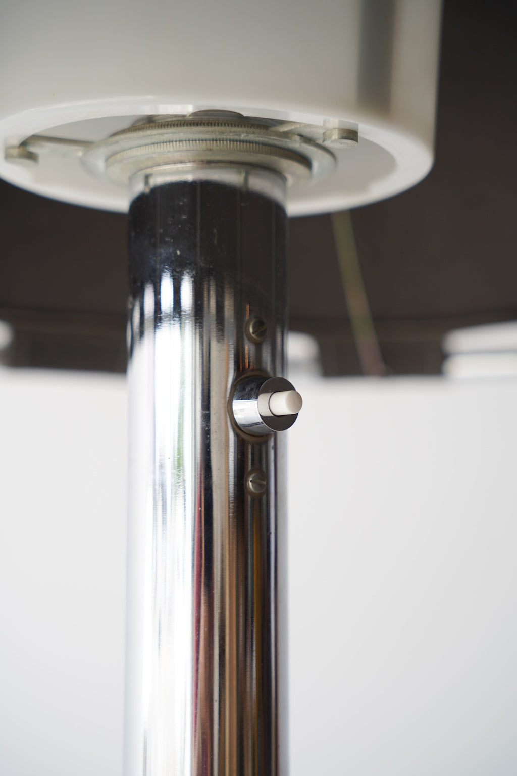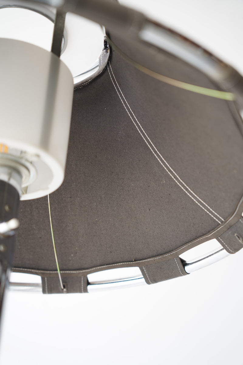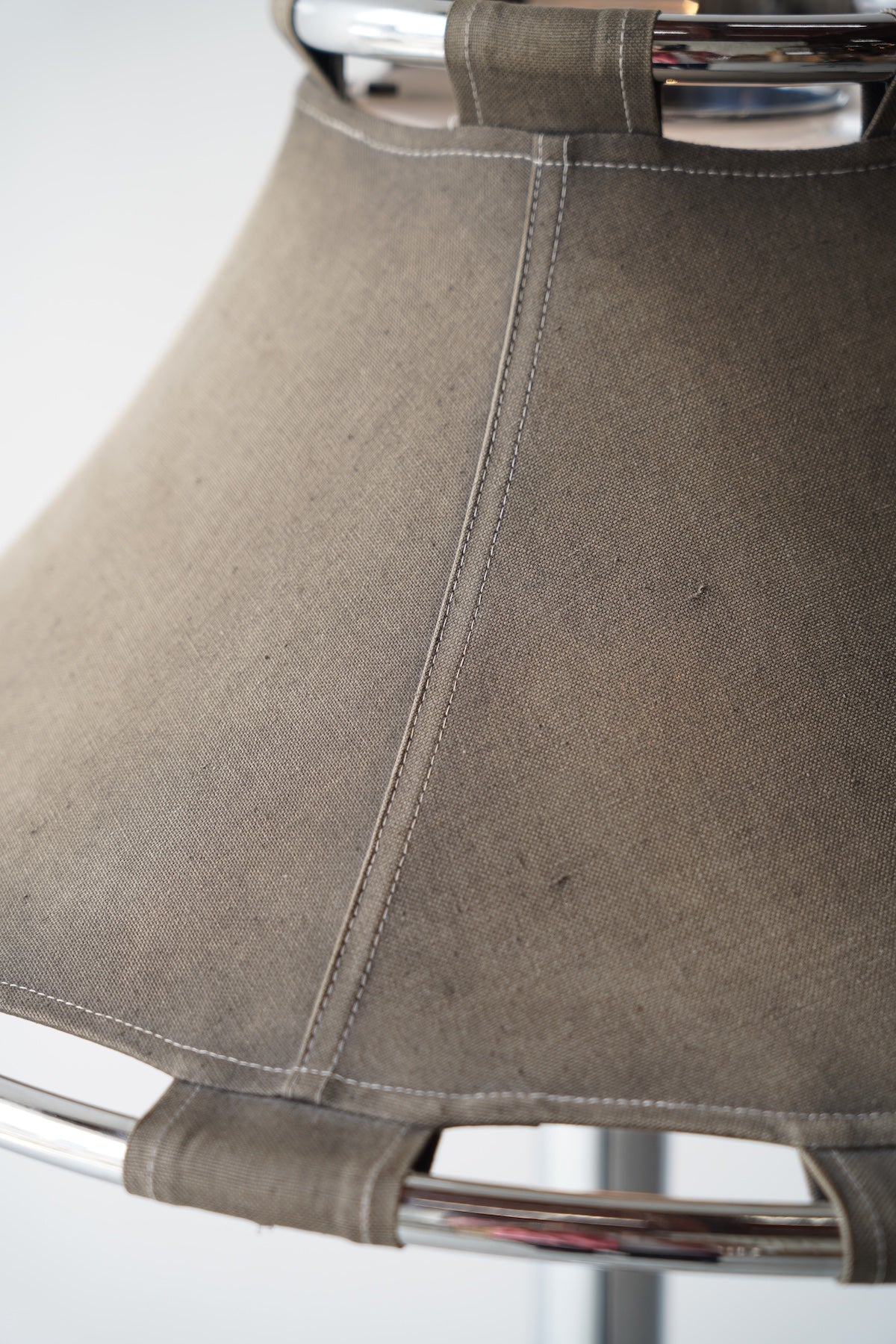 クロームの直線的なポールと丸いベースが織りなすミニマルな美しさに、特徴的なシェードが調和した一点。