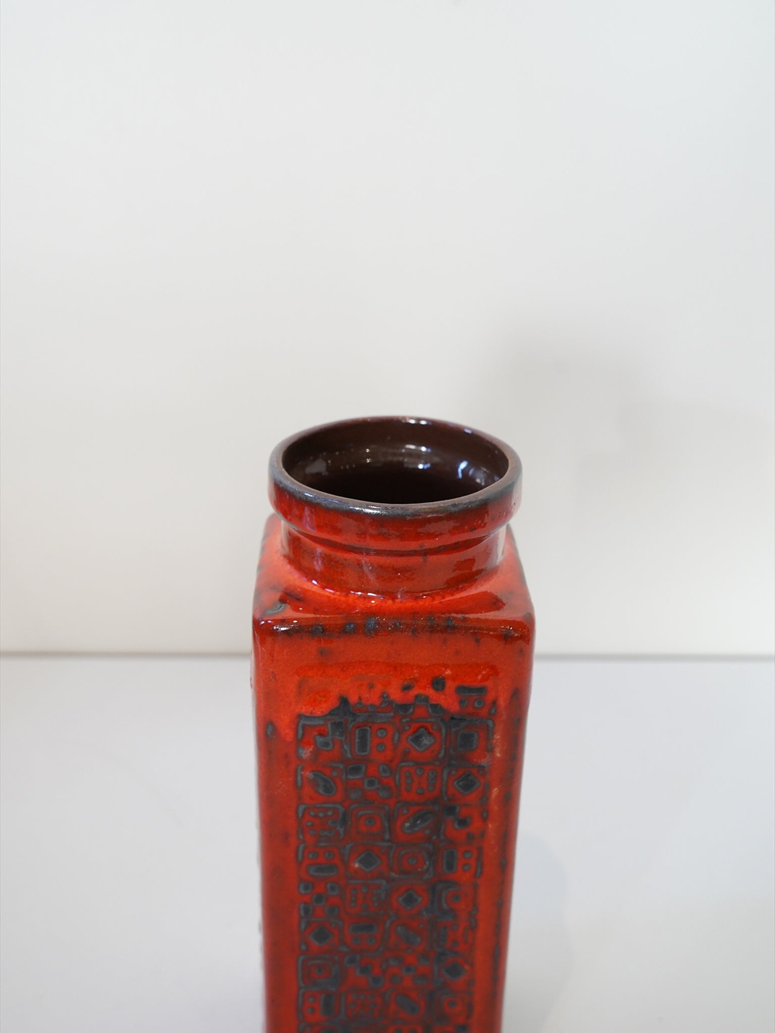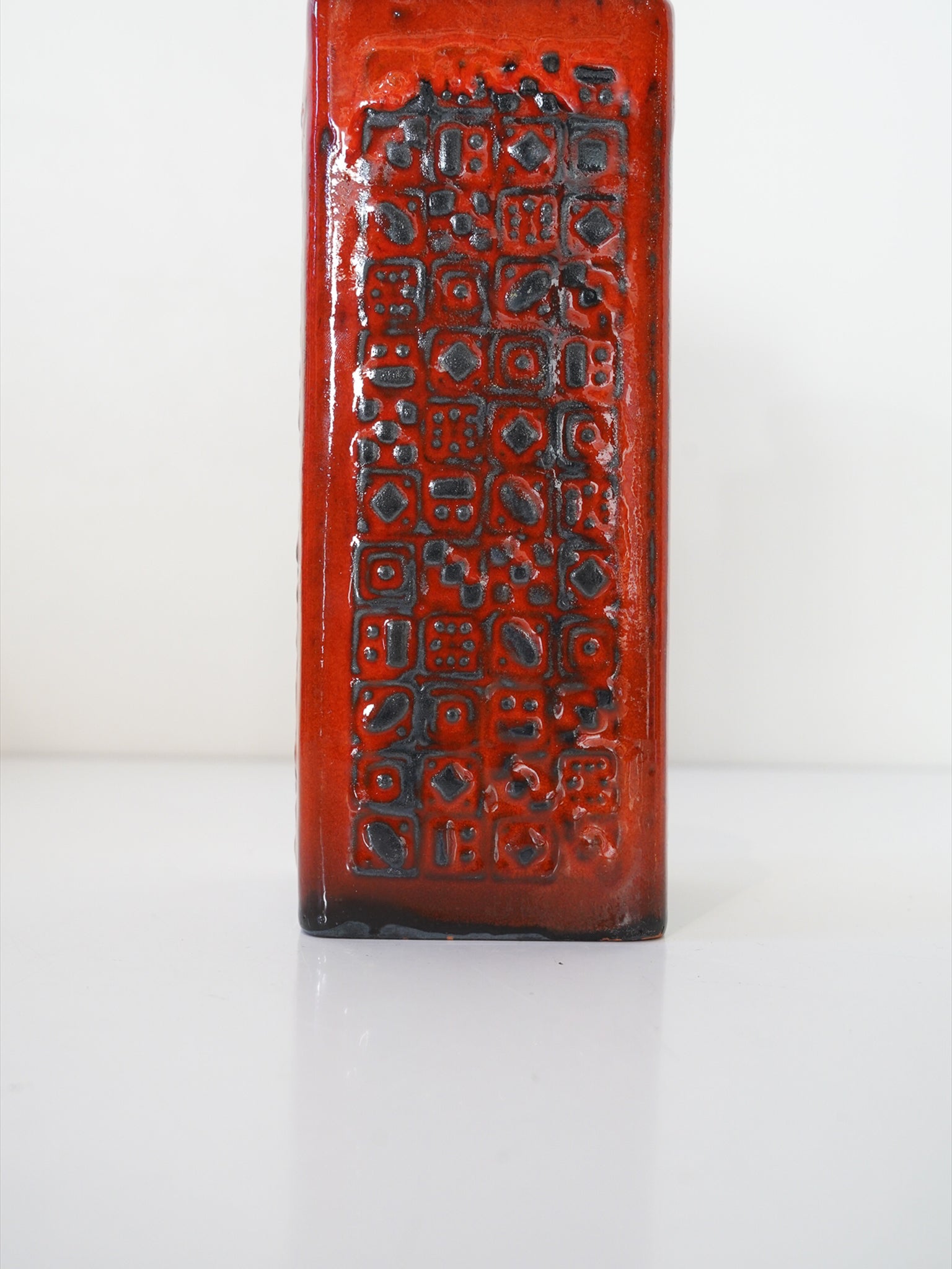 最大の魅力は、シャープなスクエアのフォルムと、幾何学的なレリーフ装飾の融合です。ベース全体は、燃えるような鮮やかな赤の光沢釉で覆われています。その四側面には、抽象的なブロック文字や古代の碑文を思わせる、複雑な格子状のレリーフが施されています。