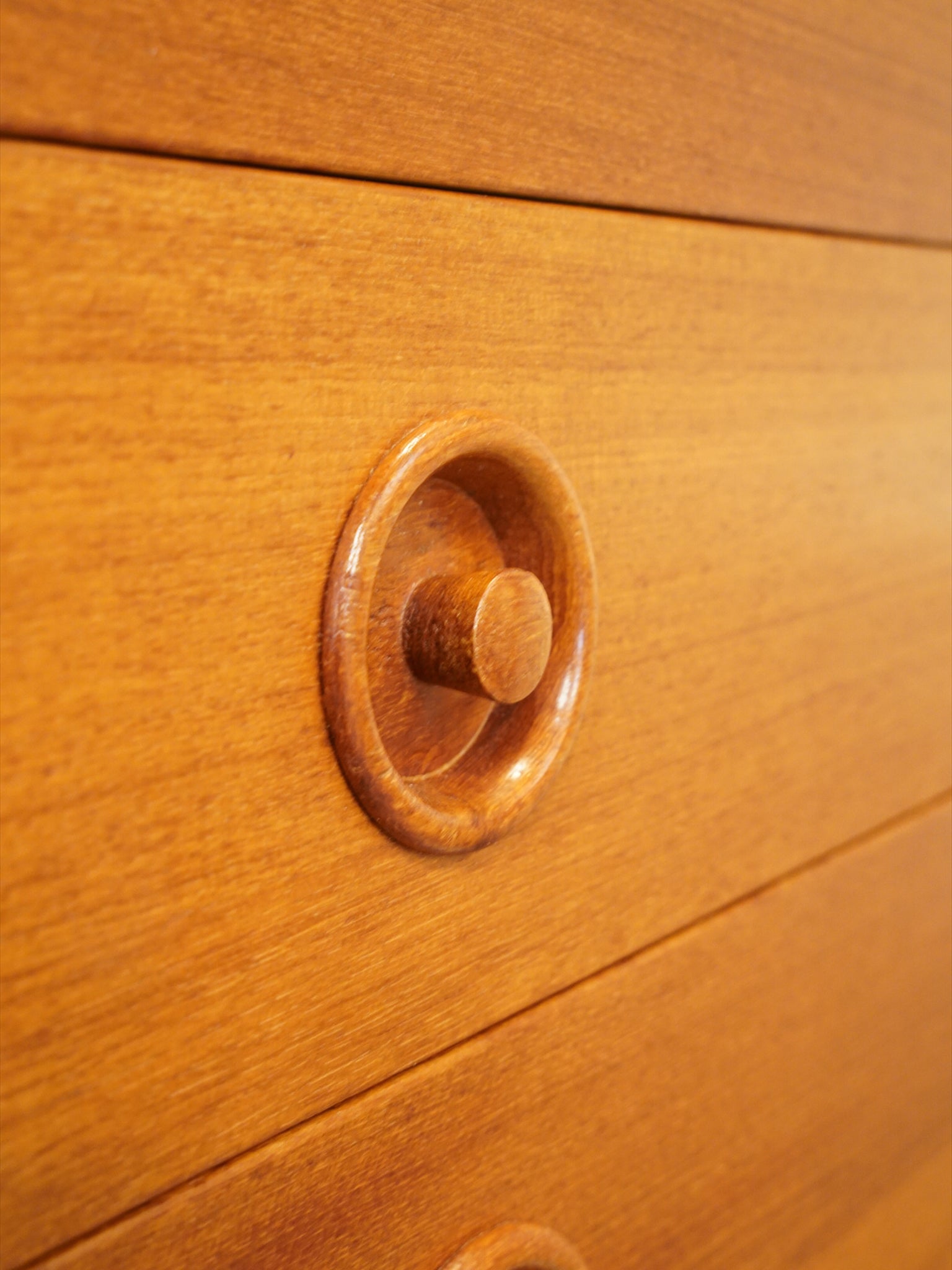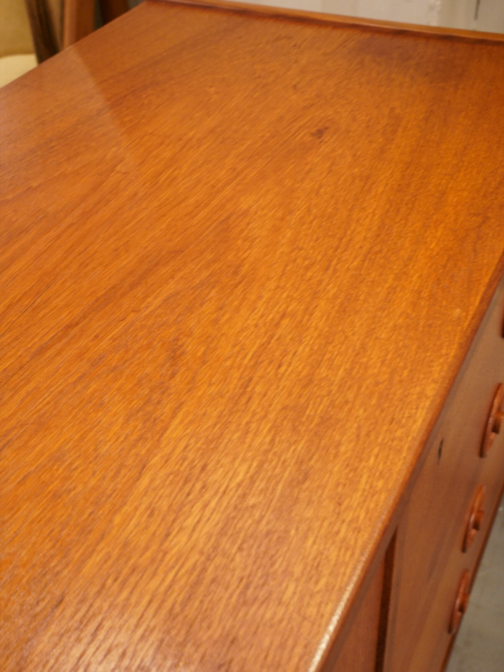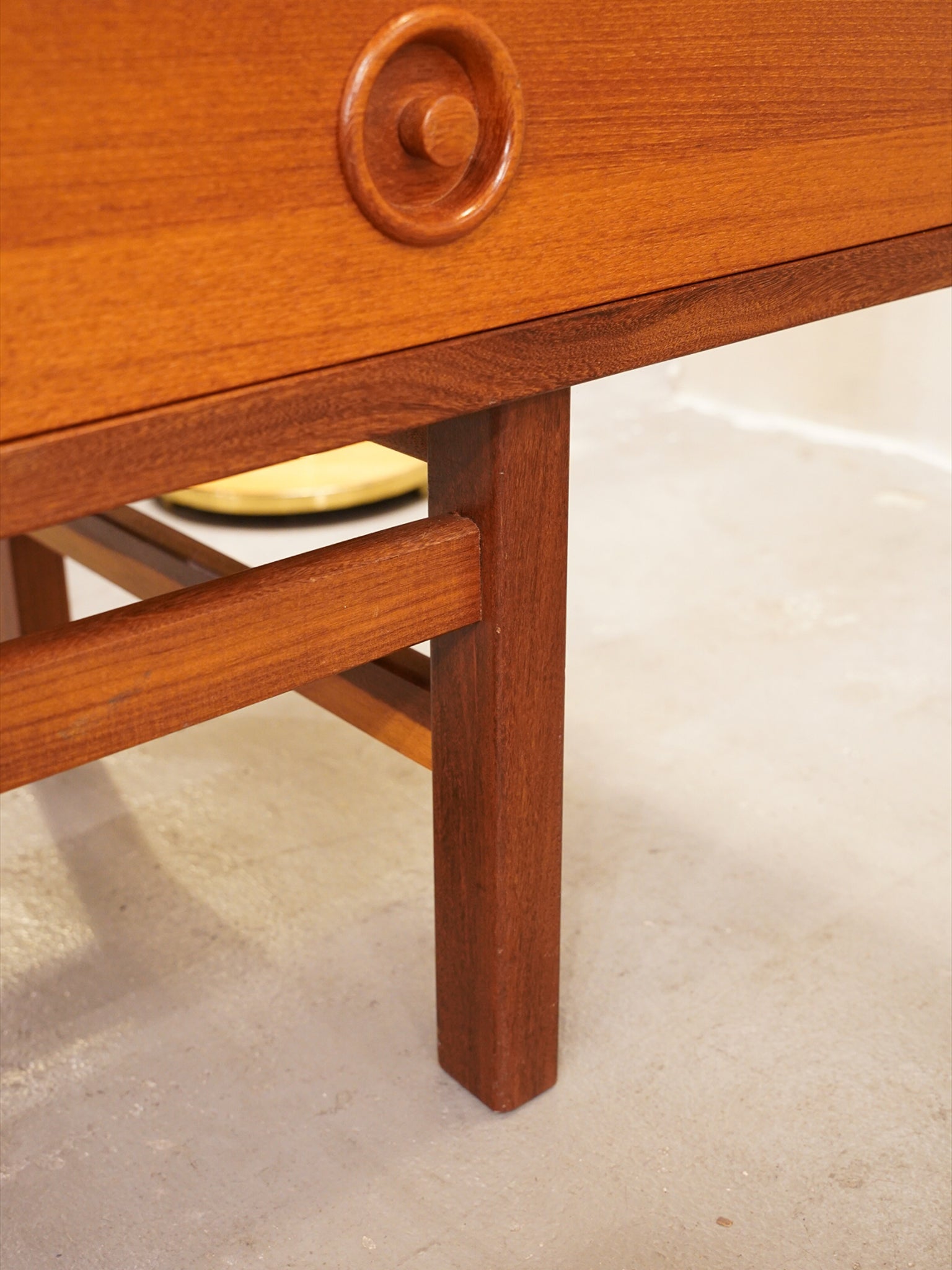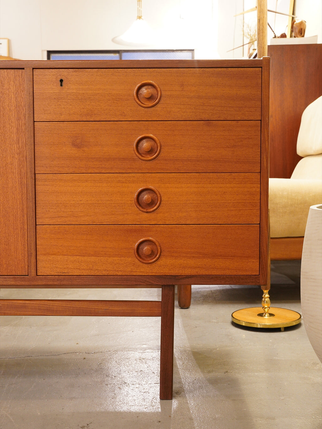 最大の魅力は、チーク材の豊かな質感を引き立てる、力強くも無駄のないスクエアなフォルムにあります。扉や引き出しの前面には、特徴的な円形の掘り込み取っ手が端正に配置されており、直線的な全体像の中に北欧家具らしい柔らかな意匠を添えています。また、足元を支える直線的なストレートレッグは、安定感のある佇まいを演出し、空間を引き締めるモダンなアクセントとして機能します。