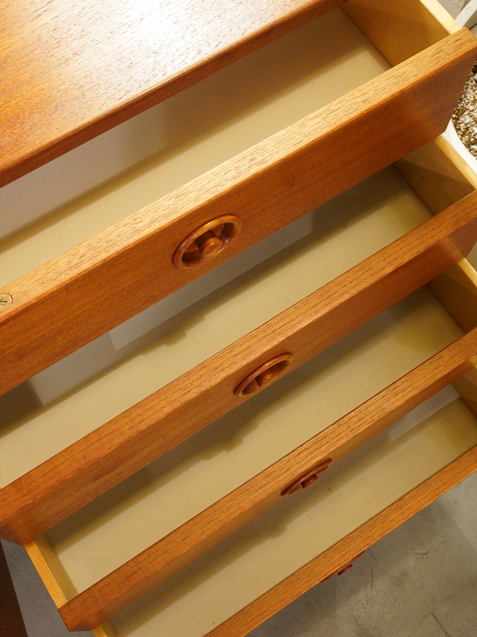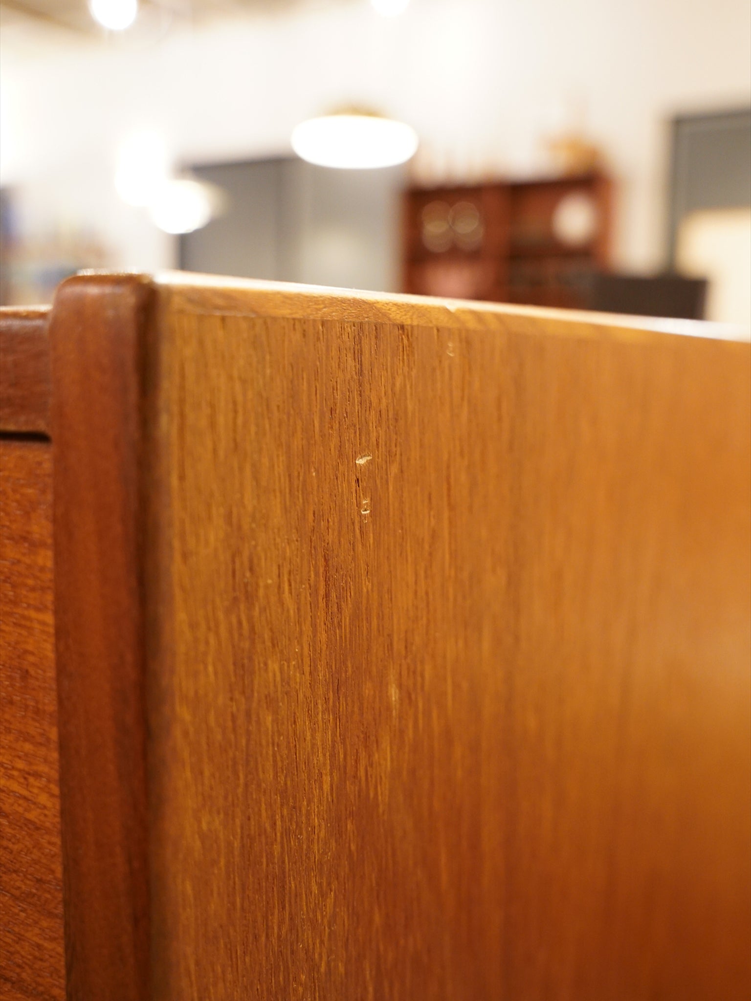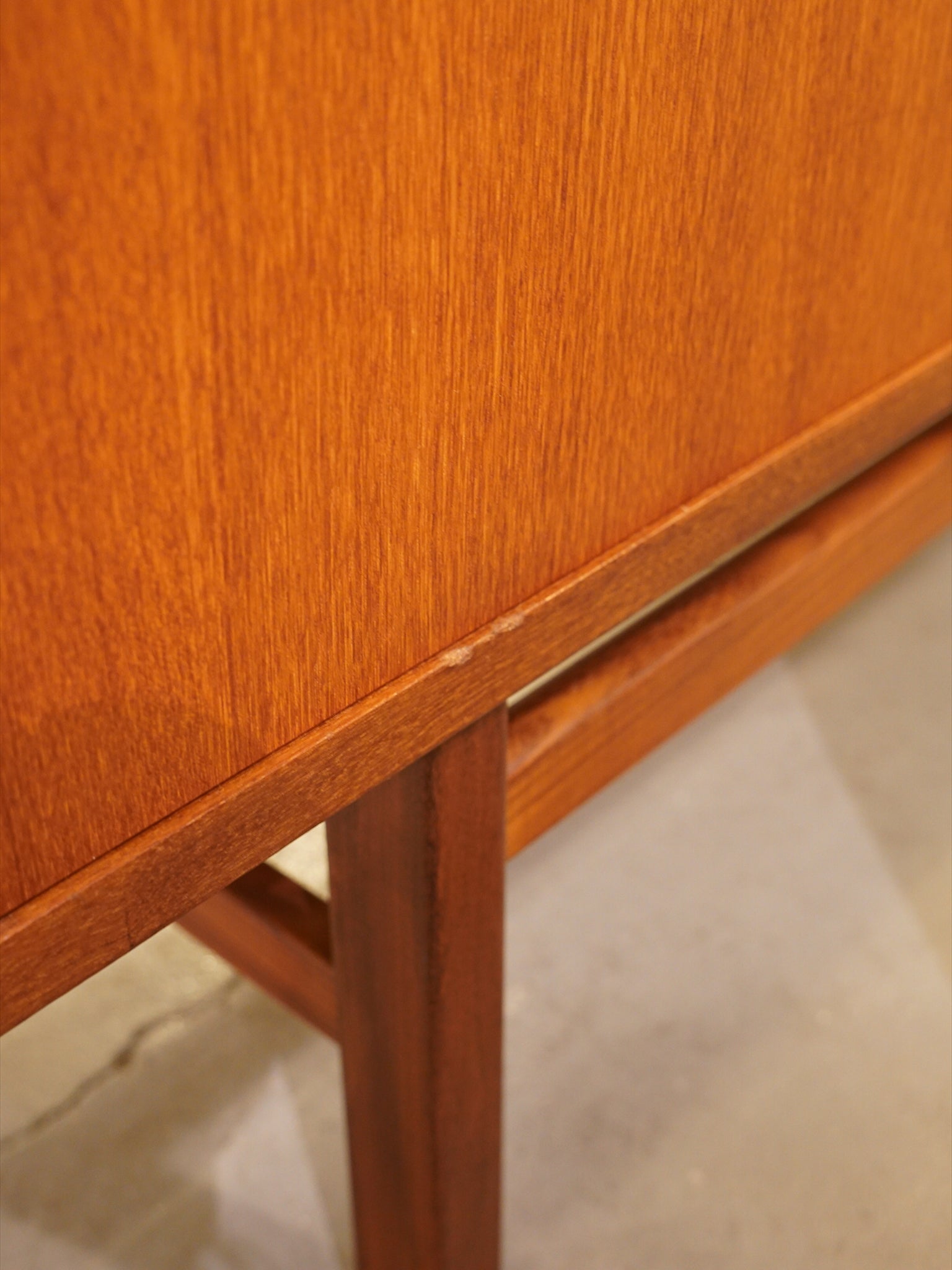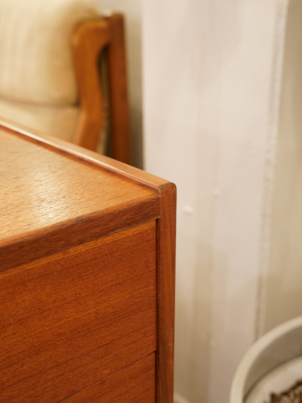 最大の魅力は、チーク材の豊かな質感を引き立てる、力強くも無駄のないスクエアなフォルムにあります。扉や引き出しの前面には、特徴的な円形の掘り込み取っ手が端正に配置されており、直線的な全体像の中に北欧家具らしい柔らかな意匠を添えています。また、足元を支える直線的なストレートレッグは、安定感のある佇まいを演出し、空間を引き締めるモダンなアクセントとして機能します。