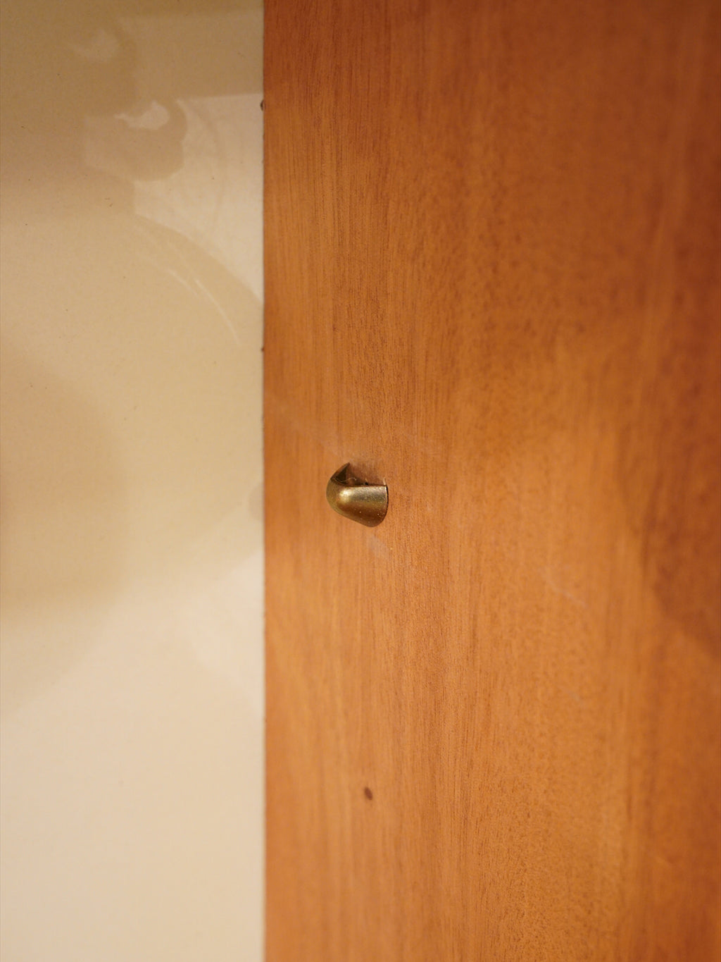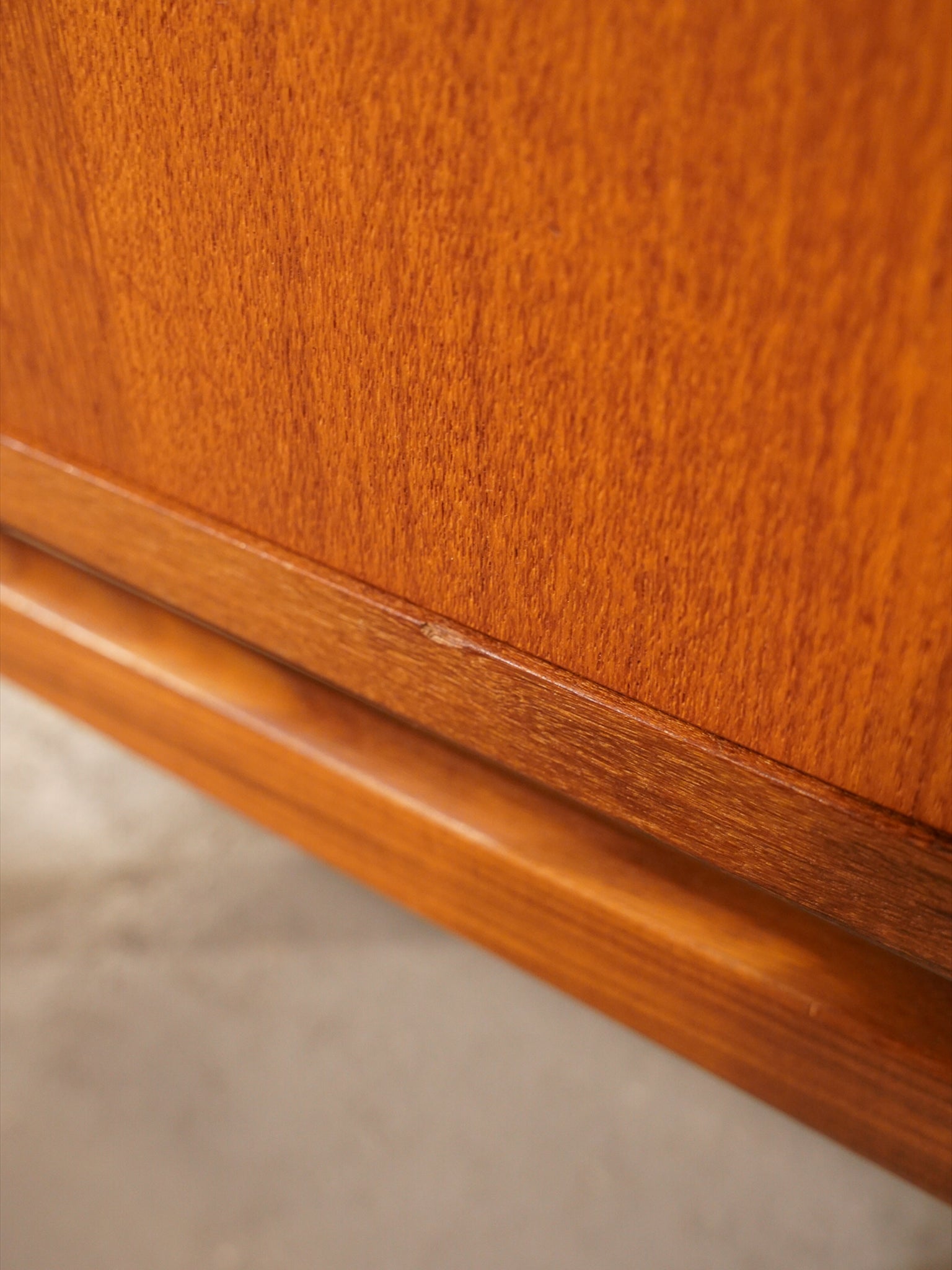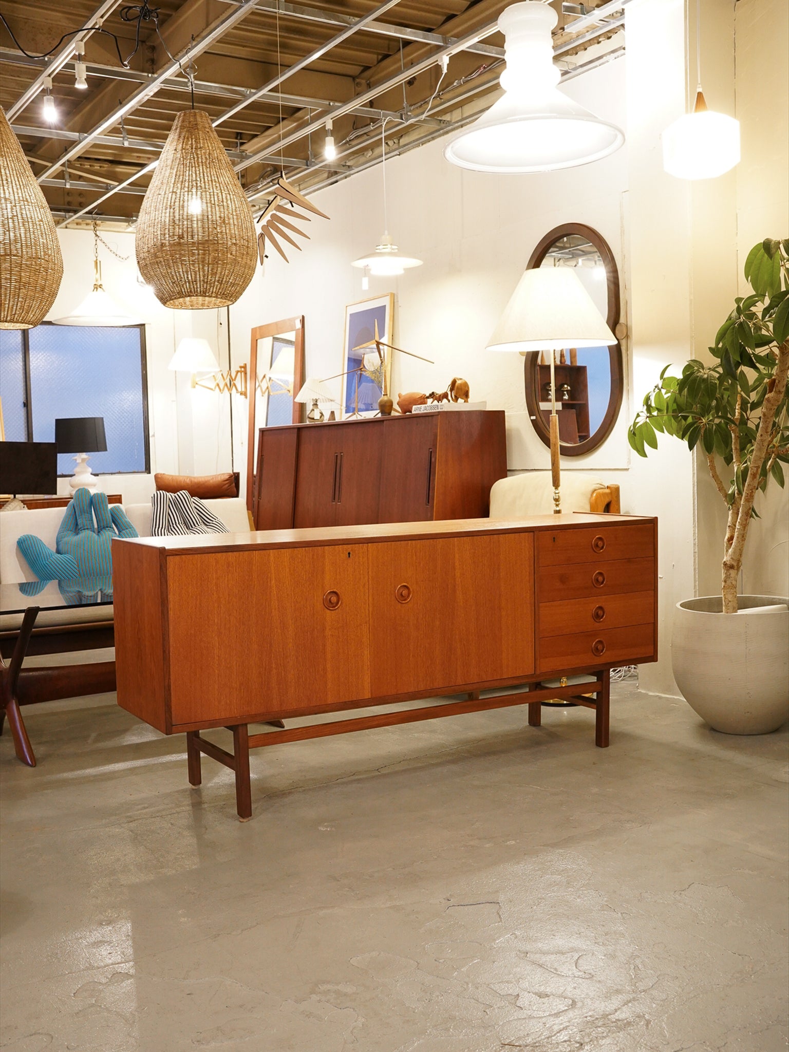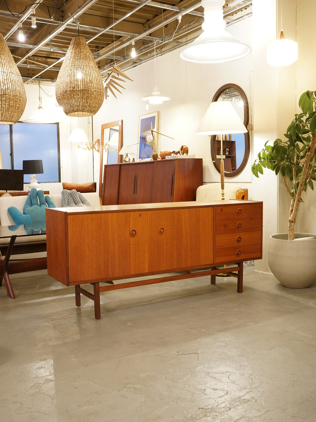 最大の魅力は、チーク材の豊かな質感を引き立てる、力強くも無駄のないスクエアなフォルムにあります。扉や引き出しの前面には、特徴的な円形の掘り込み取っ手が端正に配置されており、直線的な全体像の中に北欧家具らしい柔らかな意匠を添えています。また、足元を支える直線的なストレートレッグは、安定感のある佇まいを演出し、空間を引き締めるモダンなアクセントとして機能します。