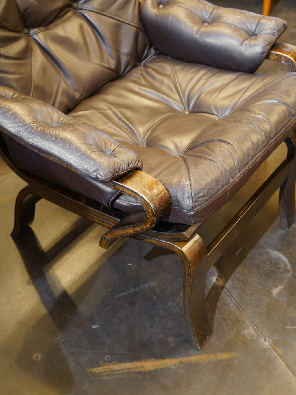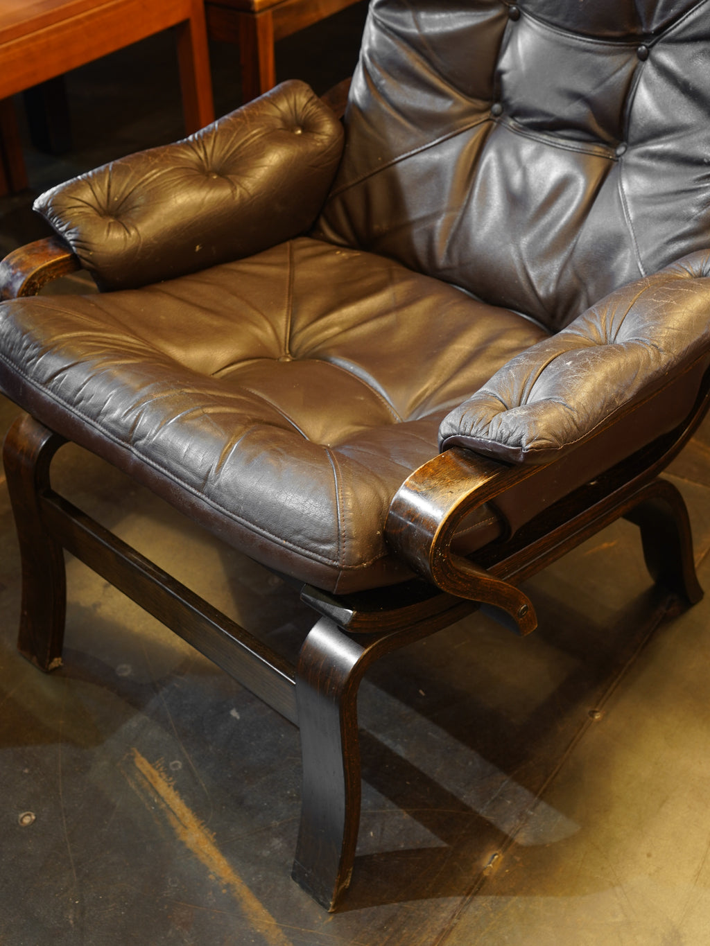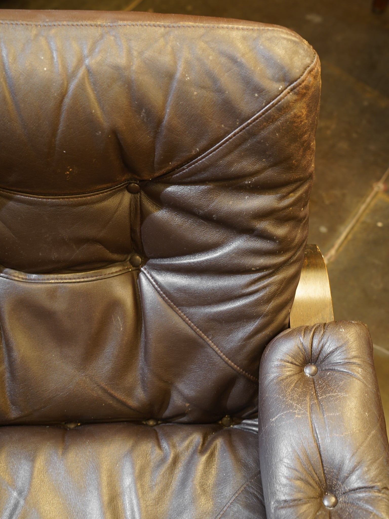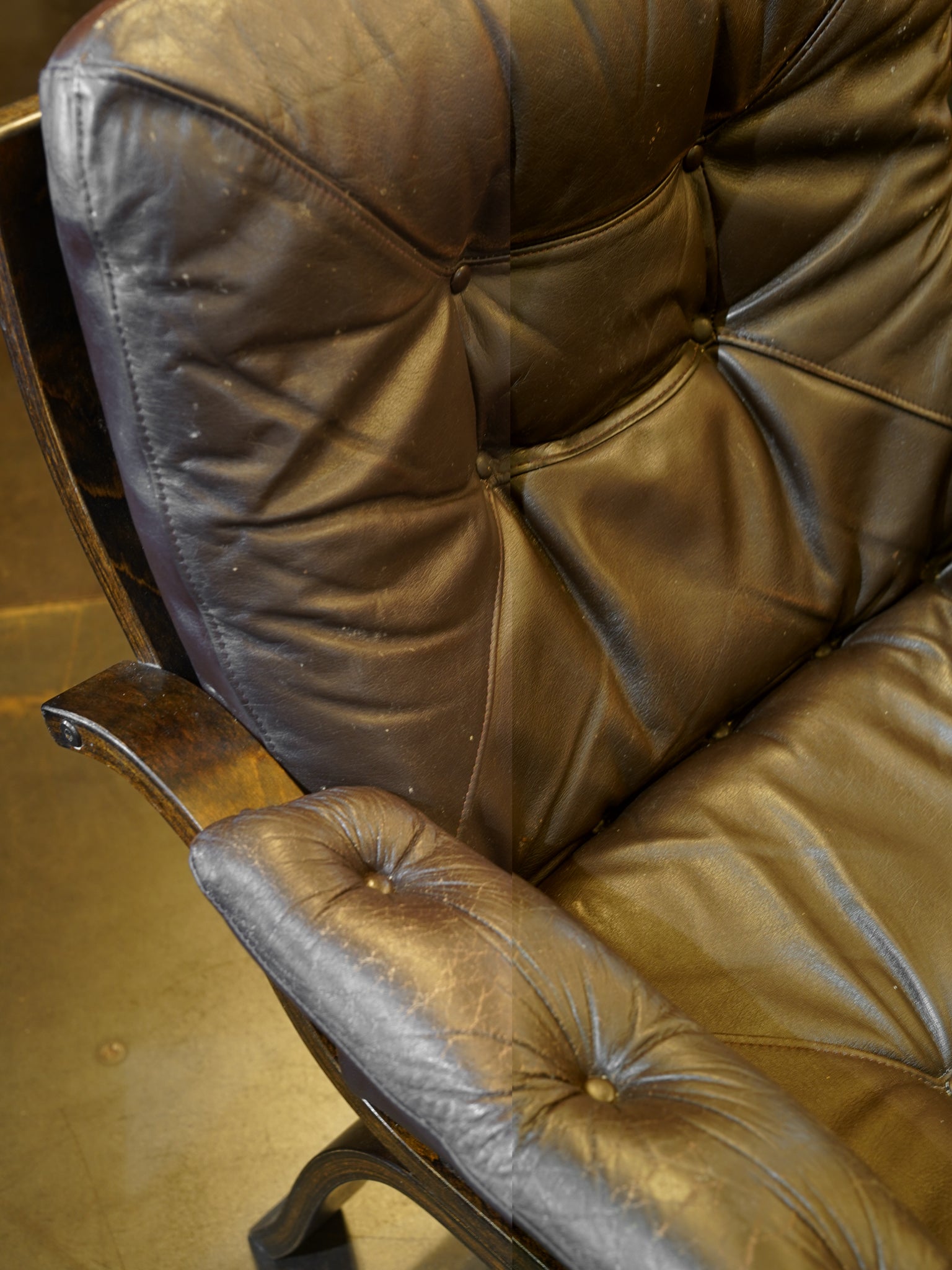 ボタン留めのタフティングがクラシックな印象を与えつつ、本革特有のシワ感や馴染みが高級感を演出します。