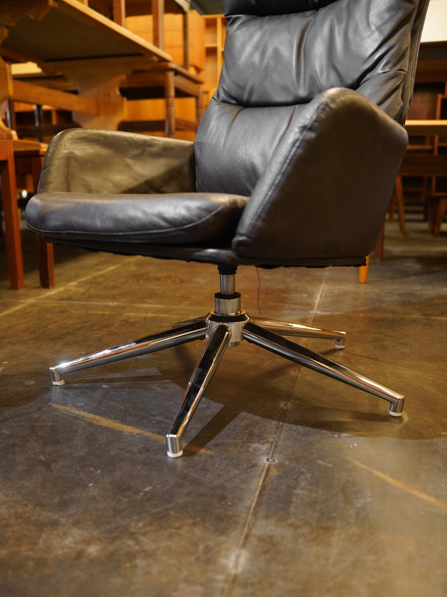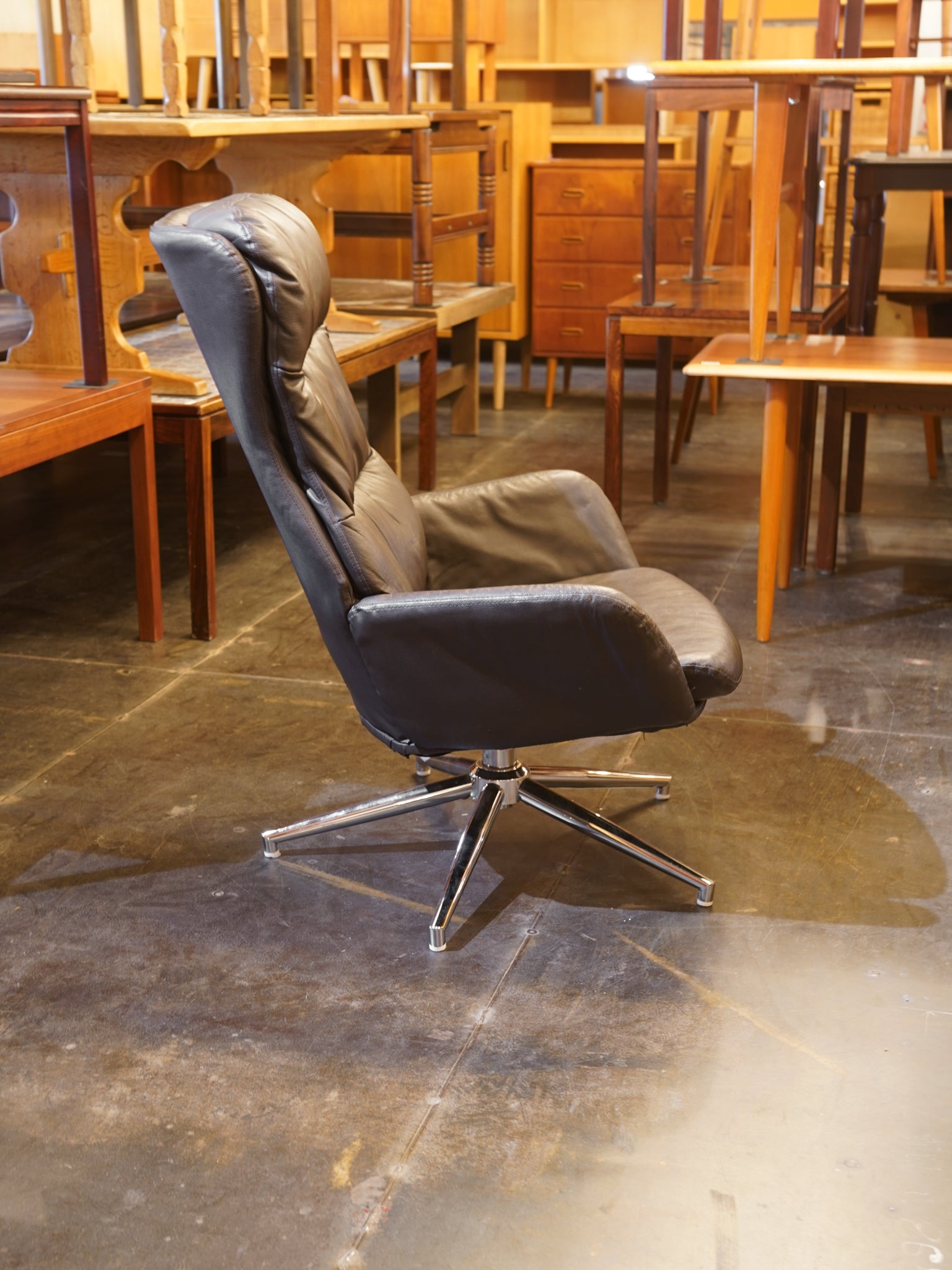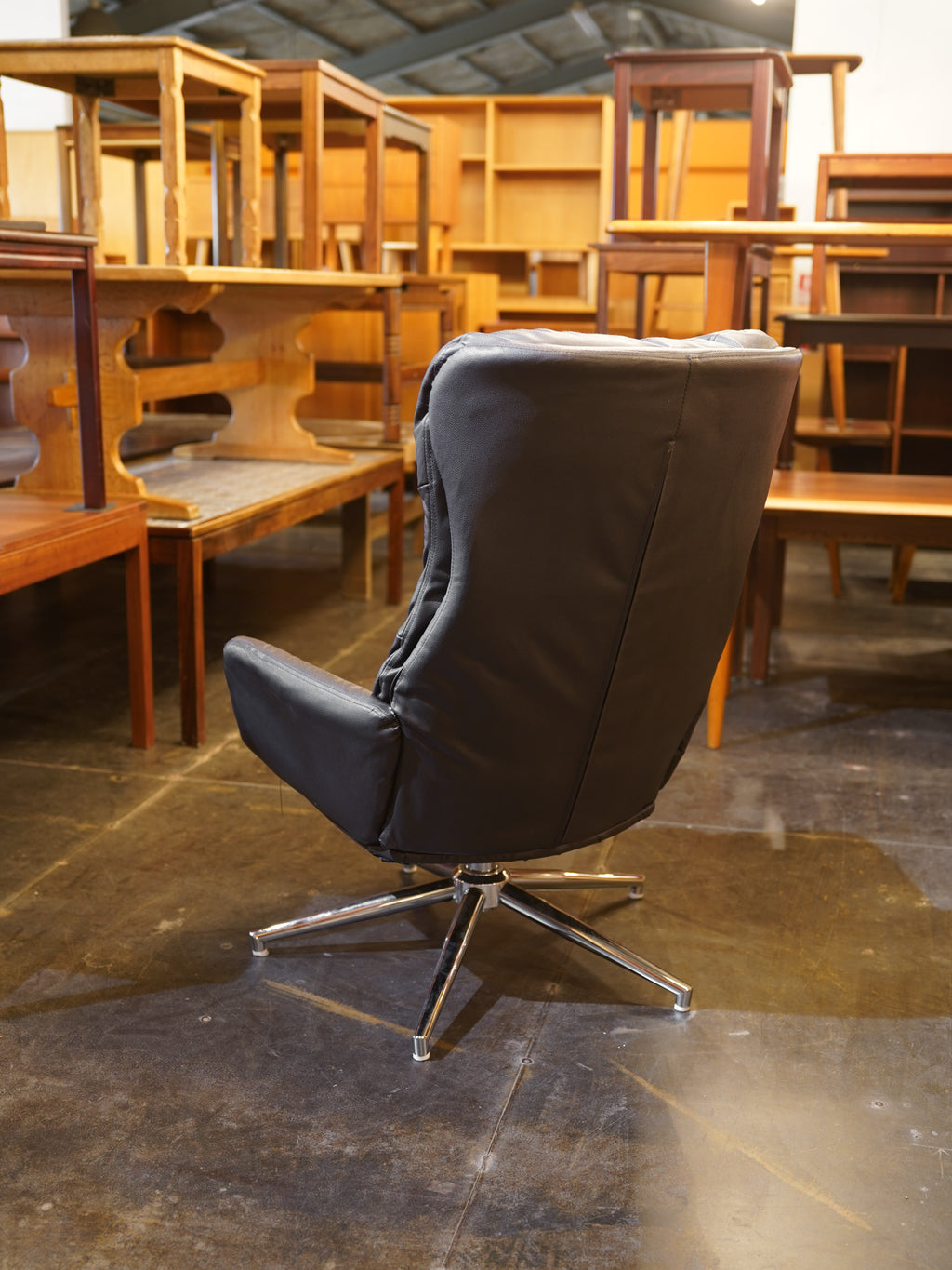 ブラックの合成皮革とクローム脚の質感が際立つ、モダンで都会的なラウンジチェアです。
