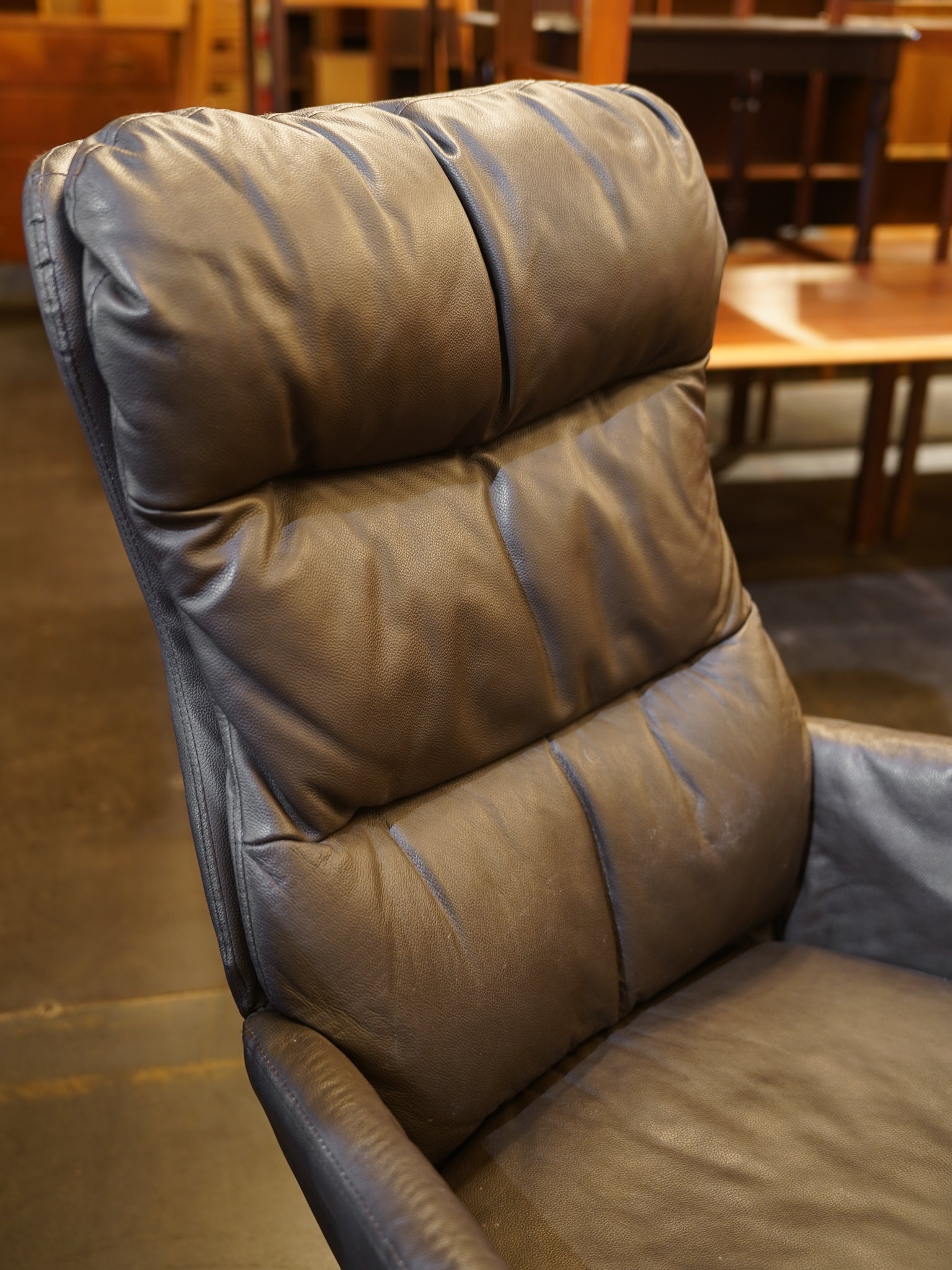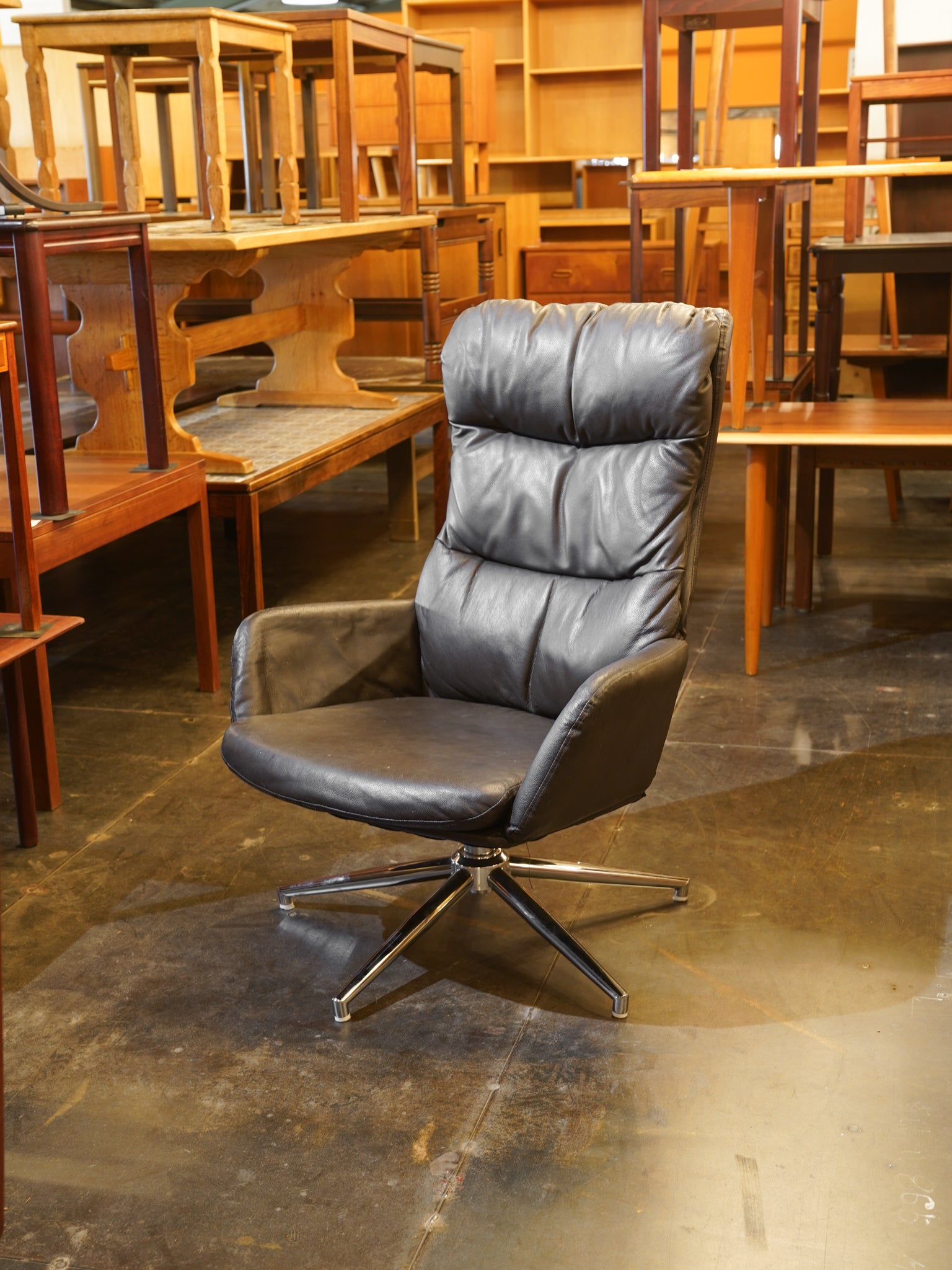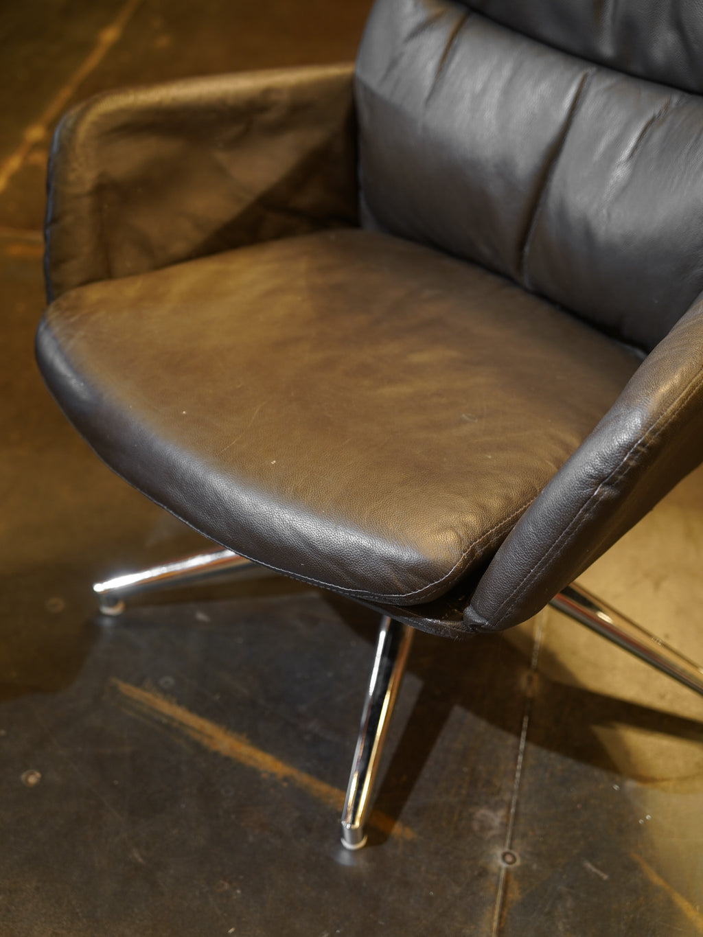 ブラックの合成皮革とクローム脚の質感が際立つ、モダンで都会的なラウンジチェアです。