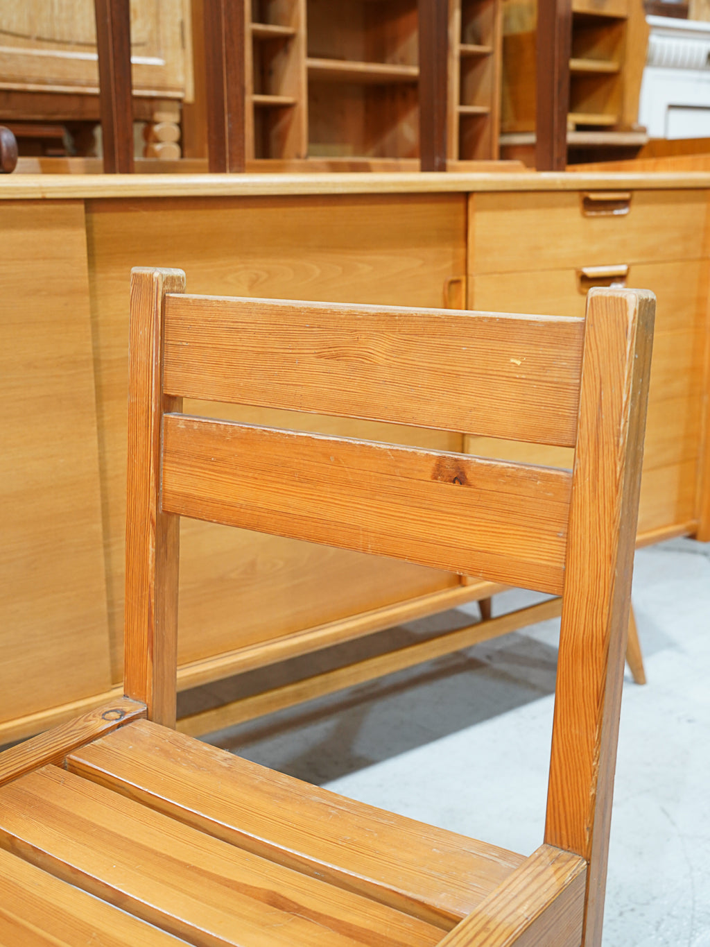 時を経て味わいを増した、飴色の木肌が美しいダイニングチェアです。