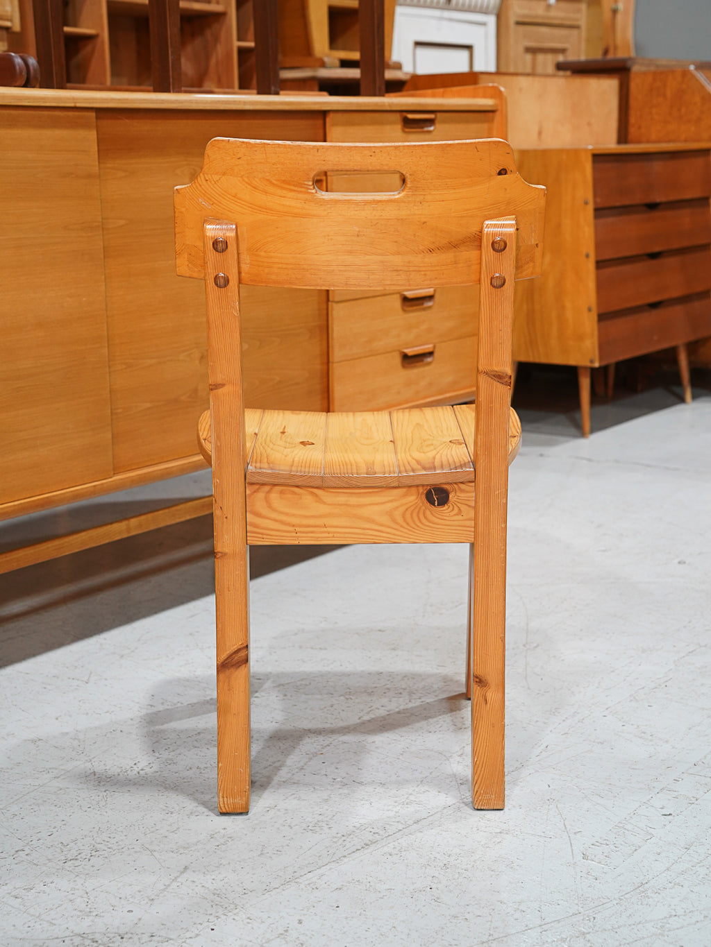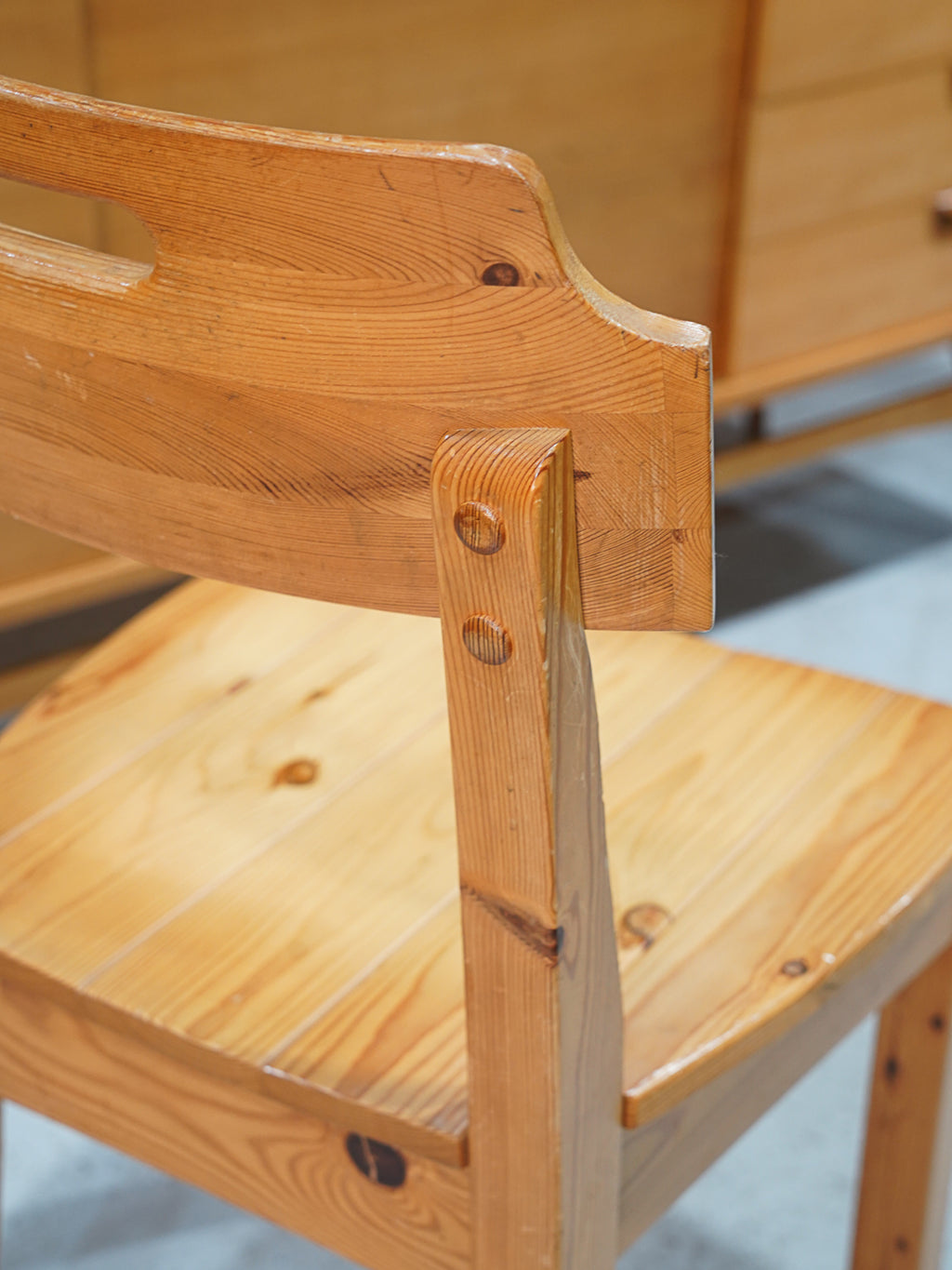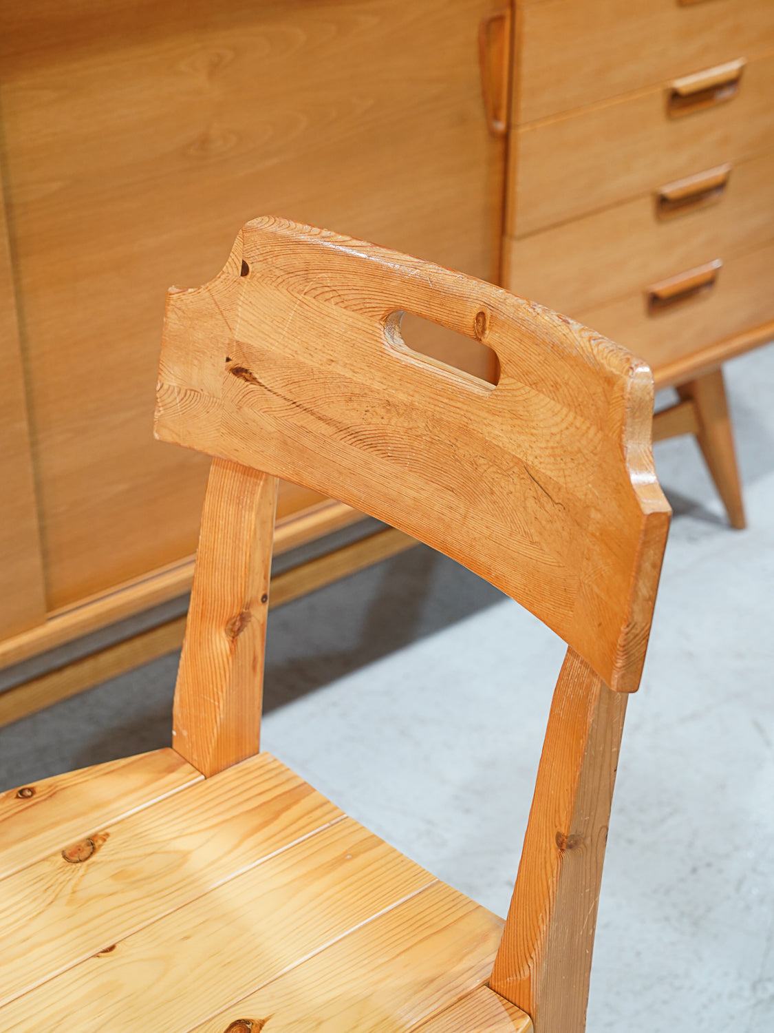 明るいパイン材と、背もたれに施された持ち手のホールが特徴的なヴィンテージチェアです。