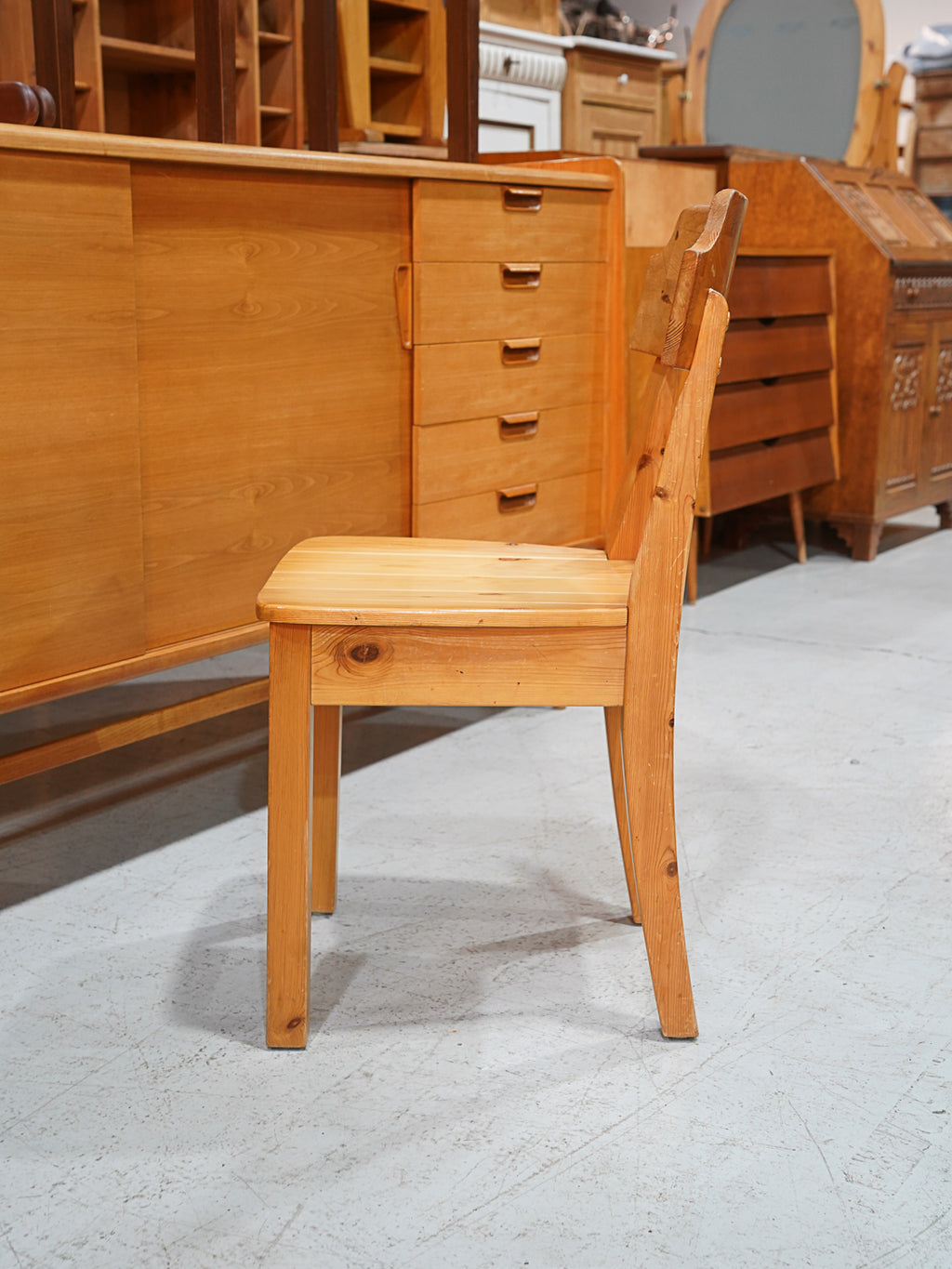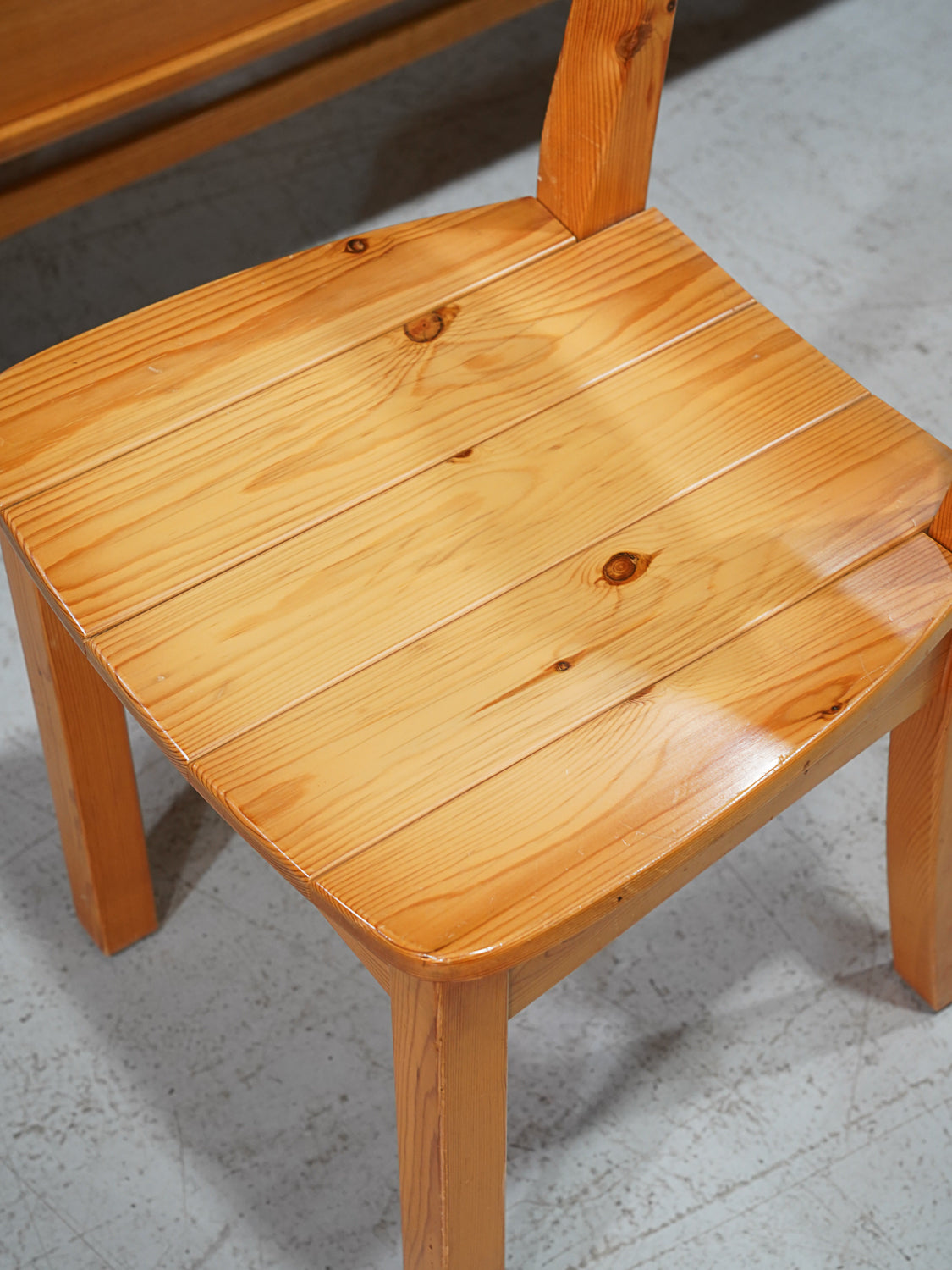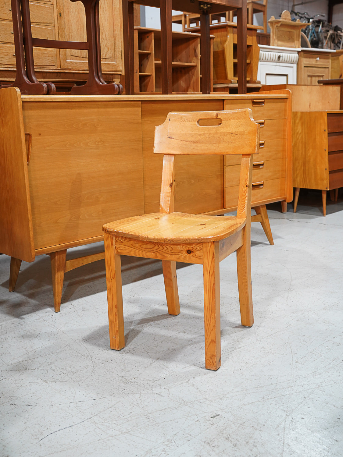 明るいパイン材と、背もたれに施された持ち手のホールが特徴的なヴィンテージチェアです。
