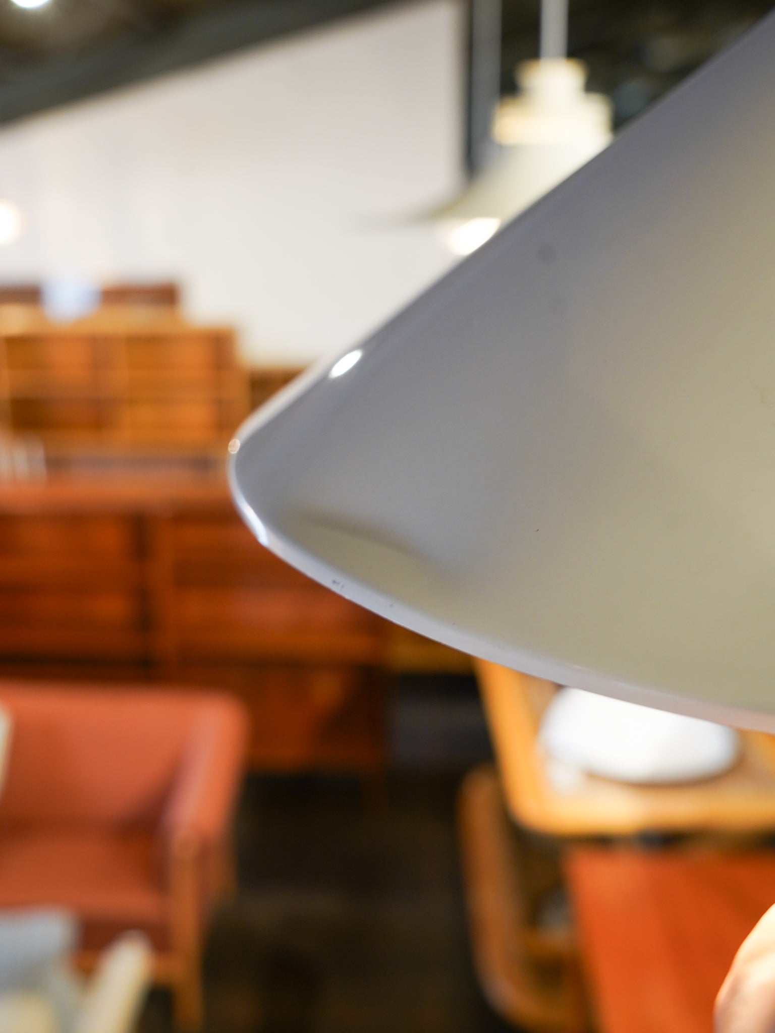 無駄のない造形に、艶やかなホワイト塗装が施され、清潔感のある佇まいに仕上げられています。光を均一に受け止める滑らかな表面は、点灯時にはやさしく空間を照らし、消灯時もオブジェのような存在感を放ちます。