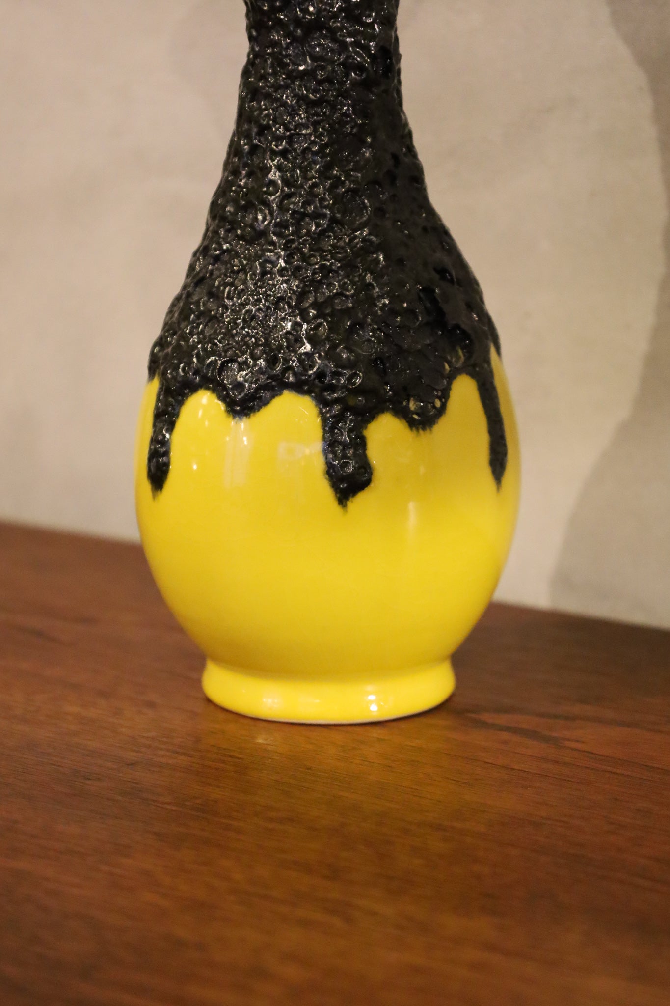 艶やかで鮮烈なレモンイエローのベースに、まるで墨を流したような漆黒の溶岩釉が大胆に滴ります。