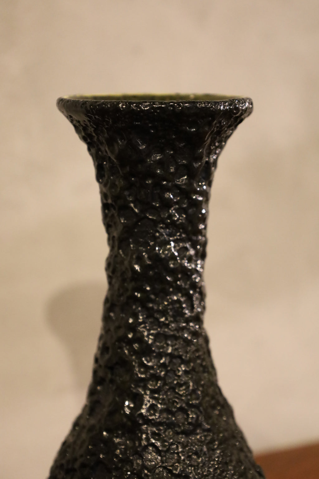 厚く、複雑な気泡を孕んだ黒い釉薬は、滑らかなイエローの肌との対比によって、より一層その荒々しさと素材感を引き立てています。