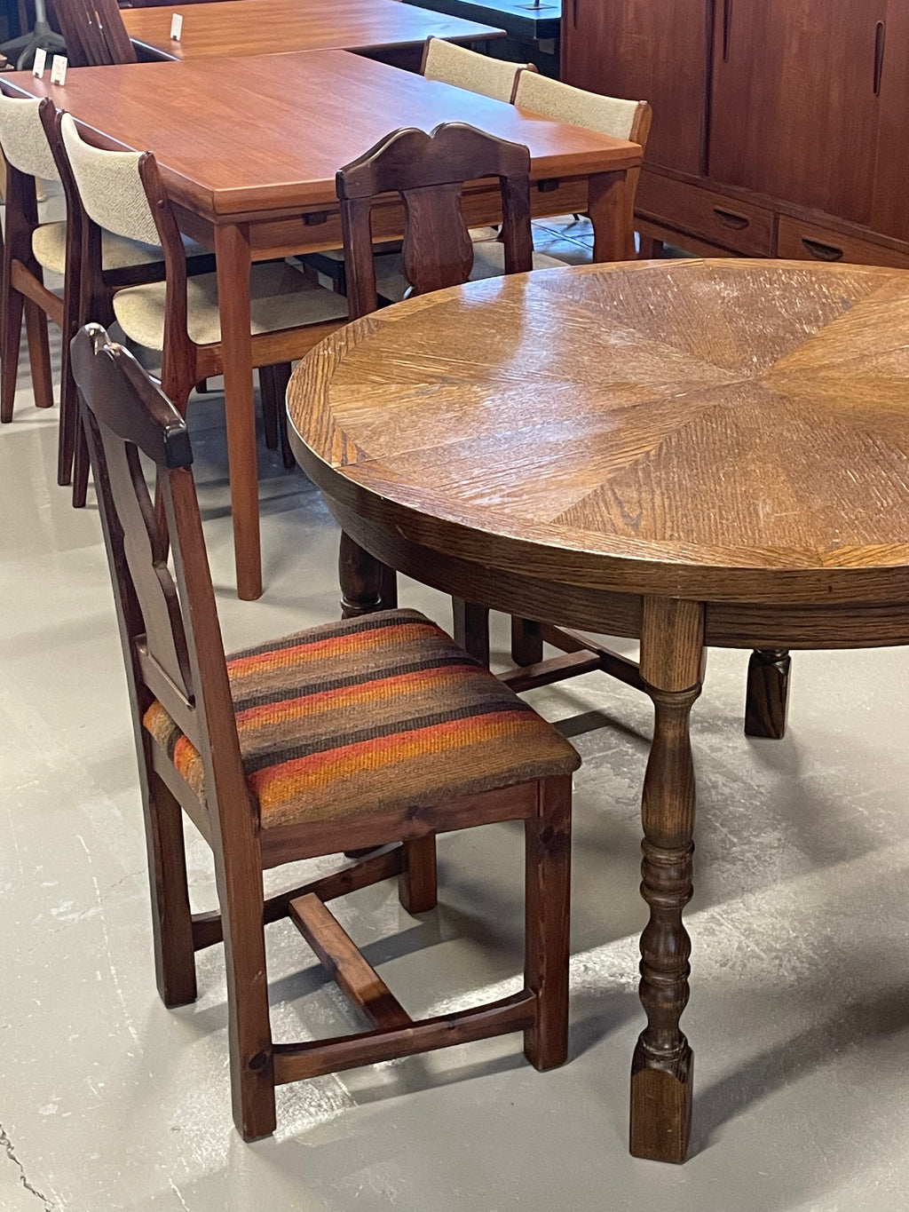 中心から放射状に美しく貼り合わせられたオーク材の木目と、クラシカルな脚部が目を惹くヴィンテージ・ラウンドテーブルです。