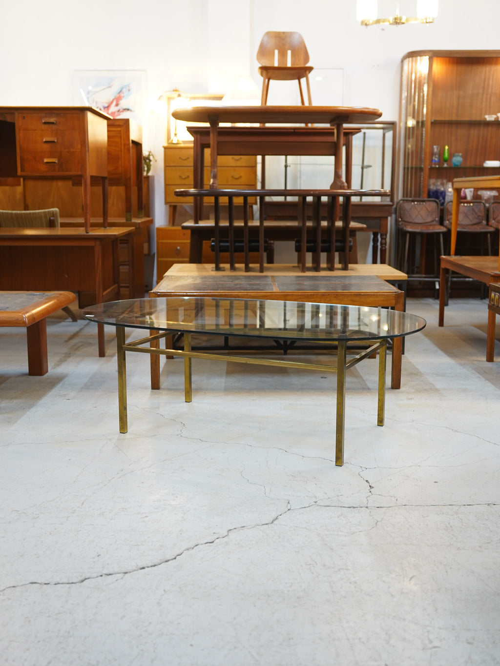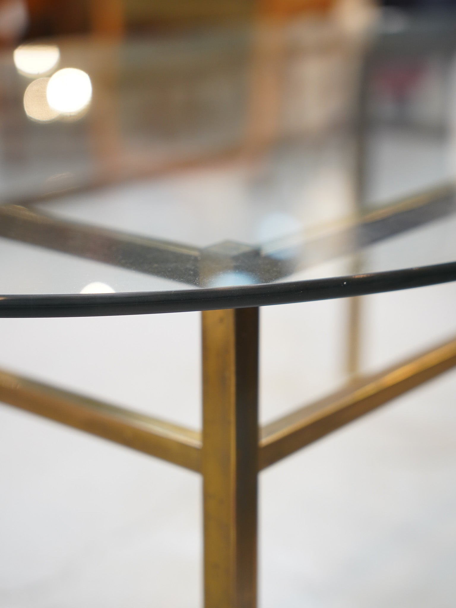 構造の美しさを際立たせるのは、天板を支える直線的なフレームワークです。細身ながらも堅牢な金属製のフレームは、ミニマルな幾何学的ラインを描き、ガラスの有機的な曲線との見事な対比を見せています。四隅の接合部には機能美を追求した当時の意匠が感じられます。