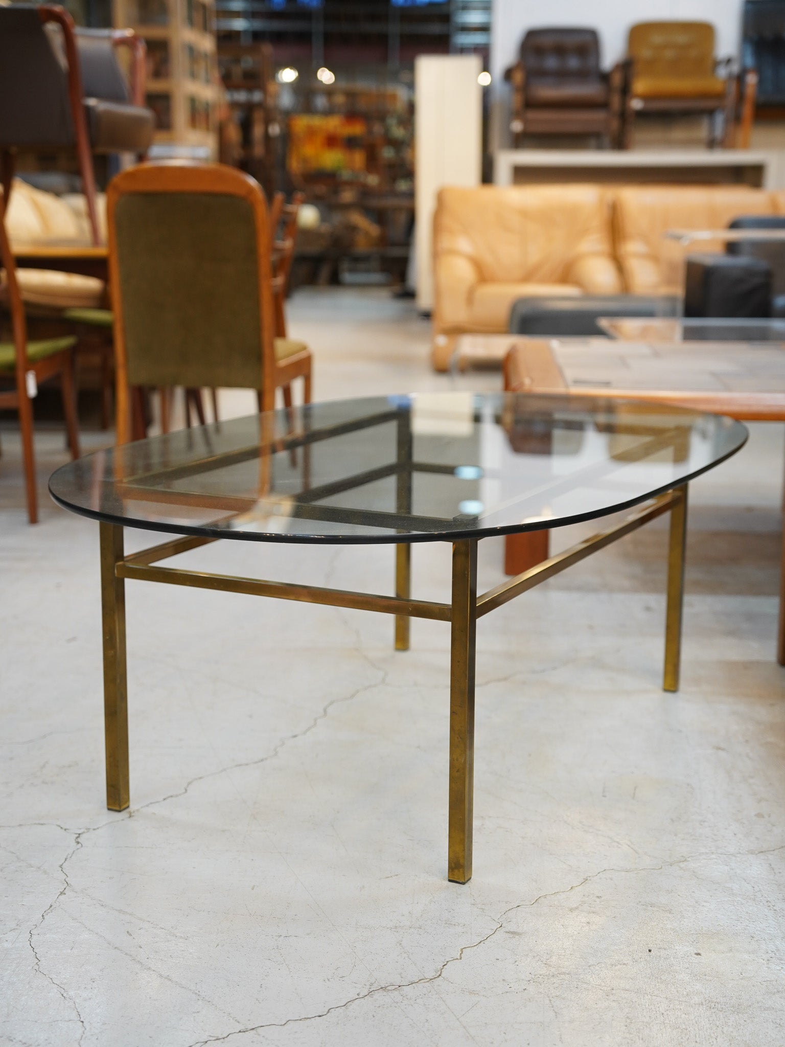 軽快な透過性が魅力のオーバル型ガラス天板に、気品あるゴールドカラーの細身なフレームを合わせた、洗練されたデザインのコーヒーテーブルです。