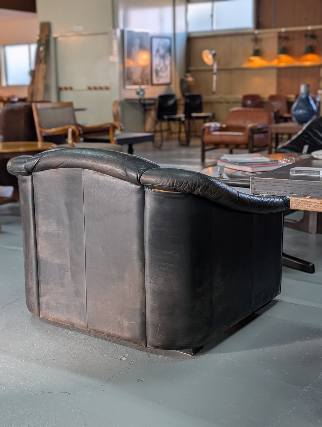 ブラックレザーの無骨な質感が目を惹く1シーターソファ