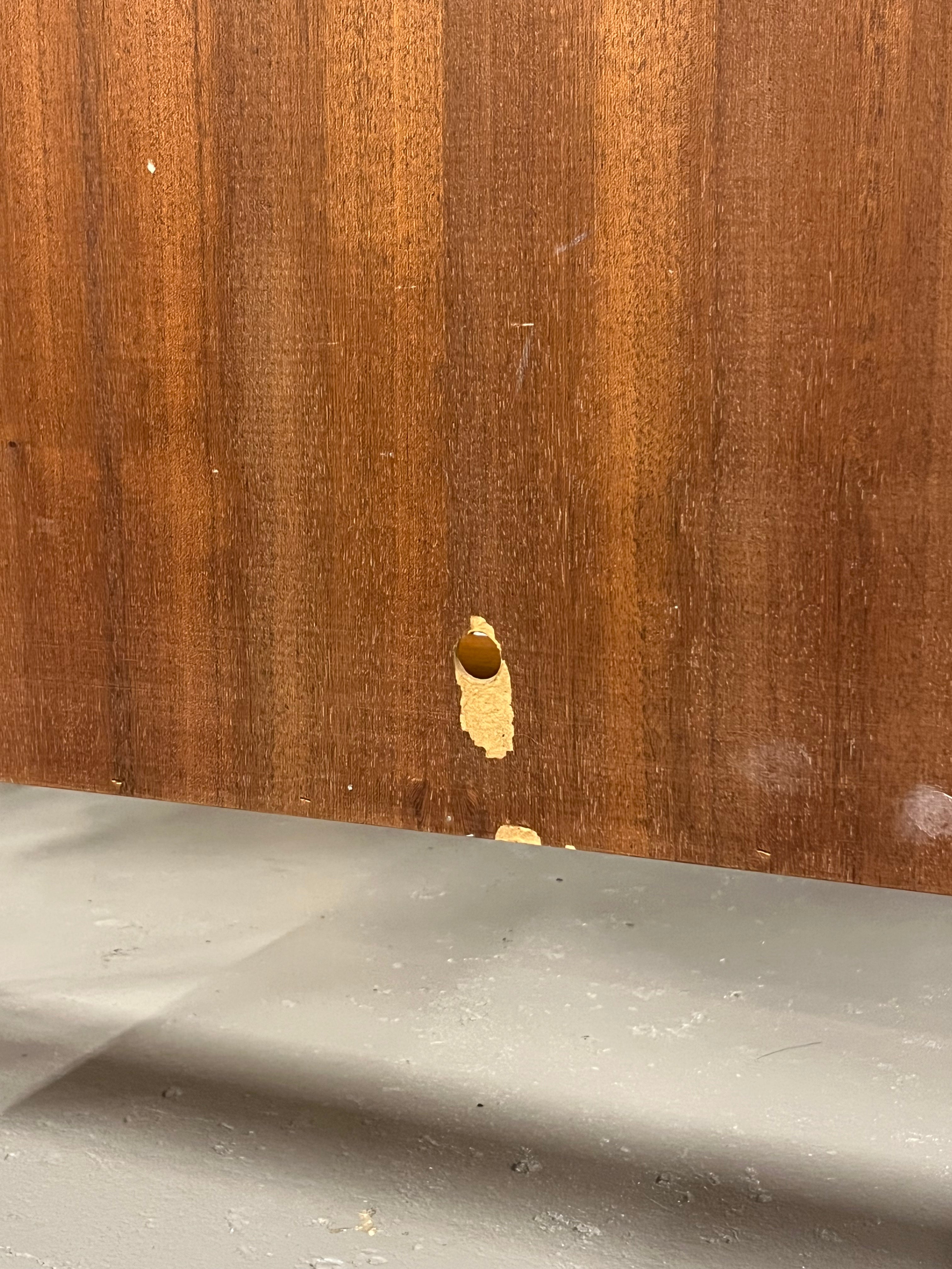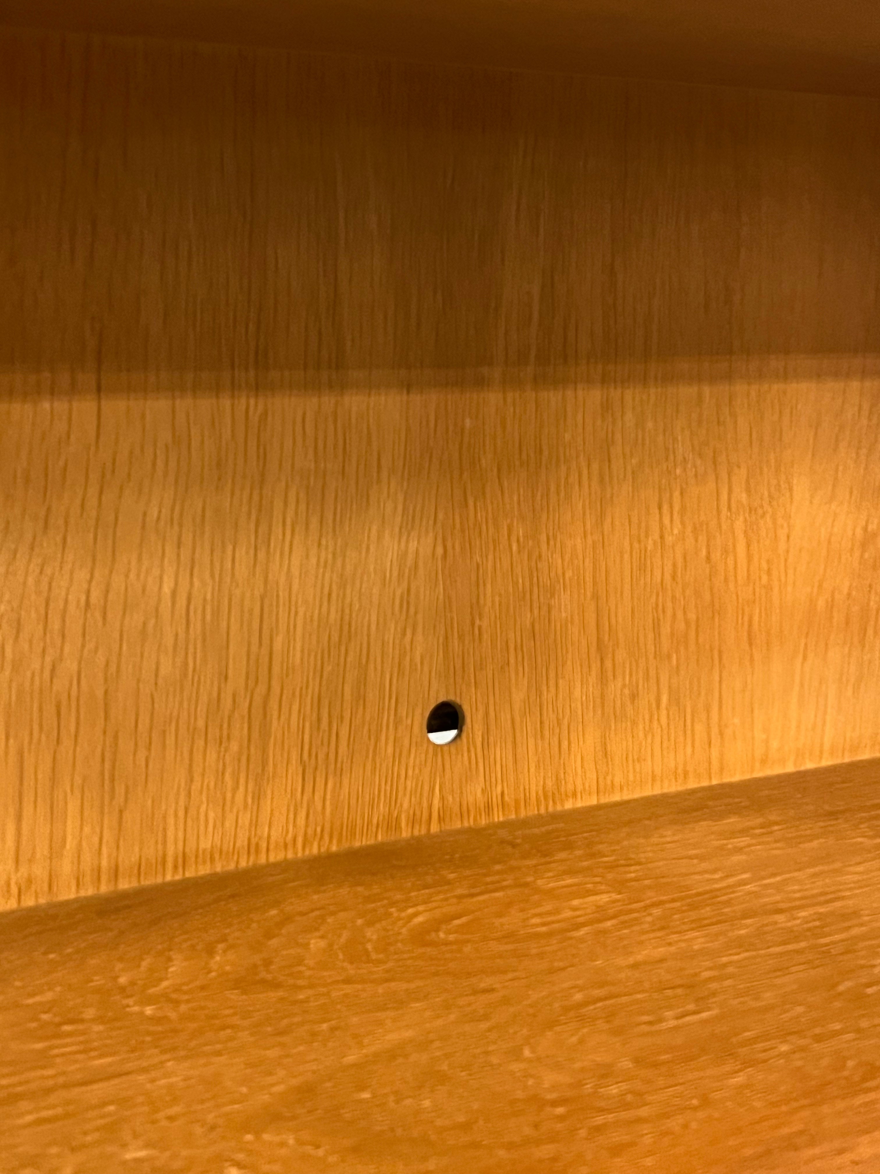 背板には丸い配線穴が設けられており、小型のオーディオ機器やテーブルランプを置いたり、スマートフォンの充電スペースとして使ったりと、現代のライフスタイルにも大変実用的です。