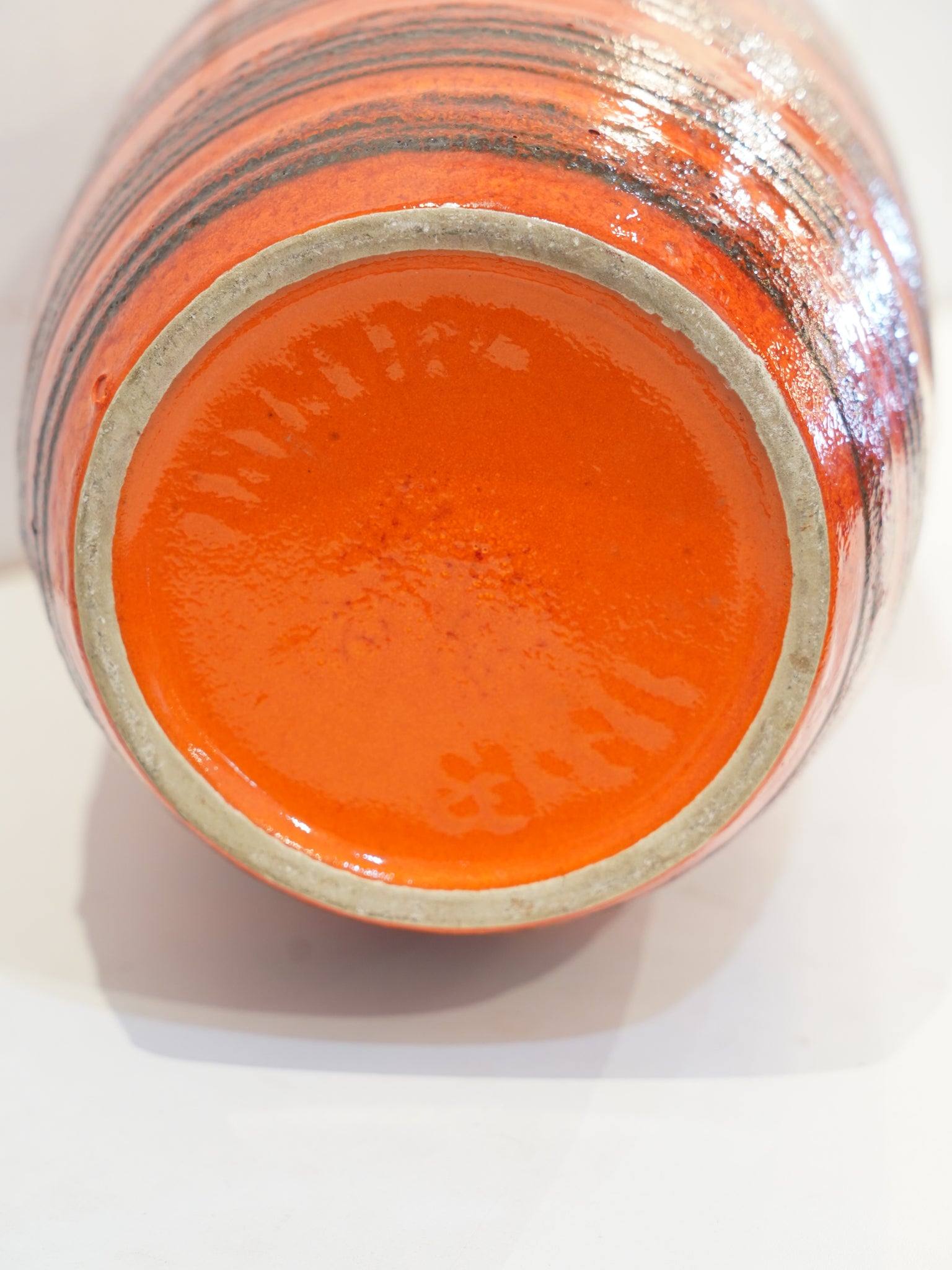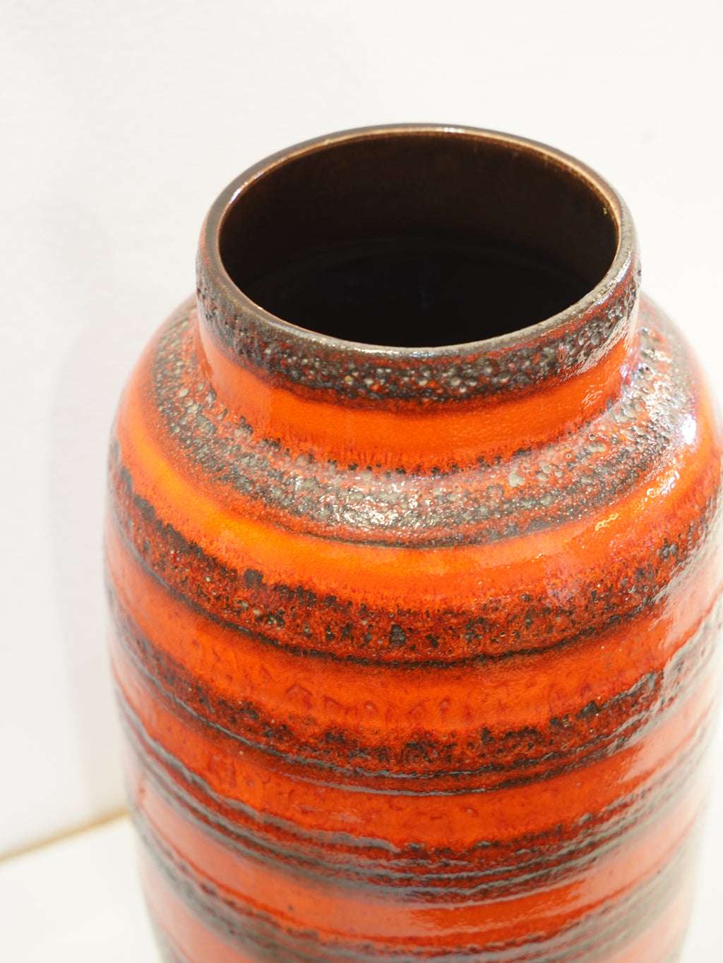 目を奪われるほど鮮やかなオレンジの釉薬に、ダークブラウンのボーダー柄が力強いアクセントを加える1960〜70年代の西ドイツ製ヴィンテージベース。ミッドセンチュリー期特有のエネルギッシュな配色は、空間に一つ置くだけで劇的なモダン・アクセントをもたらし、インテリアの主役として圧倒的な存在感を放ちます。