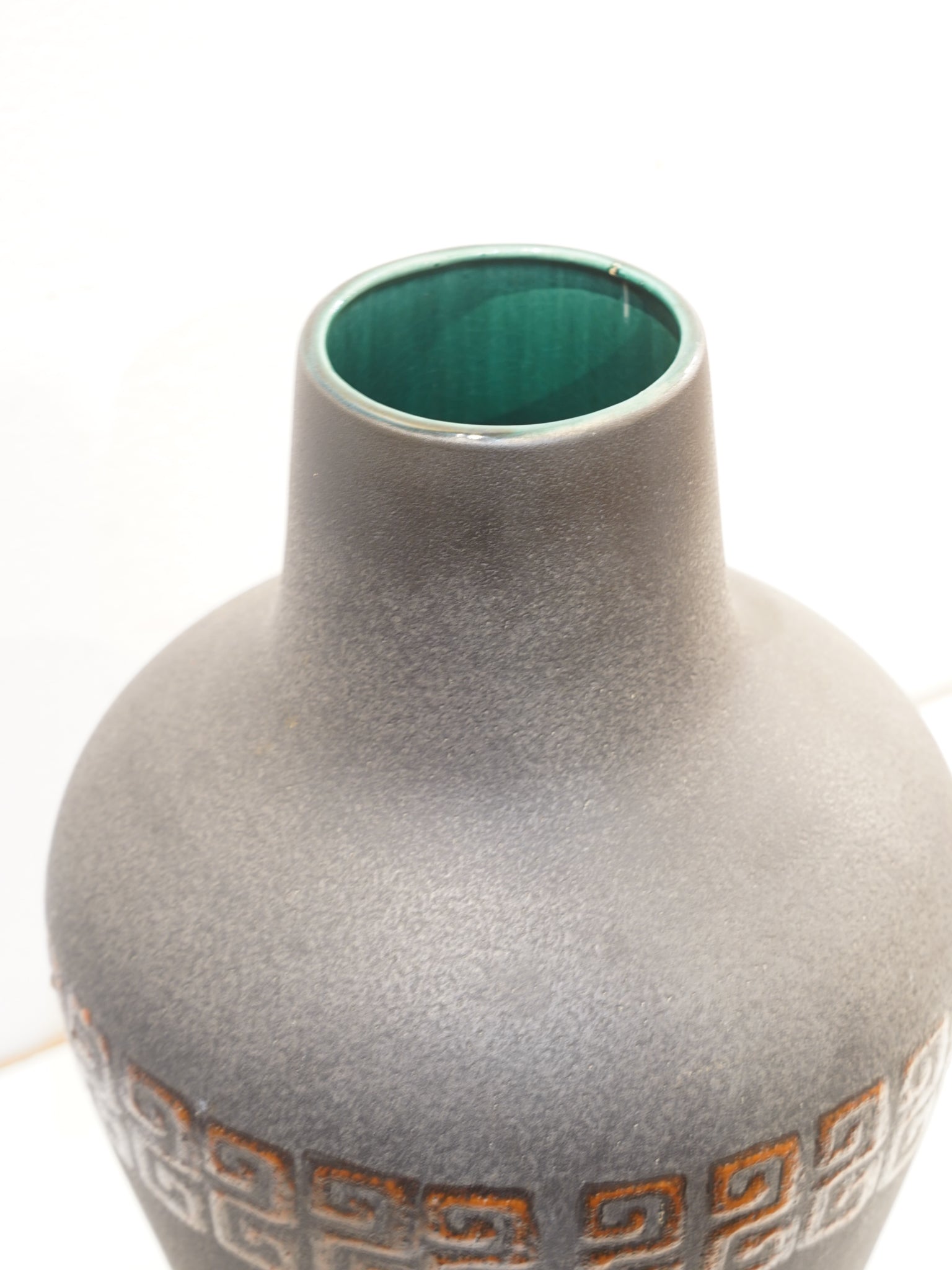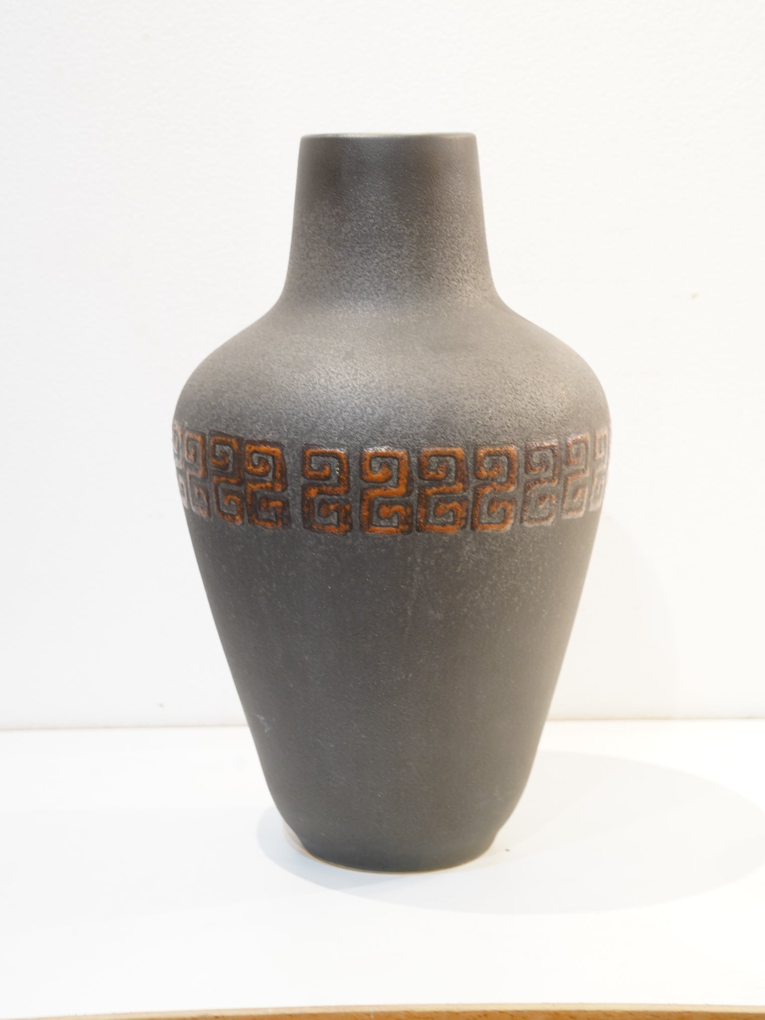マットでざらつきのあるチャコールグレーの質感が、静寂でありながらも力強い存在感を放つ西ドイツ製(WGP)のヴィンテージ陶器。中央をぐるりと囲むように刻まれた雷文(メアンダー)のような幾何学模様には、艶やかなオレンジブラウンの釉薬が施され、ストイックなダークトーンのボディに鮮やかなコントラストを生み出しています。さらに内側にはハッとするようなエメラルドグリーンの釉薬が隠されており、1960〜70年代特有の洗練された色彩感覚と遊び心が感じられます。