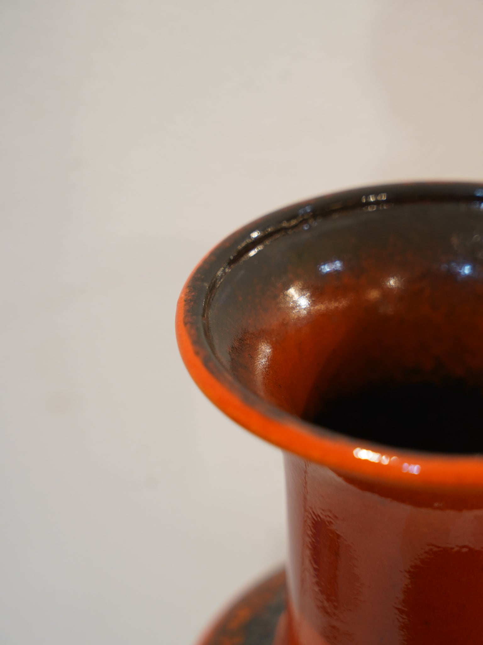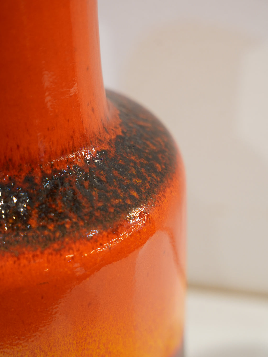 鮮やかなオレンジの釉薬が口縁から裾にかけて深みを増し、艶やかなダークブラウンから黒地へと流れ落ちるように変化します。その境界には黒く発泡した泡状の釉薬が溶け込み、まるで溶岩が固まりながら滴ったかのような表情を見せます。視線を奪う鮮烈な色彩でありながら、相反する陰影のある質感が、空間に深い奥行きと落ち着きを与えます。