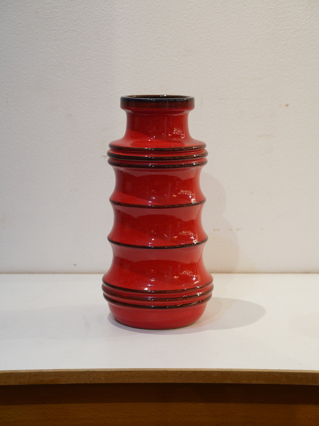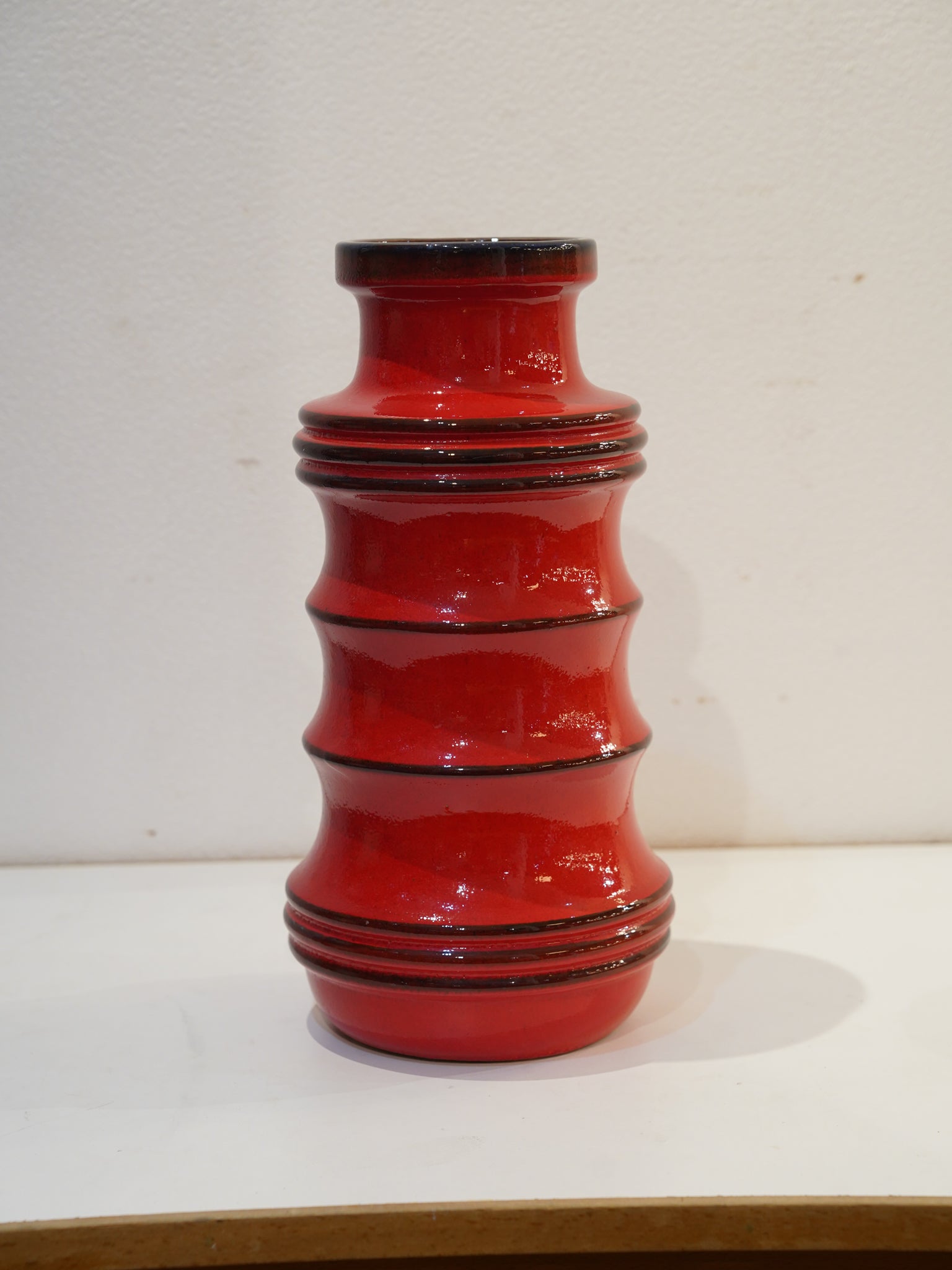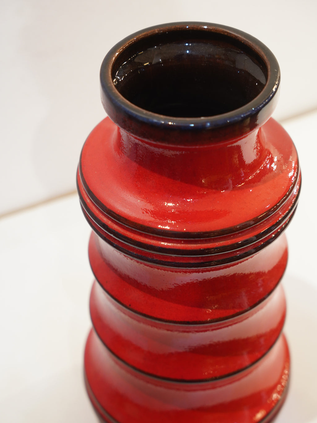 底面の刻印「266-40」が示す通り、西ドイツ最大手の名窯Scheurichが手掛けた、高さ約40cmの特大モデルです。建築的な連続性を持つリズミカルなシルエットは、見る角度や光の当たり方によって美しい陰影を生み出します。内側や口縁には深みのあるダークトーンの釉薬がしっかりと掛けられており、外側の赤をより一層際立たせる見事なコントラストに、職人の細やかな美意識が伺えます。