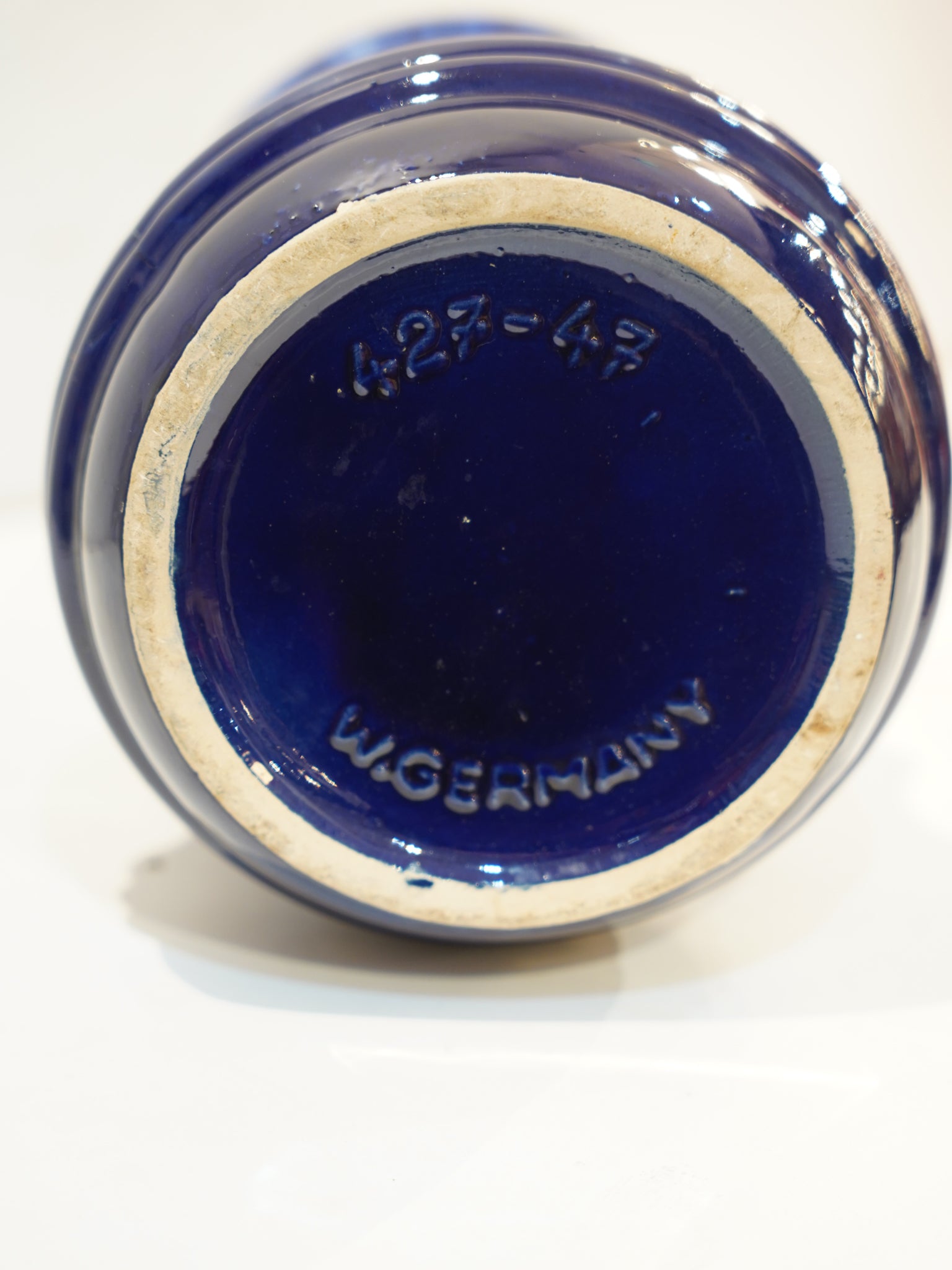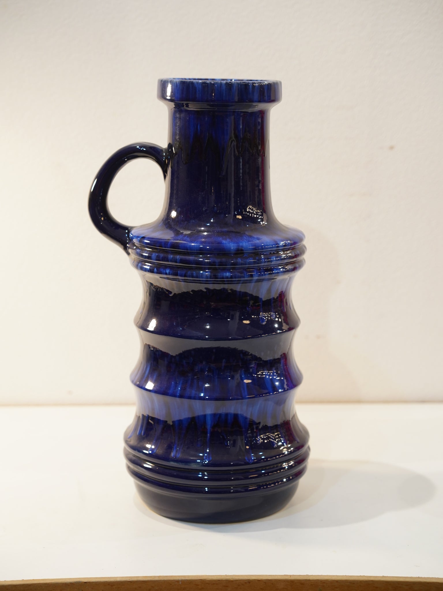 底面の刻印「427-47」が示す通り、名窯Scheurichが手掛けた、高さ約47cmを誇る最大級の特大モデルです。どっしりとした重厚なボディに、優美な曲線を描くハンドルを備えたジャグ型のフォルムは、この時代のデザインの到達点とも言える完成度。厚く重厚に掛けられた釉薬の光沢と、建築的な構造美が、半世紀の時を経てもなおモダンで新鮮な印象を与えます。