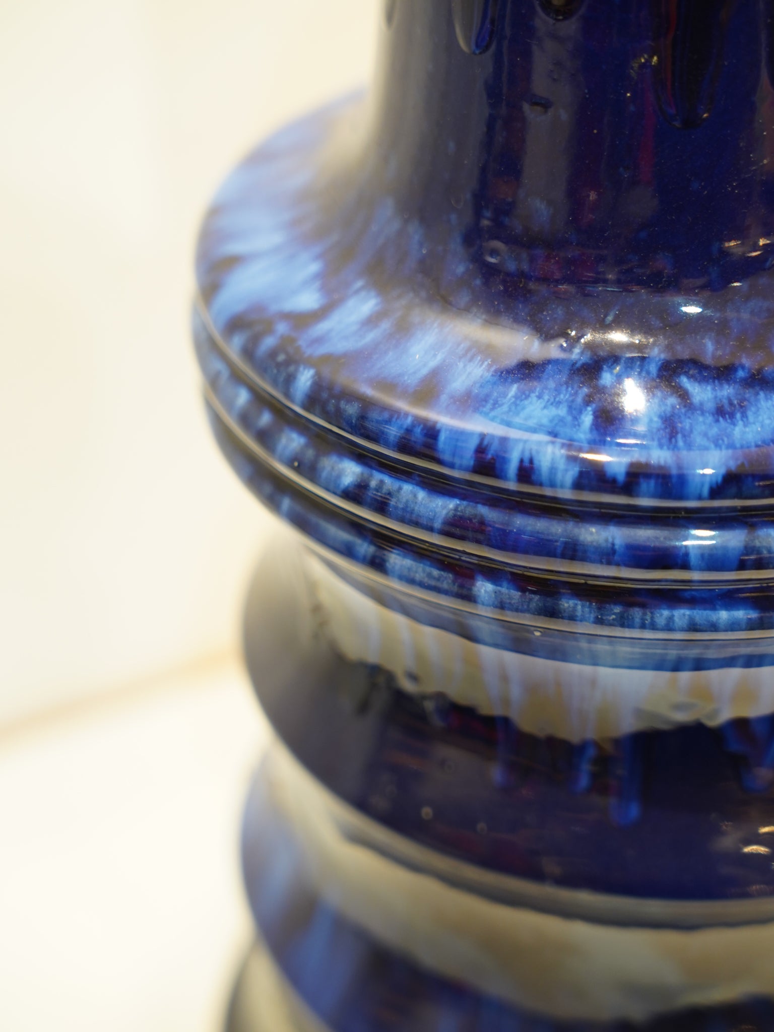 最大の特徴は、連続するフープを伝い、明るいブルーの釉薬が雨のように滴り落ちる幻想的な表情。1960年代後半から70年代の黄金期に作られたこのモデルは、光を受けるたびに蒼の陰影がドラマチックに変化し、見る者を惹きつける神秘的な魅力を放ちます。