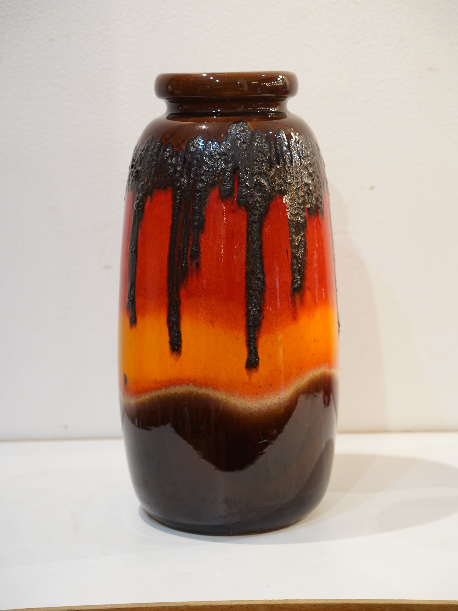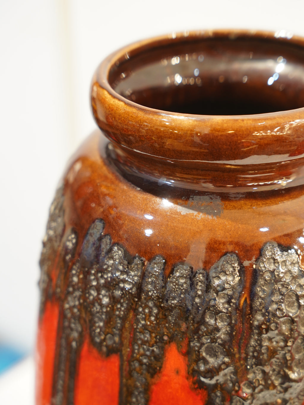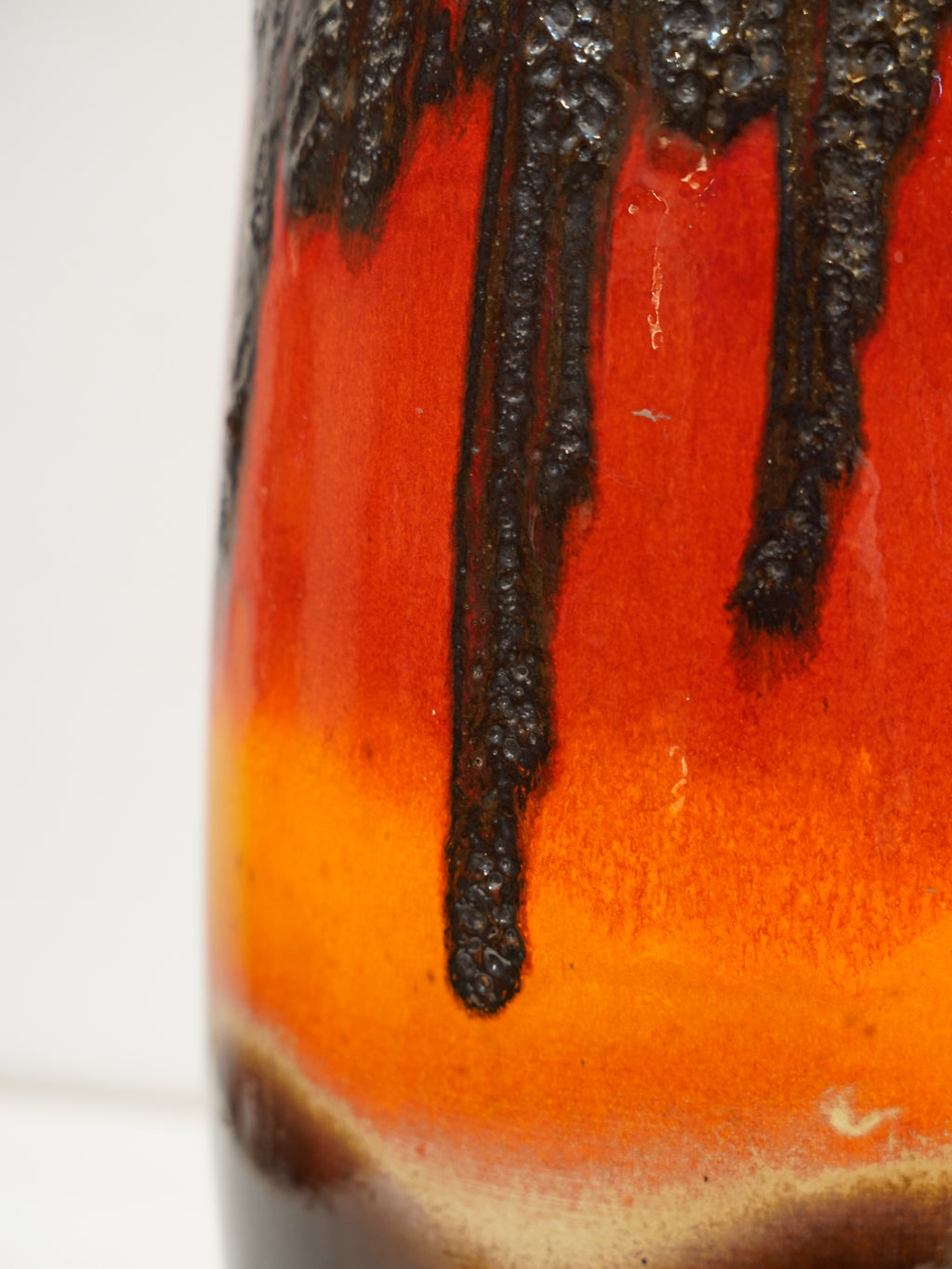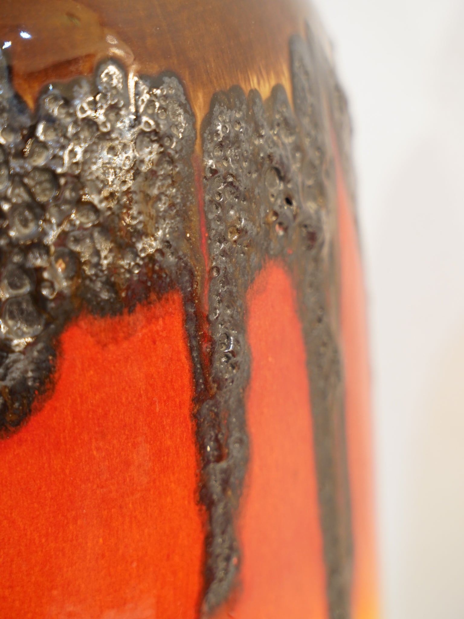 鮮烈なレッドから燃えるようなオレンジへと移り変わるグラデーションの上を、黒くゴツゴツとした発泡釉が溶岩のように滴り落ちる、圧倒的なインパクトのヴィンテージベースです。これぞ「Fat Lava」と呼ぶにふさわしい荒々しくも美しいテクスチャーは、1960年代後半から70年代の西ドイツ陶芸界が持っていた飽くなきエネルギーを象徴しています。一点ごとに異なるドリップの表情が、唯一無二のアートピースとしての価値を際立たせています。