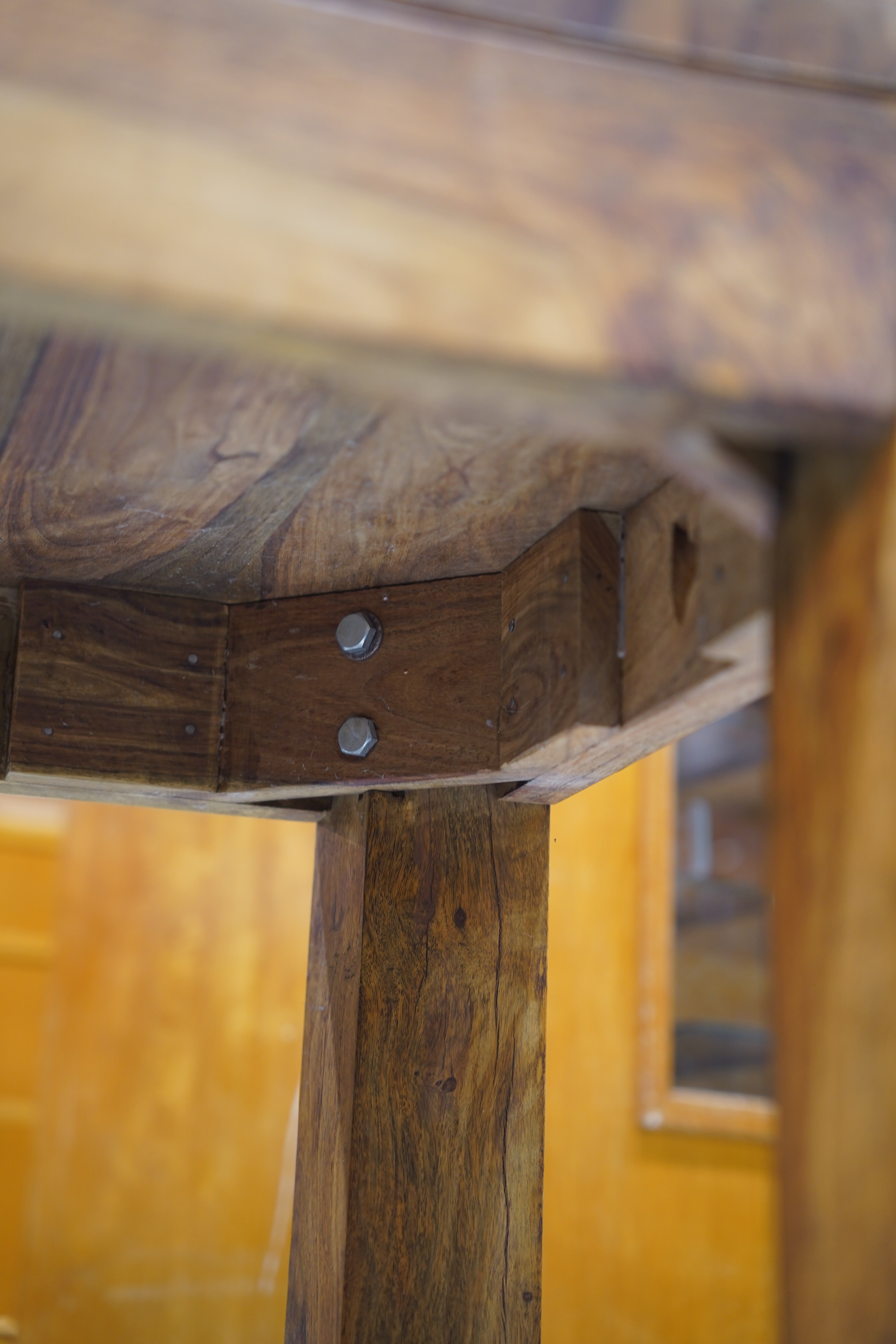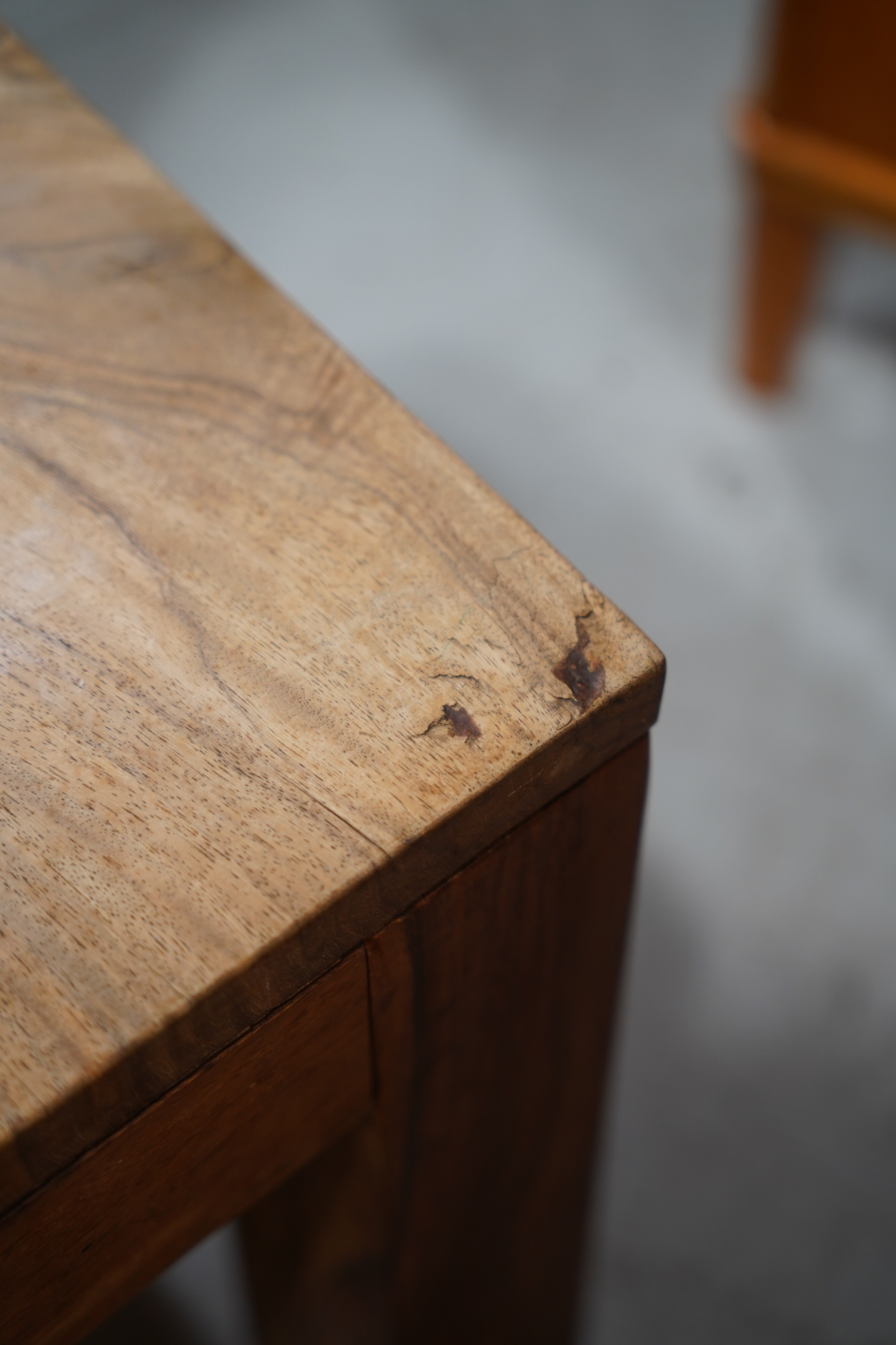 天板や脚部に見られる、オーク材特有の繊細ながらも躍動感のある木肌は、経年によって深みのある飴色へと変化しており、独特な風格を漂わせています。