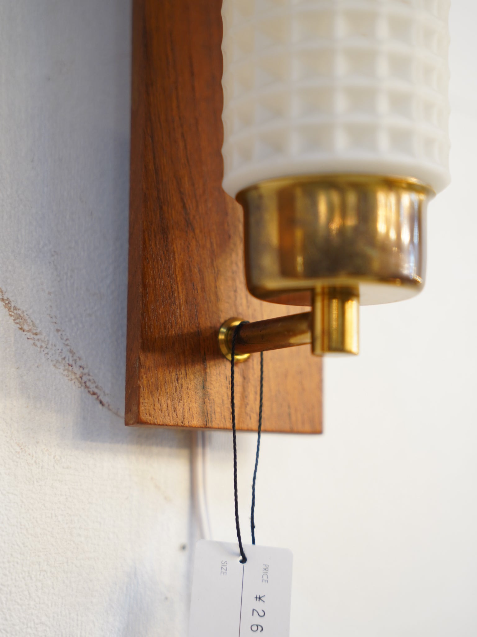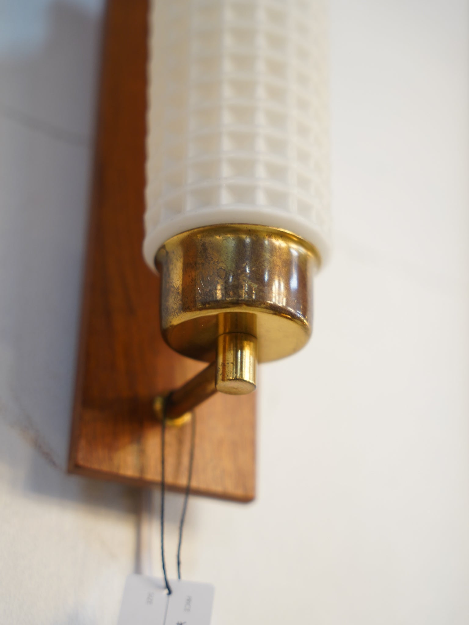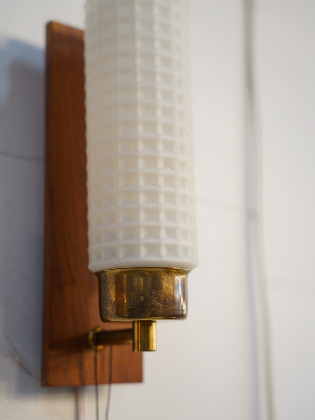 チーク材、真鍮、そして精緻なプレスガラス。1960年代前後の北欧ミッドセンチュリーを象徴する素材が見事に調和した、情緒あふれるウォールランプです。