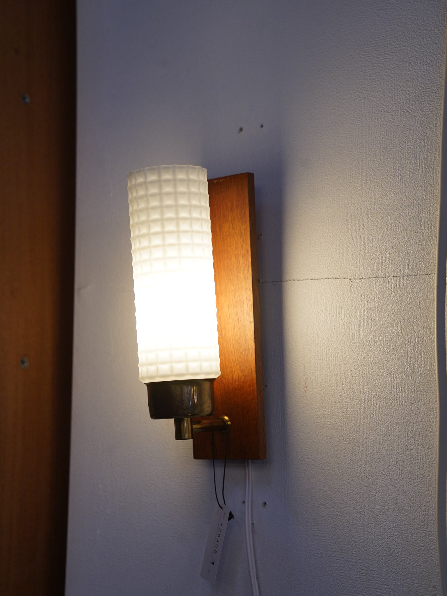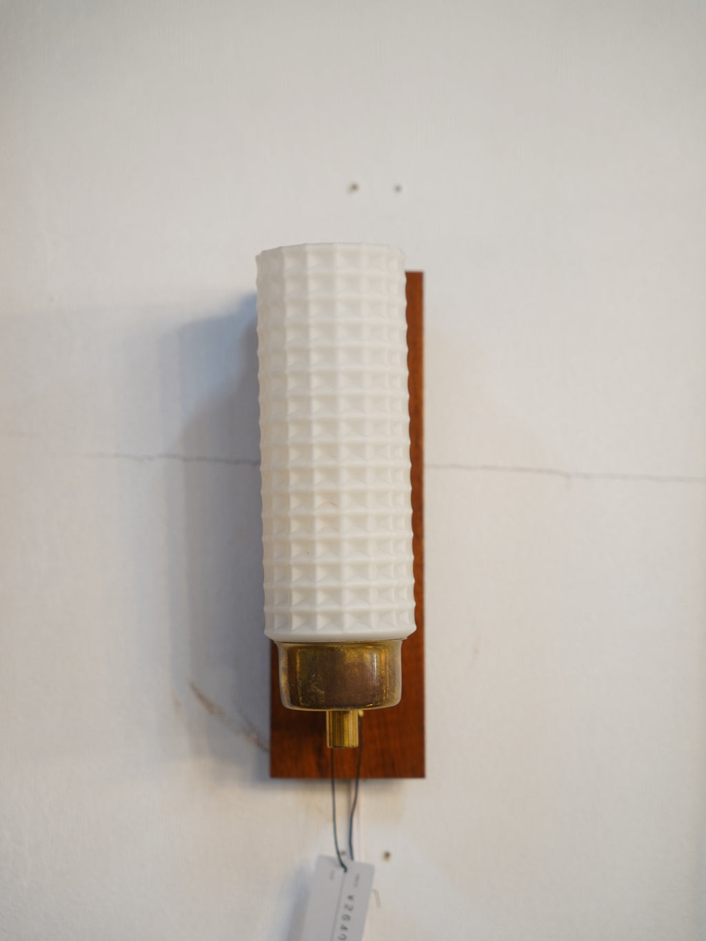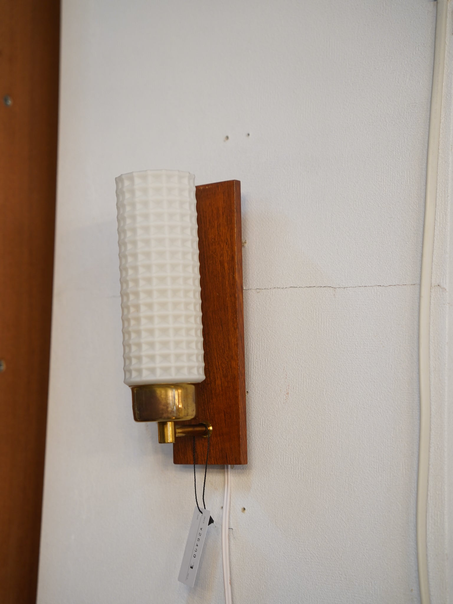 チーク材、真鍮、そして精緻なプレスガラス。1960年代前後の北欧ミッドセンチュリーを象徴する素材が見事に調和した、情緒あふれるウォールランプです。