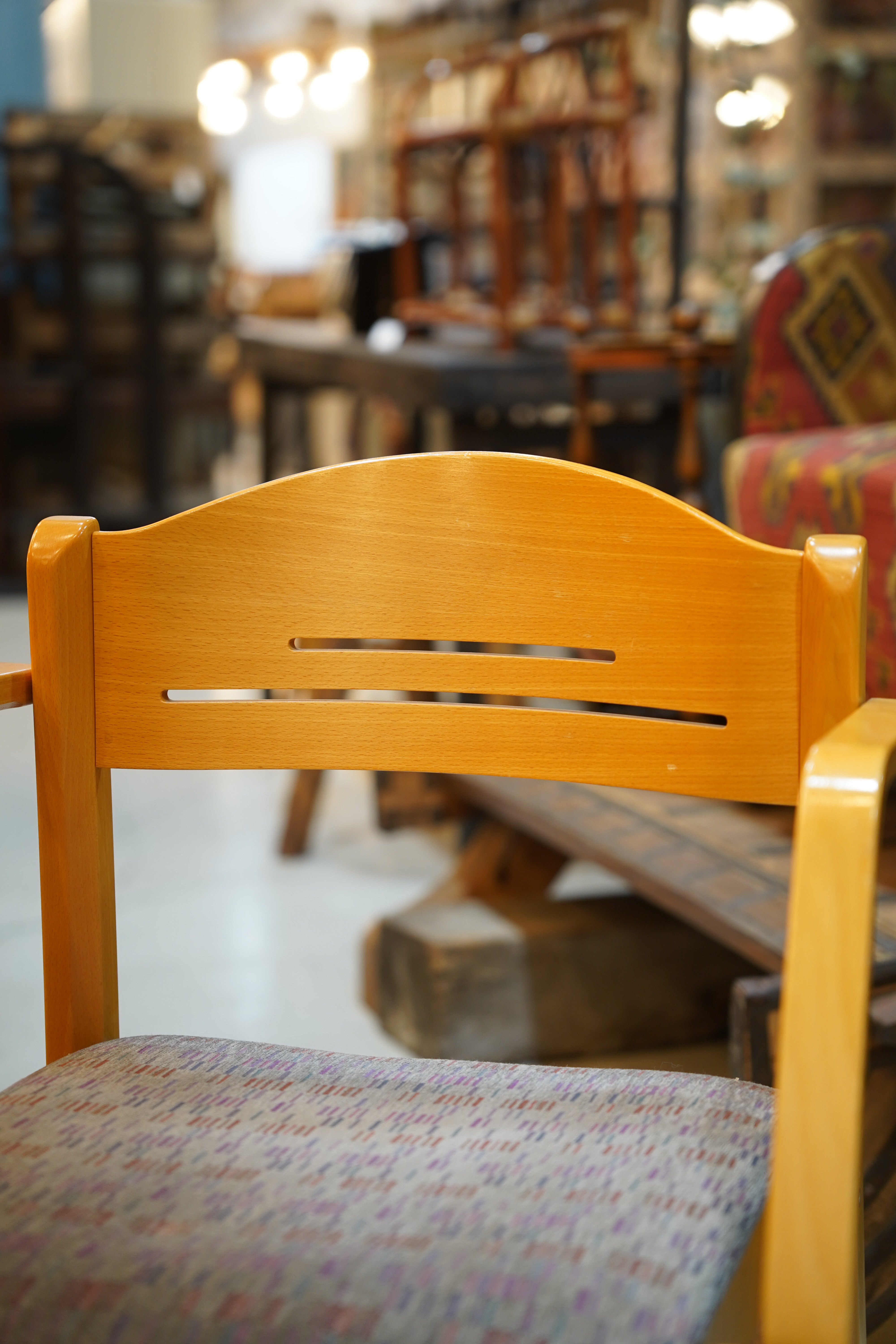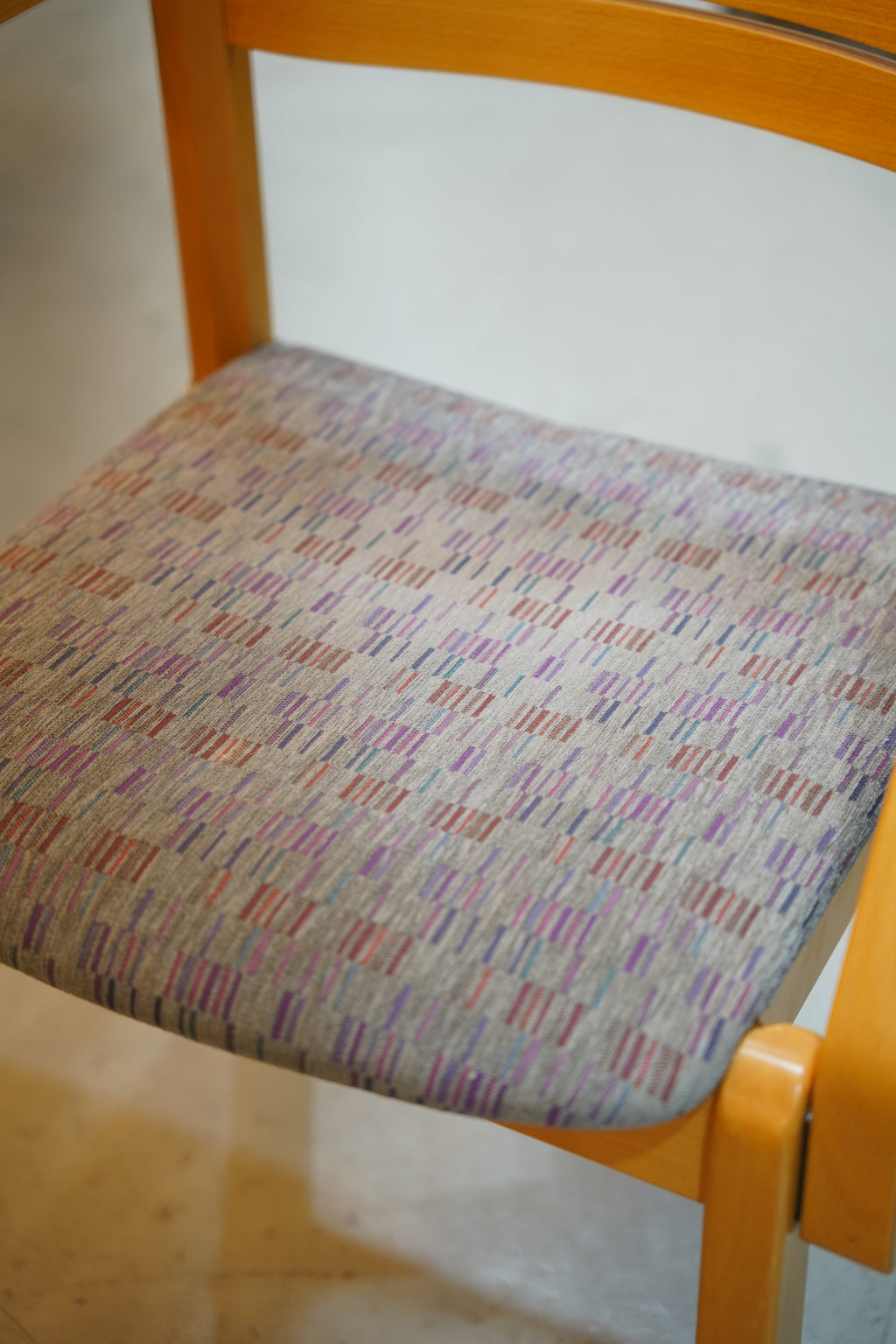 座面には彩り豊かなファブリックが配され、落ち着いた空間に柔らかな華やぎを添えてくれます。