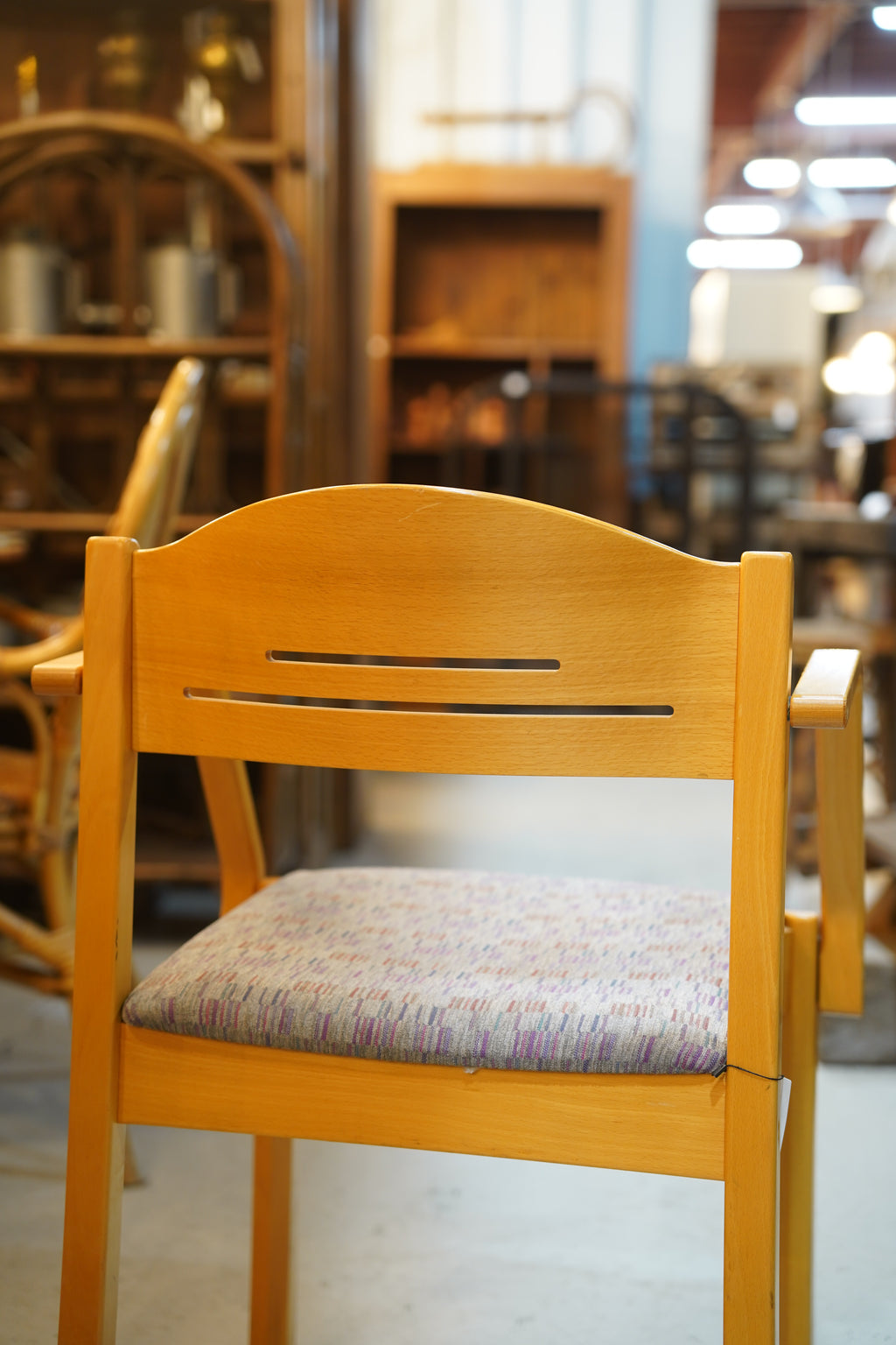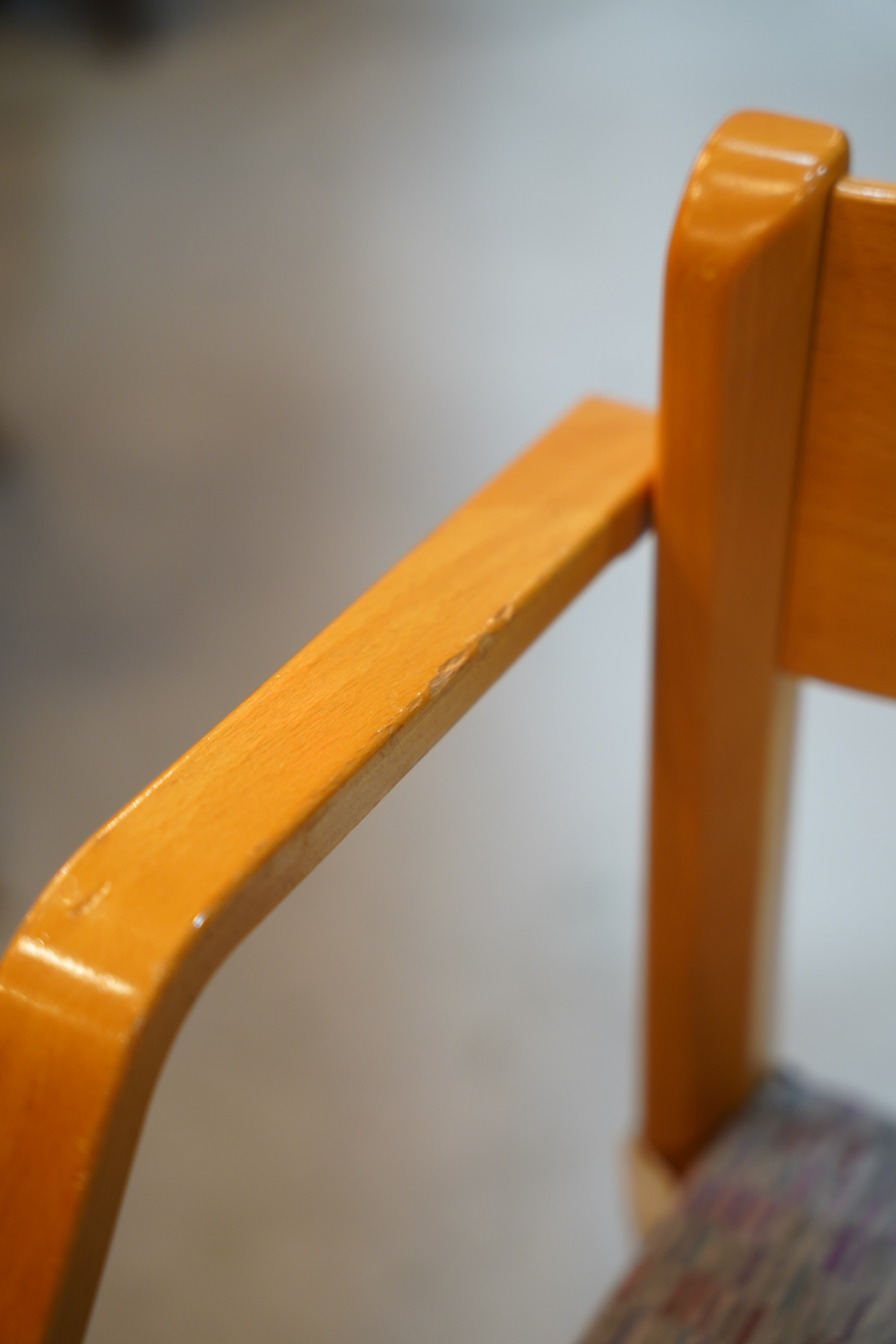 1990年代から2000年代頃に製作されたと推測されるこの一脚は、北欧らしい明るい色調のビーチウッドフレームと、機能性を追求したミニマルな造形が特徴です。
