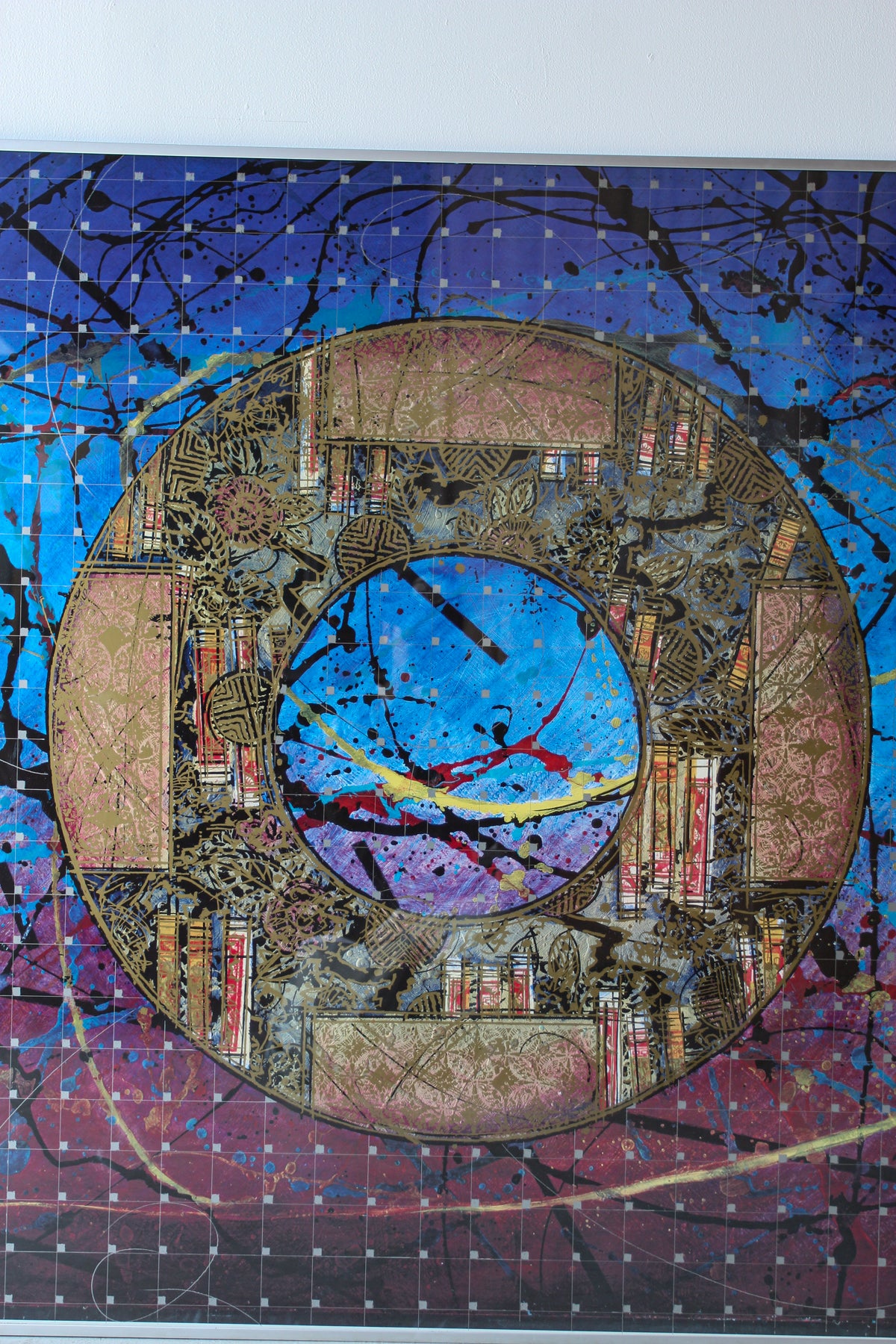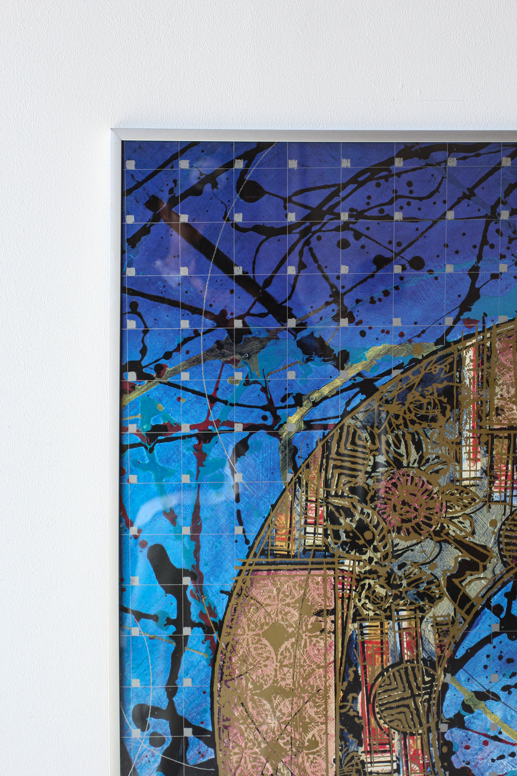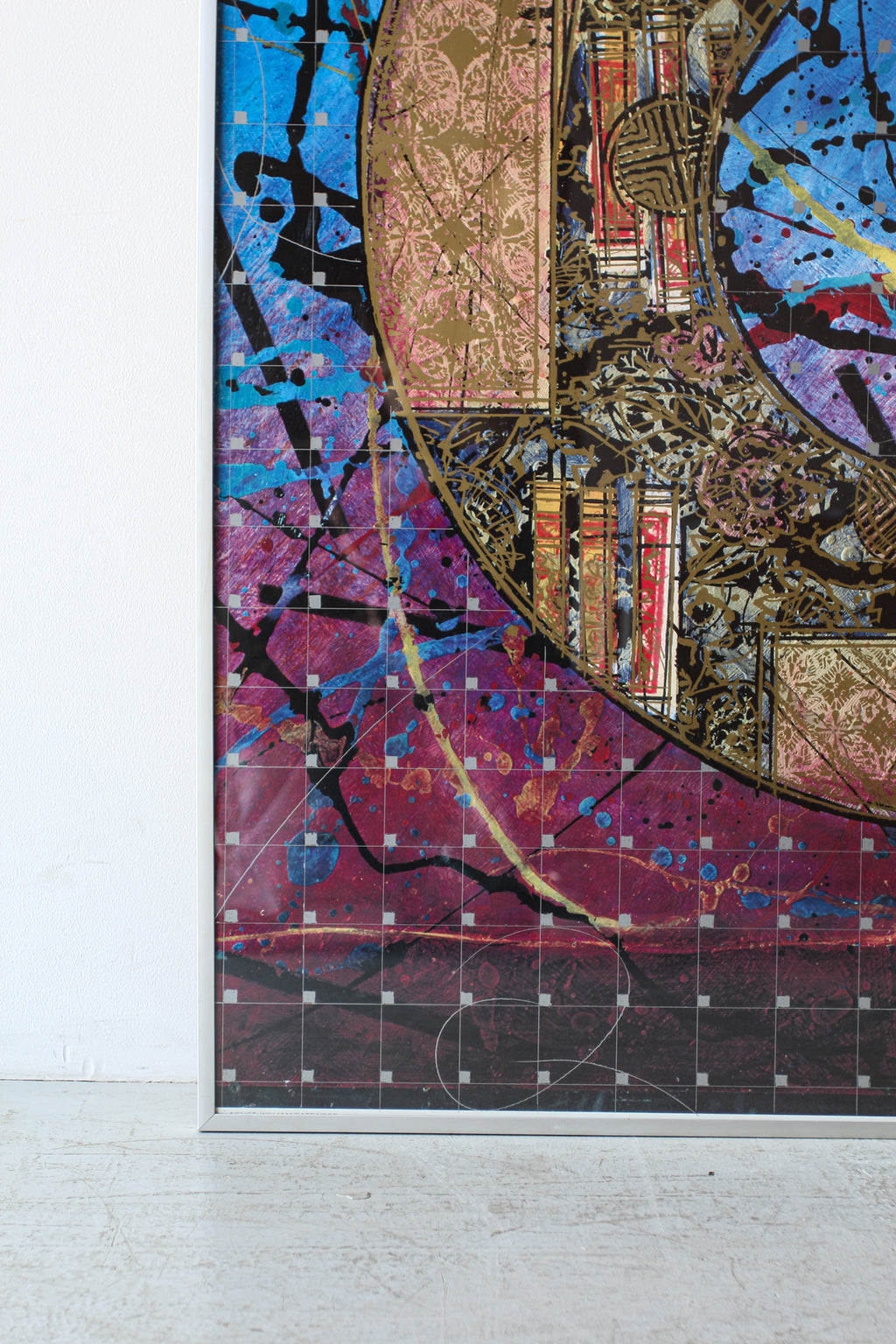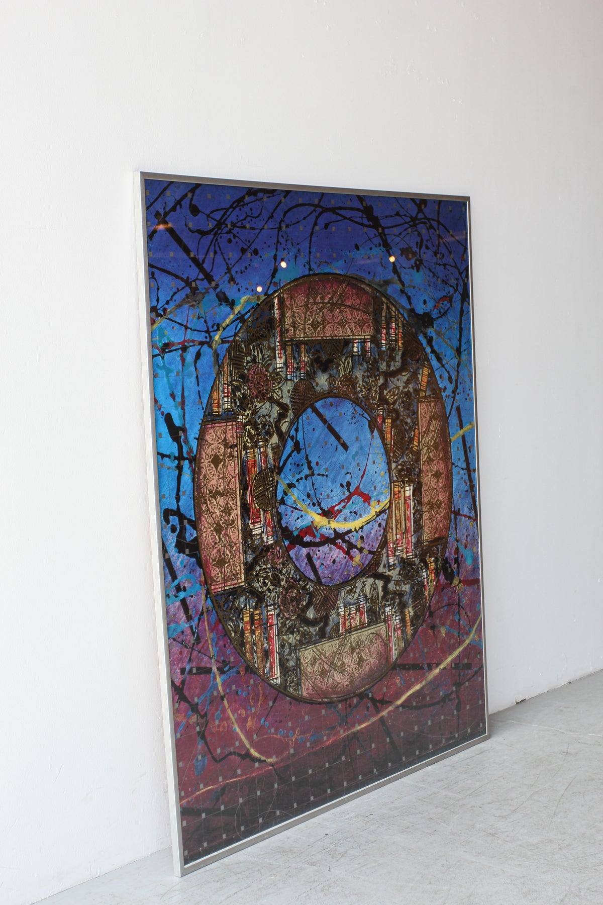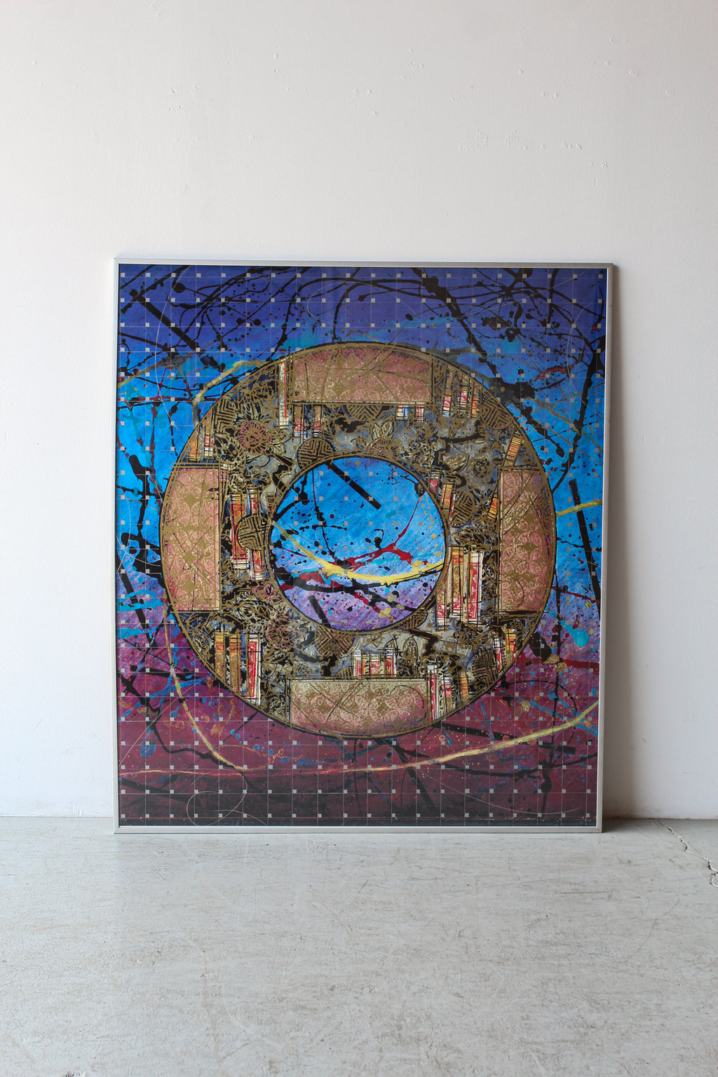 青や紫を基調とした背景に複雑な模様が描かれた独創的なアートのご紹介です。