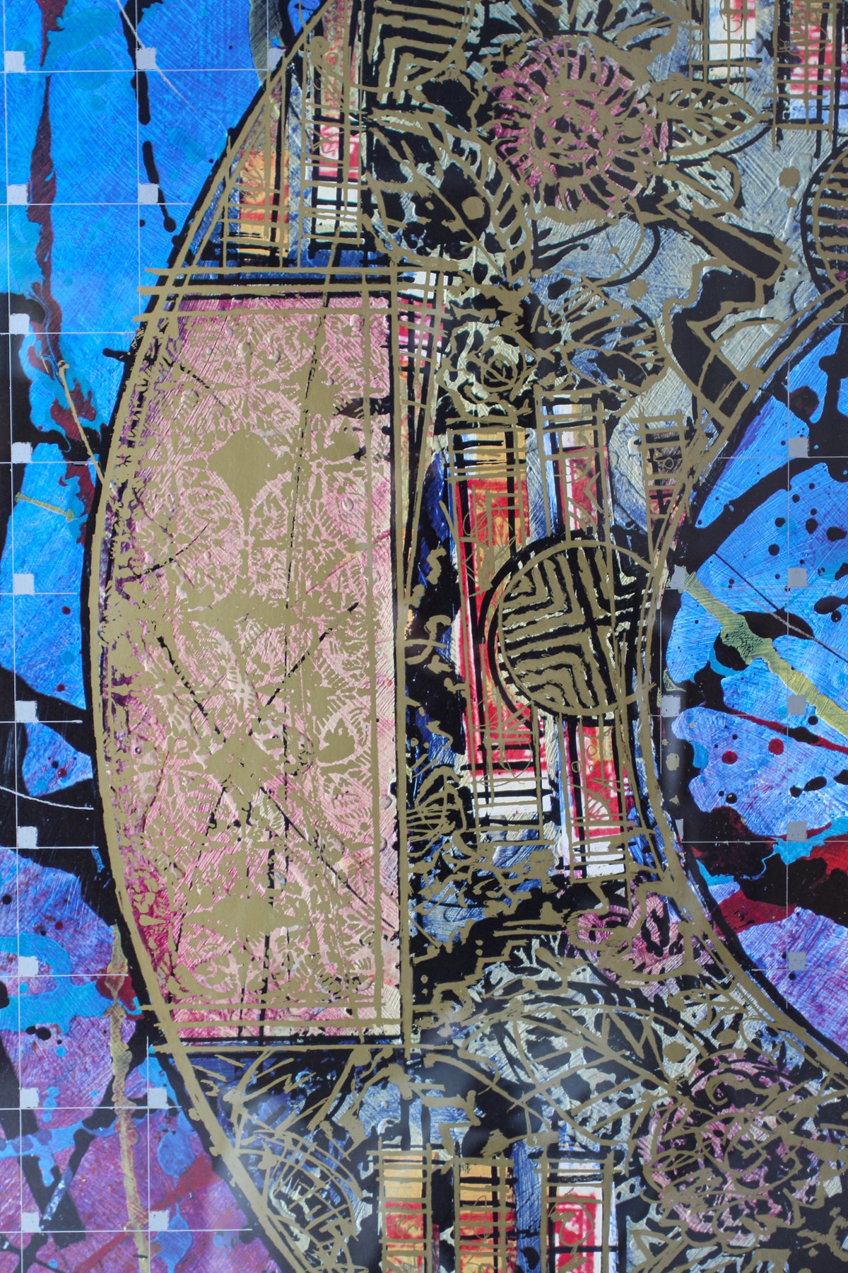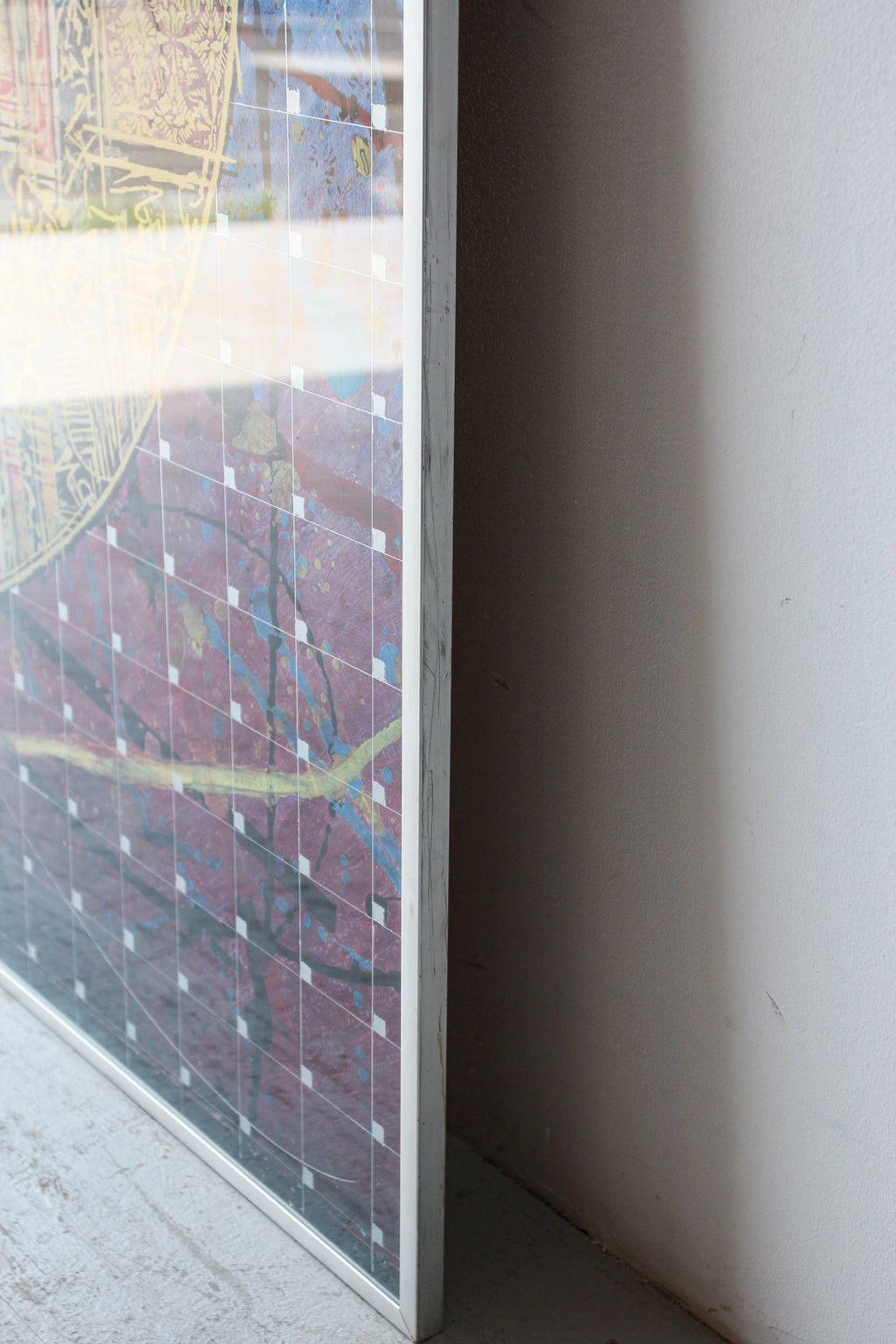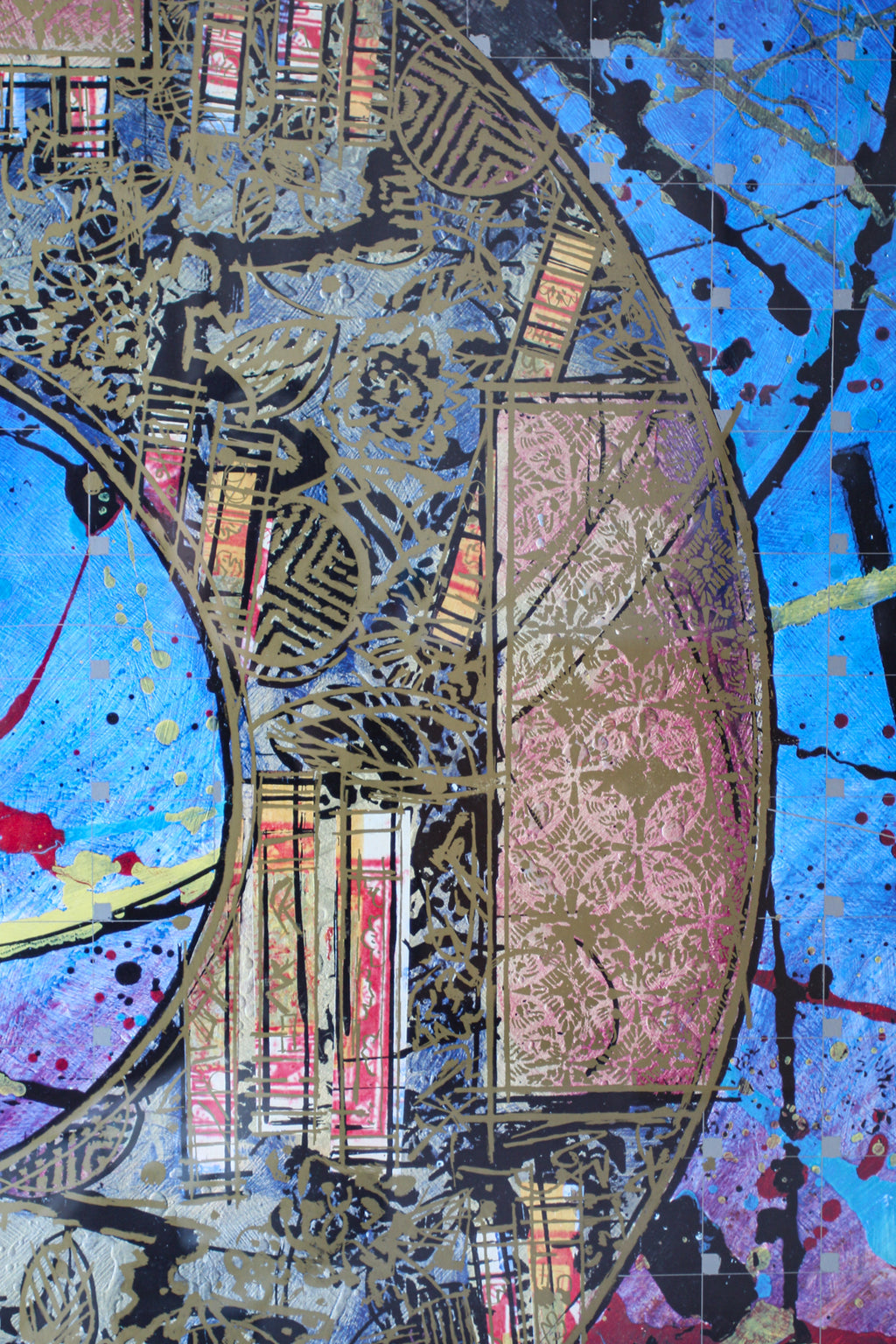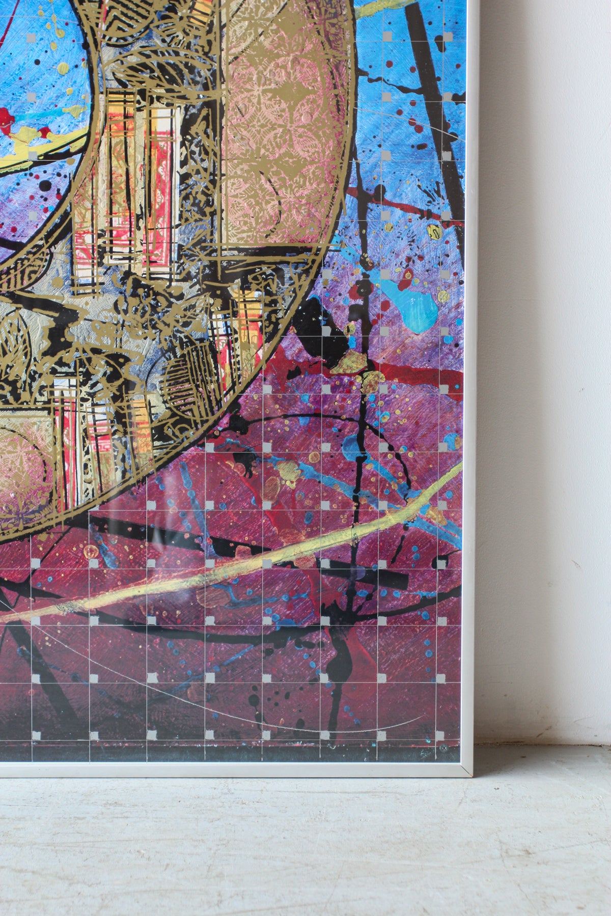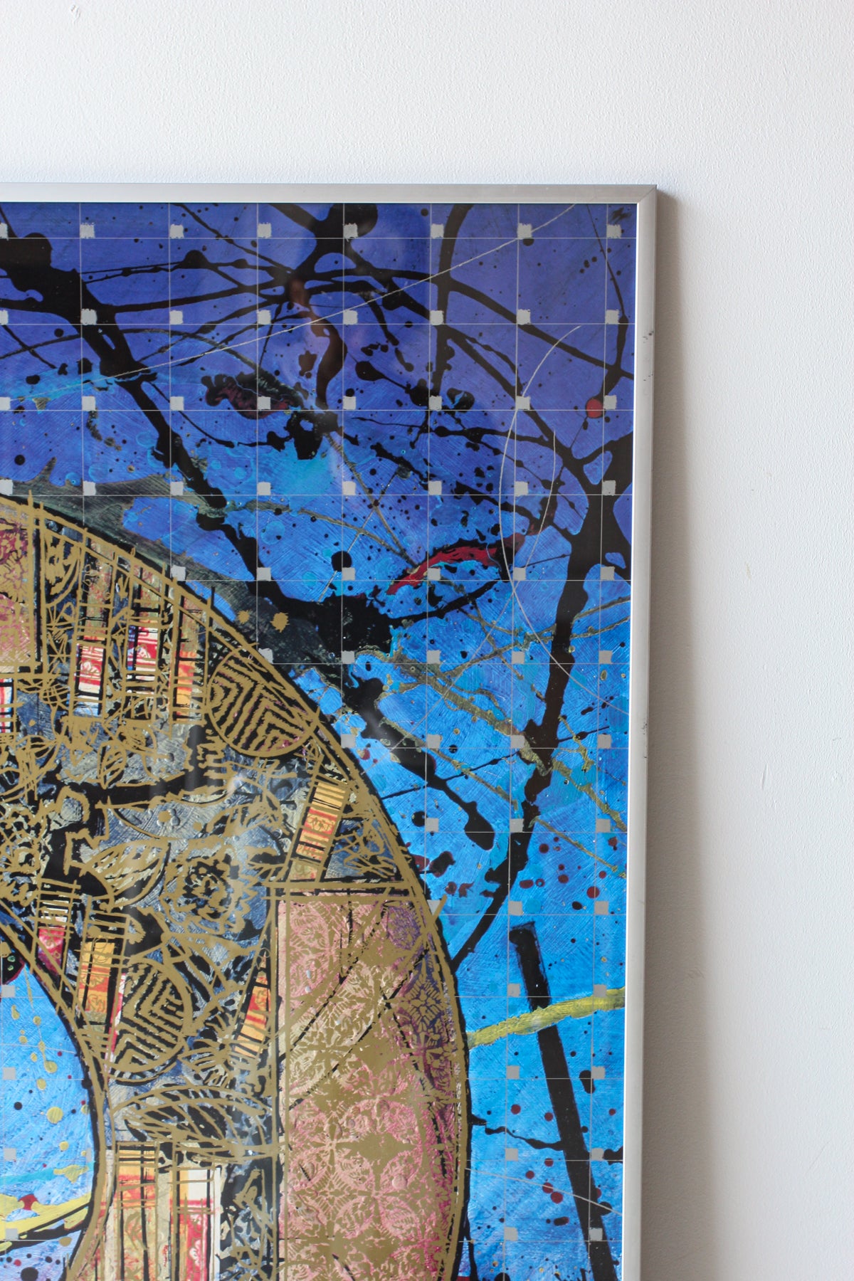 青や紫を基調とした背景に複雑な模様が描かれた独創的なアートのご紹介です。