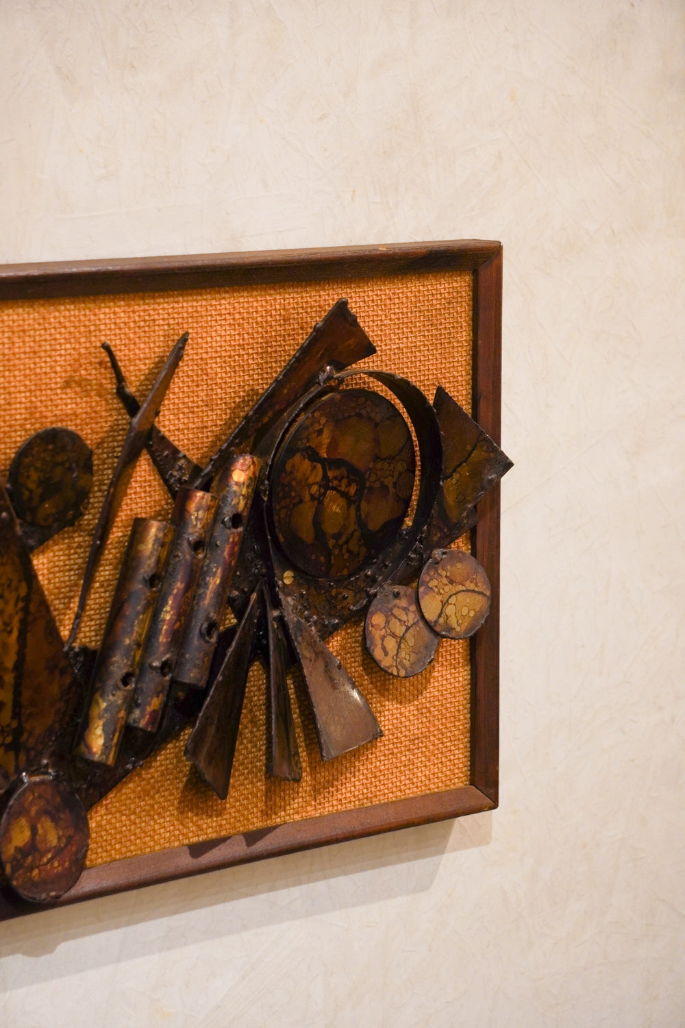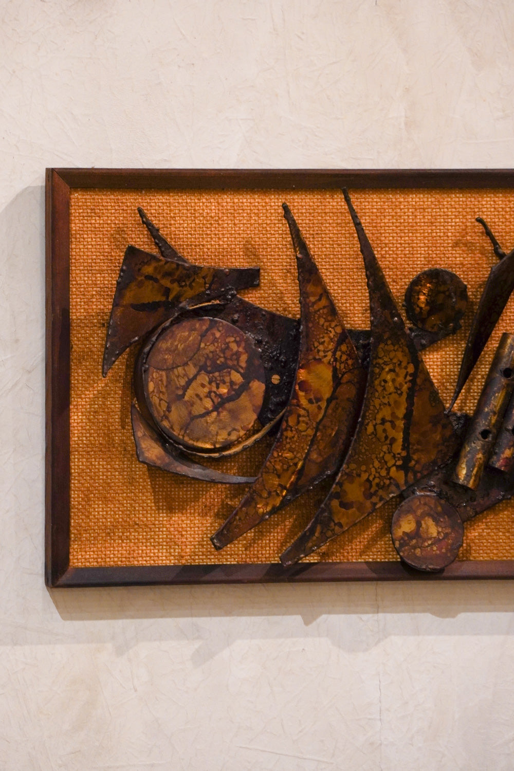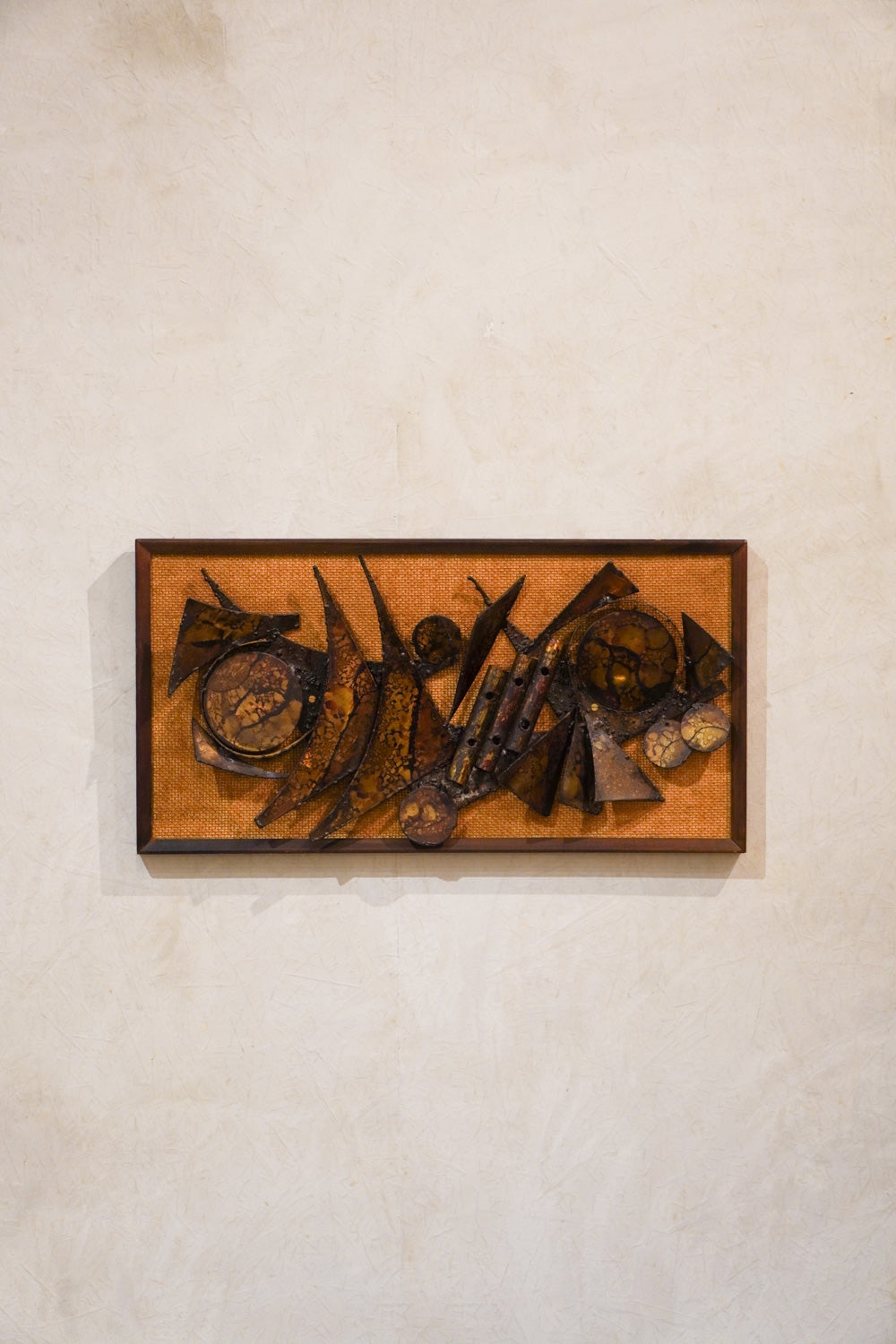抽象的なデザインで、流れるような曲線と鋭い三角形、そして円形のモチーフが組み合わされています。宇宙船や抽象的な機械のようなデザインで動きのある構図です。木製のフレームが温かみのあるテクスチャと金属のクールな質感が対照的で、両方を引き立てています。長方形で、横長の壁のスペースを飾るのに適しています。